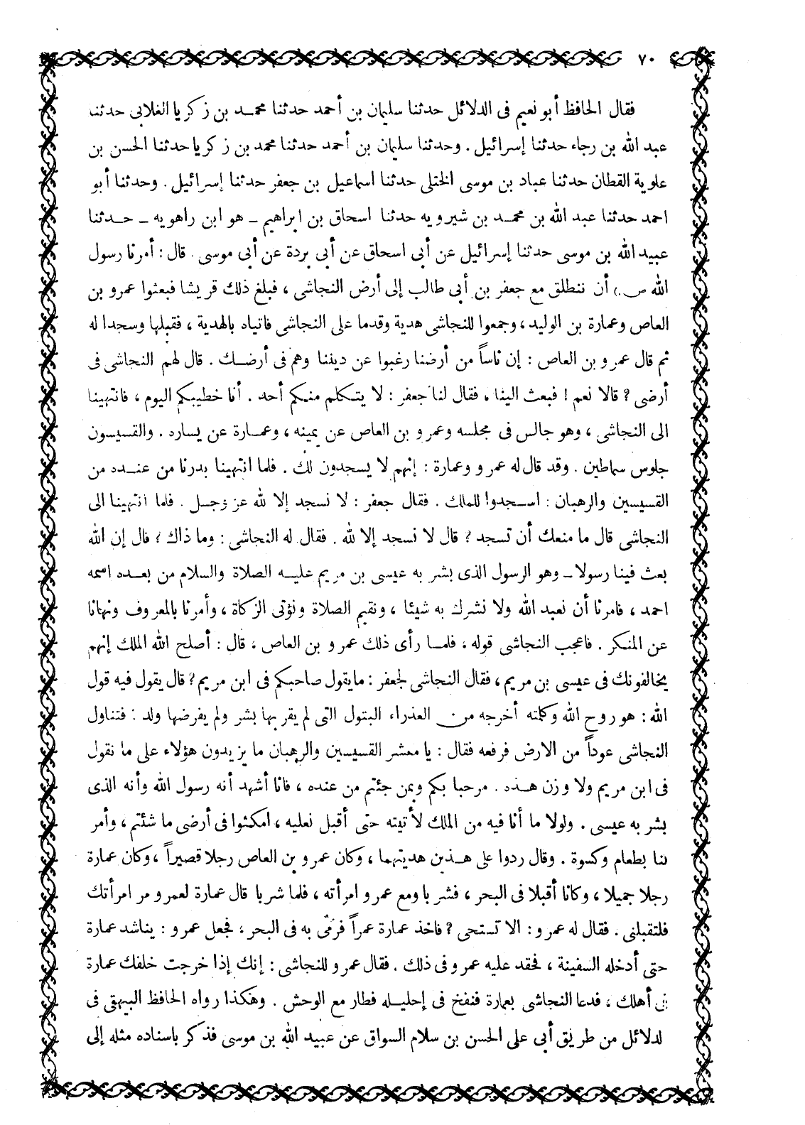 فَقَالَ الْحَافِظُ أَبُو نُعَيْمٍ فِي الدَّلَائِلِ حَدَّثَنَا سُلَيْمَانُ بْنُ أَحْمَدَ حَدَّثَنَا مُحَمَّدُ بْنُ زَكَرِيَّا الْغَلَابِيُّ حَدَّثَنَا عَبْدُ اللَّهِ بْنُ رَجَاءٍ حَدَّثَنَا إِسْرَائِيلُ. وَحَدَّثَنَا سُلَيْمَانُ بْنُ أَحْمَدَ حَدَّثَنَا مُحَمَّدُ بْنُ زَكَرِيَّا حَدَّثَنَا الْحَسَنُ بْنُ عَلَّوَيْهِ الْقَطَّانُ حَدَّثَنَا عَبَّادُ بْنُ مُوسَى الْخُتَّلِيُّ حَدَّثَنَا إِسْمَاعِيلُ بْنُ جعفر حدثنا إسرائيل. وَحَدَّثَنَا أَبُو أَحْمَدَ حَدَّثَنَا عَبْدُ اللَّهِ بْنُ مُحَمَّدِ بْنِ شِيرَوَيْهِ حَدَّثَنَا إِسْحَاقُ بْنُ إِبْرَاهِيمَ- هُوَ ابْنُ رَاهْوَيْهِ- حَدَّثَنَا عُبَيْدُ اللَّهِ بْنُ مُوسَى حَدَّثَنَا إِسْرَائِيلُ عَنْ أَبِي إِسْحَاقَ عَنْ أَبِي بُرْدَةَ عَنْ أَبِي مُوسَى. قَالَ: أَمَرَنَا رَسُولُ اللَّهِ صَلَّى اللَّهُ عَلَيْهِ وَسَلَّمَ إِنَّ نَنْطَلِقَ مَعَ جَعْفَرِ بْنِ أَبِي طَالِبٍ إِلَى أَرْضِ النَّجَاشِيِّ، فَبَلَغَ ذَلِكَ قُرَيْشًا فَبَعَثُوا عَمْرَو بْنَ الْعَاصِ وَعُمَارَةَ بْنَ الْوَلِيدِ، وَجَمَعُوا لِلنَّجَاشِيِّ هدية وقدما على للنجاشي فَأَتَيَاهُ بِالْهَدِيَّةِ، فَقَبِلَهَا وَسَجَدَا لَهُ ثُمَّ قَالَ عَمْرُو بْنُ الْعَاصِ: إِنَّ نَاسًا مِنْ أَرْضِنَا رَغِبُوا عَنْ دِينِنَا وَهُمْ فِي أَرْضِكَ. قَالَ لَهُمُ النَّجَاشِيُّ فِي أَرْضِي؟ قَالَا نَعَمْ! فَبَعَثَ إِلَيْنَا، فَقَالَ لَنَا جَعْفَرٌ: لَا يَتَكَلَّمُ مِنْكُمْ أَحَدٌ. أَنَا خَطِيبُكُمُ الْيَوْمَ، فَانْتَهَيْنَا إِلَى النَّجَاشِيِّ، وَهُوَ جَالِسٌ فِي مَجْلِسِهِ وَعَمْرُو بْنُ الْعَاصِ عَنْ يَمِينِهِ، وَعُمَارَةُ عَنْ يَسَارِهِ. وَالْقِسِّيسُونَ جُلُوسٌ سماطين. وقد قال له عَمْرٌو وَعُمَارَةُ: إِنَّهُمْ لَا يَسْجُدُونَ لَكَ، فَلَمَّا انْتَهَيْنَا بَدَرَنَا مَنْ عِنْدَهُ مِنَ الْقِسِّيسِينَ وَالرُّهْبَانِ: اسْجُدُوا لِلْمَلِكِ. فَقَالَ جَعْفَرٌ: لَا نَسْجُدُ إِلَّا للَّه عز وجل. فلما انتهينا الى النجاشي قال ما منعك أن تسجد؟ قال لا نسجد إلا للَّه. فَقَالَ لَهُ النَّجَاشِيُّ: وَمَا ذَاكَ؟ قَالَ إِنَّ اللَّهَ بَعَثَ فِينَا رَسُولًا- وَهُوَ الرَّسُولُ الَّذِي بشر به عيسى بن مريم عليه الصلاة والسلام من بعده اسمه احمد، فَأَمَرَنَا أَنْ نَعْبُدَ اللَّهَ وَلَا نُشْرِكَ بِهِ شَيْئًا، وَنُقِيمَ الصَّلَاةَ وَنُؤْتِيَ الزَّكَاةَ، وَأَمَرَنَا بِالْمَعْرُوفِ وَنَهَانَا عَنِ الْمُنْكَرِ. فَأَعْجَبَ النَّجَاشِيَّ قَوْلُهُ، فَلَمَّا رَأَى ذَلِكَ عَمْرُو بْنُ الْعَاصِ، قَالَ: أَصْلَحَ الله الملك إنهم يخالفونك في عيسى بن مَرْيَمَ، فَقَالَ النَّجَاشِيُّ لِجَعْفَرٍ: مَا يَقُولُ صَاحِبُكُمْ فِي ابْنِ مَرْيَمَ؟ قَالَ يَقُولُ فِيهِ قَوْلَ اللَّهِ: هُوَ رُوحُ اللَّهِ وَكَلِمَتُهُ أَخْرَجَهُ مِنَ الْعَذْرَاءِ الْبَتُولِ الَّتِي لَمْ يَقْرَبْهَا بَشَرٌ وَلَمْ يَفْرِضْهَا وَلَدٌ. فَتَنَاوَلَ النَّجَاشِيُّ عُودًا مِنَ الْأَرْضِ فَرَفَعَهُ فَقَالَ: يَا مَعْشَرَ الْقِسِّيسِينَ وَالرُّهْبَانِ مَا يزيدون هؤلاء على ما نقول فِي ابْنِ مَرْيَمَ وَلَا وَزْنَ هَذِهِ. مَرْحَبًا بِكُمْ وَبِمَنْ جِئْتُمْ مِنْ عِنْدِهِ، فَأَنَا أَشْهَدُ أَنَّهُ رَسُولُ اللَّهِ وَأَنَّهُ الَّذِي بَشَّرَ بِهِ عِيسَى. وَلَوْلَا مَا أَنَا فِيهِ مِنَ الْمُلْكِ لَأَتَيْتُهُ حَتَّى أُقَبِّلَ نَعْلَيْهِ، امْكُثُوا فِي أَرْضِي مَا شِئْتُمْ، وَأَمَرَ لَنَا بِطَعَامٍ وَكُسْوَةٍ. وَقَالَ رَدُّوا عَلَى هَذَيْنَ هَدِيَّتَهُمَا، وَكَانَ عَمْرُو بْنُ الْعَاصِ رَجُلًا قَصِيرًا، وَكَانَ عُمَارَةُ رَجُلًا جَمِيلًا، وَكَانَا أَقْبَلَا فِي الْبَحْرِ، فَشَرِبَا وَمَعَ عَمْرٍو امْرَأَتُهُ، فَلَمَّا شَرِبَا قَالَ عُمَارَةُ لِعَمْرٍو مُرِ امْرَأَتَكَ فَ