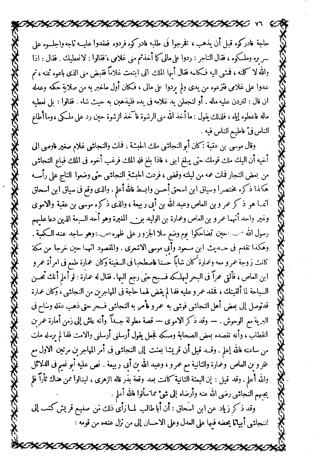 وَقَالَ مُوسَى بْنُ عُقْبَةَ: كَانَ أَبُو النَّجَاشِيِّ مَلِكَ الْحَبَشَةِ، فَمَاتَ وَالنَّجَاشِيُّ غُلَامٌ صَغِيرٌ فَأَوْصَى إِلَى أَخِيهِ إِنَّ إِلَيْكَ مُلْكَ قَوْمِكَ حَتَّى يَبْلُغَ ابْنِي، فَإِذَا بَلَغَ فَلَهُ الْمُلْكُ فَرَغِبَ أَخُوهُ فِي الْمُلْكِ فَبَاعَ النَّجَاشِيَّ مِنْ بَعْضِ التُّجَّارِ فَمَاتَ عَمُّهُ مِنْ لَيْلَتِهِ وَقَضَى، فَرَدَّتِ الْحَبَشَةُ النَّجَاشِيَّ حَتَّى وَضَعُوا التَّاجَ عَلَى رَأْسِهِ هَكَذَا ذَكَرَهُ مُخْتَصَرًا وَسِيَاقُ ابْنِ إِسْحَاقَ أَحْسَنُ وَأَبْسَطُ فاللَّه أَعْلَمُ. وَالَّذِي وَقَعَ فِي سِيَاقِ ابْنِ إِسْحَاقَ إِنَّمَا هُوَ ذِكْرُ عَمْرِو بْنِ الْعَاصِ وَعَبْدِ اللَّهِ بْنِ أَبِي رَبِيعَةَ، وَالَّذِي ذَكَرَهُ مُوسَى بْنُ عُقْبَةَ وَالْأُمَوِيُّ وَغَيْرُ وَاحِدٍ أَنَّهُمَا عَمْرُو بْنُ الْعَاصِ وَعُمَارَةُ بْنُ الْوَلِيدِ بْنِ الْمُغِيرَةِ وَهُوَ أَحَدُ السَّبْعَةِ الَّذِينَ دَعَا عَلَيْهِمْ رَسُولُ اللَّهِ صَلَّى اللَّهُ عَلَيْهِ وَسَلَّمَ حِينَ تضاحكوا يوم وضع سلا الْجَزُورِ عَلَى ظَهْرِهِ صَلَّى اللَّهُ عَلَيْهِ وَسَلَّمَ وَهُوَ سَاجِدٌ عِنْدَ الْكَعْبَةِ.