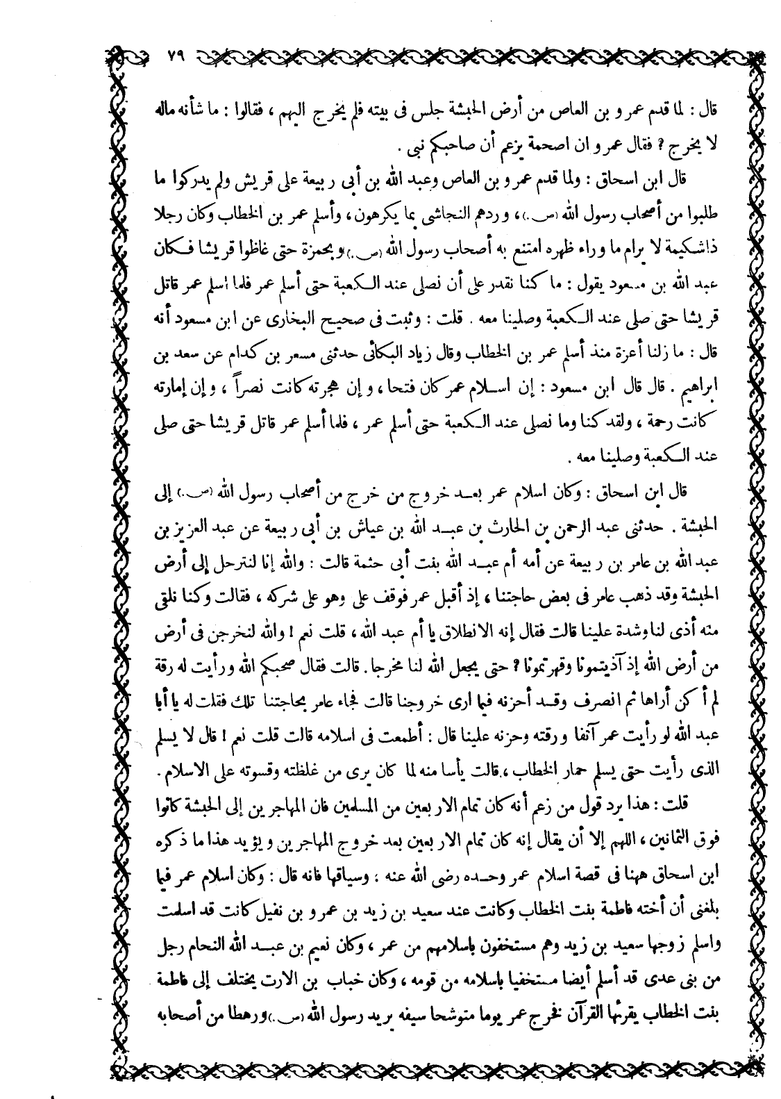 قُلْتُ: هَذَا يَرُدُّ قَوْلَ مَنْ زَعَمَ أَنَّهُ كَانَ تَمَامَ الْأَرْبَعِينَ مِنَ الْمُسْلِمِينَ فَإِنَّ الْمُهَاجِرِينَ إِلَى الْحَبَشَةِ كَانُوا فَوْقَ الثَّمَانِينَ، اللَّهمّ إِلَّا أَنْ يُقَالَ إِنَّهُ كَانَ تَمَامَ الْأَرْبَعِينَ بَعْدَ خُرُوجِ الْمُهَاجِرِينَ وَيُؤَيِّدُ هَذَا مَا ذَكَرَهُ ابْنُ إِسْحَاقَ هَاهُنَا فِي قِصَّةِ إِسْلَامِ عُمَرَ وَحْدَهُ رَضِيَ اللَّهُ عَنْهُ، وَسِيَاقُهَا فَإِنَّهُ قَالَ: وَكَانَ إِسْلَامُ عُمَرَ فِيمَا بَلَغَنِي أَنَّ أُخْتَهُ فَاطِمَةَ بِنْتَ الْخَطَّابِ وَكَانَتْ عِنْدَ سَعِيدِ بْنِ زَيْدِ بْنِ عَمْرِو بْنِ نُفَيْلٍ كَانَتْ قَدْ أَسْلَمَتْ وَأَسْلَمَ زَوْجُهَا سَعِيدُ بْنُ زَيْدٍ وَهُمْ مُسْتَخْفُونَ بِإِسْلَامِهِمْ مِنْ عُمَرَ، وَكَانَ نُعَيْمُ بْنُ عَبْدِ اللَّهِ النَّحَّامُ رَجُلٌ مِنْ بَنِي عَدِيٍّ قَدْ أَسْلَمَ أيضا مستخفيا بإسلامه مِنْ قَوْمِهِ، وَكَانَ خَبَّابُ بْنُ الْأَرَتِّ يَخْتَلِفُ إِلَى فَاطِمَةَ بِنْتِ الْخَطَّابِ يُقْرِئُهَا الْقُرْآنَ فَخَرَجَ عُمَرُ يَوْمًا مُتَوَشِّحًا سَيْفَهُ يُرِيدُ رَسُولُ اللَّهِ صَلَّى اللَّهُ عَلَيْهِ وَسَلَّمَ وَرَهْطًا مِنْ أَصْحَابِهِ