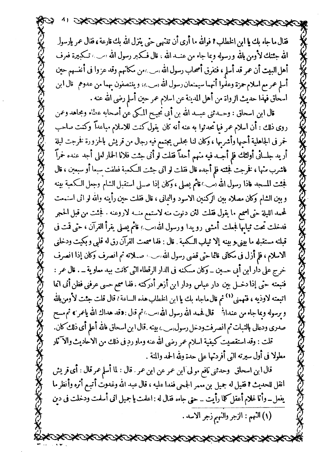 فقال ما جاء بك يا ابن الخطاب؟ فو الله مَا أَرَى أَنْ تَنْتَهِيَ حَتَّى يُنْزِلَ اللَّهُ بِكَ قَارِعَةً، فَقَالَ عُمَرُ يَا رَسُولَ اللَّهِ جِئْتُكَ لَأُومِنَ باللَّه وَرَسُولِهِ وَبِمَا جَاءَ مِنْ عِنْدِ اللَّهِ، قَالَ فَكَبَّرَ رَسُولُ اللَّهِ صَلَّى اللَّهُ عَلَيْهِ وَسَلَّمَ تكبيرة فعرف أَهْلُ الْبَيْتِ أَنَّ عُمَرَ قَدْ أَسْلَمَ، فَتَفَرَّقَ أَصْحَابِ رَسُولِ اللَّهِ صَلَّى اللَّهُ عَلَيْهِ وَسَلَّمَ مِنْ مَكَانِهِمْ وَقَدْ عَزُّوا فِي أَنْفُسِهِمْ حِينَ أسلم عمر مع إسلام حمزة وعلموا أَنَّهُمَا سَيَمْنَعَانِ رَسُولَ اللَّهِ صَلَّى اللَّهُ عَلَيْهِ وَسَلَّمَ، وَيَنْتَصِفُونَ بِهِمَا مِنْ عَدُوِّهِمْ قَالَ ابْنُ إِسْحَاقَ فَهَذَا حَدِيثُ الرُّوَاةِ مِنْ أَهْلِ الْمَدِينَةِ عَنْ إِسْلَامِ عُمَرَ حِينَ أَسْلَمَ رَضِيَ اللَّهُ عَنْهُ.