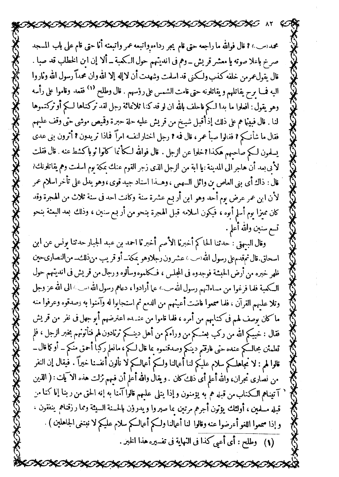 وَقَالَ الْبَيْهَقِيُّ: حَدَّثَنَا الْحَاكِمُ أَخْبَرَنَا الْأَصَمُّ أَخْبَرَنَا أَحْمَدُ بْنُ عَبْدِ الْجَبَّارِ حَدَّثَنَا يُونُسُ عَنِ ابْنِ إِسْحَاقَ. قَالَ ثُمَّ قَدِمَ عَلَى رَسُولِ اللَّهِ صَلَّى اللَّهُ عَلَيْهِ وَسَلَّمَ عِشْرُونَ رَجُلًا وَهُوَ بِمَكَّةَ- أَوْ قَرِيبٌ مِنْ ذَلِكَ- مِنَ النَّصَارَى حِينَ ظَهَرَ خَبَرُهُ مَنْ أَرْضِ الْحَبَشَةِ فَوَجَدُوهُ فِي الْمَجْلِسِ، فكلموه وسألوه وَرِجَالٌ مِنْ قُرَيْشٍ فِي أَنْدِيَتِهِمْ حَوْلَ الْكَعْبَةِ فَلَمَّا فَرَغُوا مِنْ مُسَاءَلَتِهِمْ رَسُولَ اللَّهِ صَلَّى اللَّهُ عَلَيْهِ وَسَلَّمَ عَمَّا أَرَادُوا، دَعَاهُمْ رَسُولُ اللَّهِ صَلَّى اللَّهُ عَلَيْهِ وَسَلَّمَ إِلَى اللَّهِ عَزَّ وَجَلَّ وَتَلَا عَلَيْهِمُ الْقُرْآنَ، فَلَمَّا سَمِعُوا فَاضَتْ أَعْيُنُهُمْ مِنَ الدَّمْعِ ثُمَّ اسْتَجَابُوا لَهُ وَآمَنُوا بِهِ وَصَدَّقُوهُ وَعَرَفُوا مِنْهُ مَا كَانَ يُوصَفُ لَهُمْ فِي كِتَابِهِمْ مِنْ أَمْرِهِ، فَلَمَّا قَامُوا مِنْ عِنْدِهِ اعْتَرَضَهُمْ أَبُو جَهْلٍ فِي نفر من قريش فقال: خَيَّبَكُمُ اللَّهُ مِنْ رَكْبٍ بَعَثَكُمْ مَنْ وَرَاءَكُمْ مِنْ أَهْلِ دِينِكُمْ تَرْتَادُونَ لَهُمْ فَتَأْتُونَهُمْ بِخَبَرِ الرَّجُلِ، فَلَمْ تَطْمَئِنَّ مَجَالِسُكُمْ عِنْدَهُ حَتَّى فَارَقْتُمْ دِينَكُمْ وَصَدَّقْتُمُوهُ بِمَا قَالَ لَكُمْ، مَا نَعْلَمُ ركبا أحمق منكم- أو كما قال- قالوا لهم: لا نجاهلكم سلام عليكم لنا أعمالنا ولكم أعمالكم لا نألون أَنْفُسَنَا خَيْرًا. فَيُقَالُ إِنَّ النَّفَرَ مِنْ نَصَارَى نَجْرَانَ، وَاللَّهُ أَعْلَمُ أَيُّ ذَلِكَ كَانَ. وَيُقَالُ والله أعلم أن فيهم نزلت هذه الْآيَاتُ: الَّذِينَ آتَيْناهُمُ الْكِتابَ مِنْ قَبْلِهِ هُمْ بِهِ يُؤْمِنُونَ وَإِذا يُتْلى عَلَيْهِمْ قالُوا آمَنَّا بِهِ إِنَّهُ الْحَقُّ مِنْ رَبِّنا إِنَّا كُنَّا مِنْ قَبْلِهِ مُسْلِمِينَ، أُولئِكَ يُؤْتَوْنَ أَجْرَهُمْ مَرَّتَيْنِ بِما صَبَرُوا وَيَدْرَؤُنَ بِالْحَسَنَةِ السَّيِّئَةَ وَمِمَّا رَزَقْناهُمْ يُنْفِقُونَ، وَإِذا سَمِعُوا اللَّغْوَ أَعْرَضُوا عَنْهُ وَقالُوا لَنا أَعْمالُنا وَلَكُمْ أَعْمالُكُمْ سَلامٌ عَلَيْكُمْ لا نَبْتَغِي الْجاهِلِينَ 28: 52- 55.