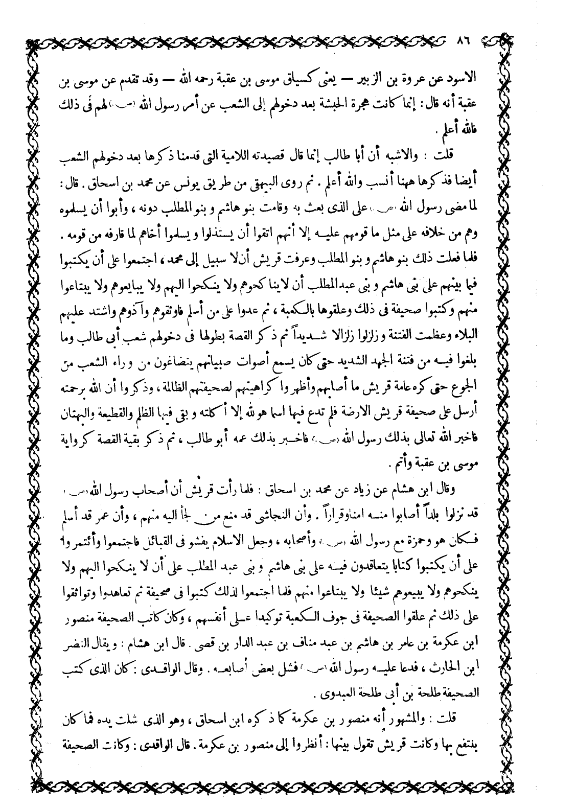 فَلَمَّا فَعَلَتْ ذَلِكَ بَنُو هَاشِمٍ وَبَنُو الْمُطَّلِبِ وَعَرَفَتْ قُرَيْشٌ أَنْ لَا سَبِيلَ إِلَى مُحَمَّدٍ، اجْتَمَعُوا عَلَى أَنْ يَكْتُبُوا فِيمَا بَيْنَهُمْ عَلَى بَنِي هَاشِمٍ وَبَنِي عَبْدِ الْمُطَّلِبِ أَنْ لا يناكحوهم ولا ينكحوا اليهم وبايعوهم وَلَا يَبْتَاعُوا مِنْهُمْ وَكَتَبُوا صَحِيفَةً فِي ذَلِكَ وَعَلَّقُوهَا بِالْكَعْبَةِ، ثُمَّ عَدَوْا عَلَى مَنْ أَسْلَمَ فأوثقوهم وآذوهم واشتد عليهم البلاء وَعَظُمَتِ الْفِتْنَةُ وزُلْزِلُوا زِلْزالًا شَدِيداً 33: 11 ثُمَّ ذَكَرَ الْقِصَّةَ بِطُولِهَا فِي دُخُولِهِمْ شِعْبَ أَبِي طَالِبٍ وَمَا بَلَغُوا فِيهِ مِنْ فِتْنَةِ الْجَهْدِ الشَّدِيدِ حتى كان يسمع أصوات صبياتهم يَتَضَاغَوْنَ مِنْ وَرَاءِ الشِّعْبِ مِنَ الْجُوعِ حَتَّى كَرِهَ عَامَّةُ قُرَيْشٍ مَا أَصَابَهُمْ وَأَظْهَرُوا كَرَاهِيَتَهُمْ لِصَحِيفَتِهِمُ الظَّالِمَةِ، وَذَكَرُوا أَنَّ اللَّهَ بِرَحْمَتِهِ أَرْسَلَ عَلَى صَحِيفَةِ قُرَيْشٍ الْأَرَضَةَ فَلَمْ تَدَعْ فِيهَا اسْمًا هُوَ للَّه إِلَّا أَكَلَتْهُ وَبَقِيَ فِيهَا الظُّلْمُ وَالْقَطِيعَةُ وَالْبُهْتَانُ فَأَخْبَرَ اللَّهُ تَعَالَى بِذَلِكَ رَسُولَ اللَّهِ صَلَّى اللَّهُ عَلَيْهِ وَسَلَّمَ فَأَخْبَرَ بذلك عمه أبو طَالِبٍ، ثُمَّ ذَكَرَ بَقِيَّةَ الْقِصَّةِ كَرِوَايَةِ مُوسَى بْنِ عُقْبَةَ وَأَتَمَّ.