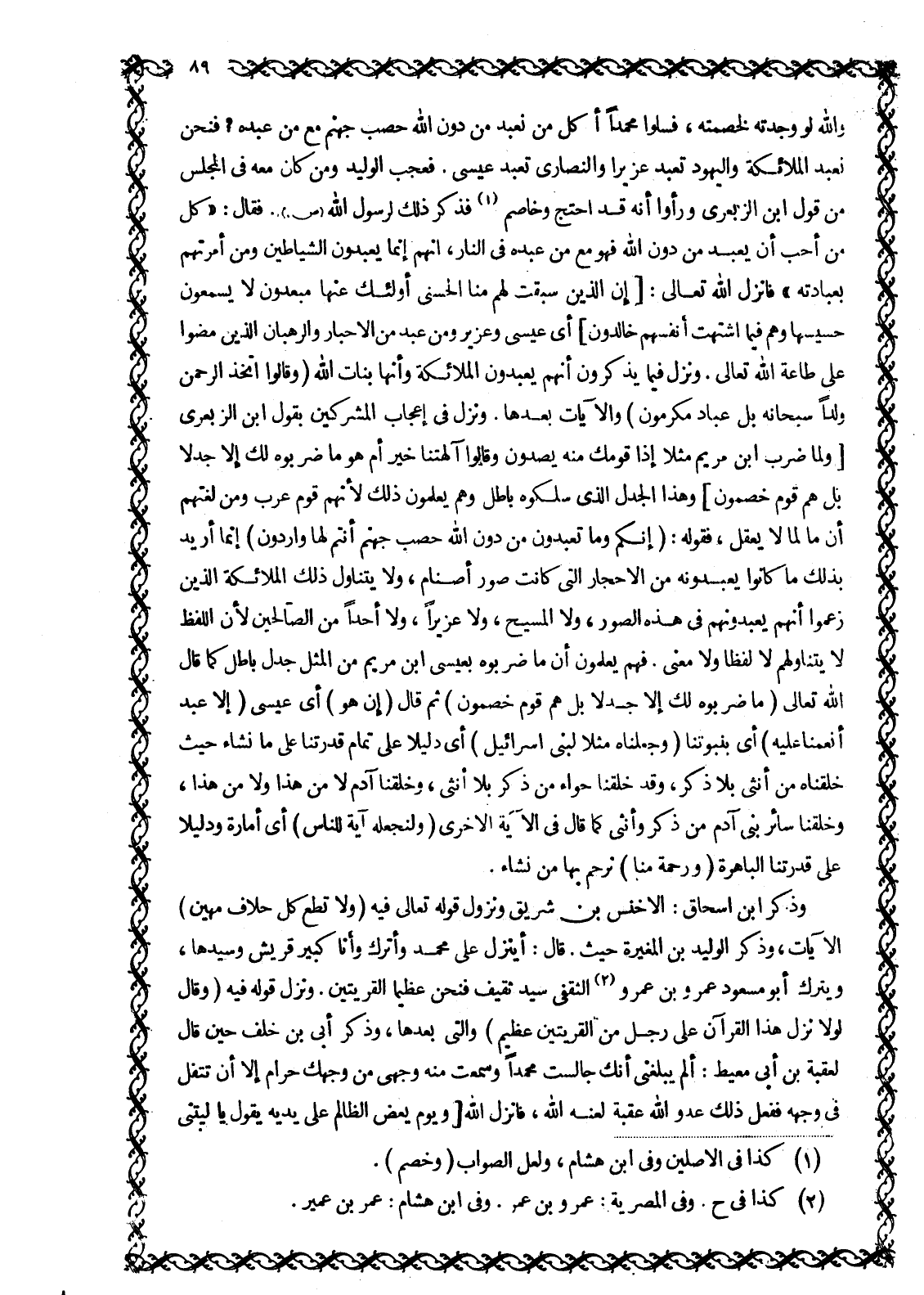 وَاللَّهِ لَوْ وَجَدْتُهُ لَخَصَمْتُهُ، فَسَلُوا مُحَمَّدًا أَكُلُّ من نَعْبُدُ مِنْ دُونِ اللَّهِ حَصَبُ جَهَنَّمَ مَعَ مَنْ عَبَدَهُ؟ فَنَحْنُ نَعْبُدُ الْمَلَائِكَةَ وَالْيَهُودُ تَعْبُدُ عزيزا وَالنَّصَارَى تَعْبُدُ عِيسَى. فَعَجِبَ الْوَلِيدُ وَمَنْ كَانَ مَعَهُ فِي الْمَجْلِسِ مِنْ قَوْلِ ابْنِ الزِّبَعْرَى وَرَأَوْا أَنَّهُ قَدِ احْتَجَّ وَخَاصَمَ [1] فَذُكِرَ ذَلِكَ لِرَسُولِ اللَّهِ صَلَّى اللَّهُ عَلَيْهِ وَسَلَّمَ. فَقَالَ: «كُلُّ مَنْ أَحَبَّ أَنْ يُعْبَدَ مِنْ دُونِ الله فهو مع من عبده في النار، إِنَّهُمْ إِنَّمَا يَعْبُدُونَ الشَّيَاطِينَ وَمَنْ أَمَرَتْهُمْ بِعِبَادَتِهِ» فَأَنْزَلَ اللَّهُ تَعَالَى: إِنَّ الَّذِينَ سَبَقَتْ لَهُمْ مِنَّا الْحُسْنى أُولئِكَ عَنْها مُبْعَدُونَ لَا يَسْمَعُونَ حَسِيسَها وَهُمْ في مَا اشْتَهَتْ أَنْفُسُهُمْ خالِدُونَ 21: 101- 102 أَيْ عِيسَى وَعُزَيْرٌ وَمَنْ عُبِدَ مِنَ الْأَحْبَارِ وَالرُّهْبَانِ الَّذِينَ مَضَوْا عَلَى طَاعَةِ اللَّهِ تَعَالَى. وَنَزَلَ فِيمَا يَذْكُرُونَ أَنَّهُمْ يَعْبُدُونَ الْمَلَائِكَةَ وَأَنَّهَا بَنَاتُ اللَّهِ وَقالُوا اتَّخَذَ الرَّحْمنُ وَلَداً سُبْحانَهُ بَلْ عِبادٌ مُكْرَمُونَ 21: 26 وَالْآيَاتُ بَعْدَهَا. وَنَزَلَ فِي إِعْجَابِ الْمُشْرِكِينَ بِقَوْلِ بن الزِّبَعْرَى وَلَمَّا ضُرِبَ ابْنُ مَرْيَمَ مَثَلًا إِذا قَوْمُكَ مِنْهُ يَصِدُّونَ وَقالُوا أَآلِهَتُنا خَيْرٌ أَمْ هُوَ مَا ضَرَبُوهُ لَكَ إِلَّا جَدَلًا بَلْ هُمْ قَوْمٌ خَصِمُونَ 43: 57- 58 وهذا الجدل الّذي سلكوه باطل وهم يعلمون ذلك لأنهم قوم عرب ومن لغتهم أن ما لما لا يعقل، فقوله: إِنَّكُمْ وَما تَعْبُدُونَ مِنْ دُونِ اللَّهِ حَصَبُ جَهَنَّمَ أَنْتُمْ لَها وارِدُونَ 21: 98 إِنَّمَا أُرِيدَ بِذَلِكَ مَا كَانُوا يَعْبُدُونَهُ مِنَ الْأَحْجَارِ الَّتِي كَانَتْ صُوَرَ أَصْنَامٍ، وَلَا يَتَنَاوَلُ ذَلِكَ الْمَلَائِكَةَ الَّذِينَ زَعَمُوا أَنَّهُمْ يَعْبُدُونَهُمْ فِي هَذِهِ الصُّوَرِ، وَلَا الْمَسِيحَ، وَلَا عُزَيْرًا، وَلَا أَحَدًا مِنَ الصَّالِحِينَ لِأَنَّ اللَّفْظَ لَا يَتَنَاوَلُهُمْ لَا لَفْظًا وَلَا مَعْنًى. فَهُمْ يَعْلَمُونَ أَنَّ ما ضربوه بعيسى بن مَرْيَمَ مِنَ الْمَثَلِ جَدَلٌ بَاطِلٌ كَمَا قَالَ اللَّهُ تَعَالَى مَا ضَرَبُوهُ لَكَ إِلَّا جَدَلًا بَلْ هُمْ قَوْمٌ خَصِمُونَ 43: 58 ثُمَّ قَالَ إِنْ هُوَ 43: 59 أَيْ عِيسَى إِلَّا عَبْدٌ أَنْعَمْنا عَلَيْهِ 43: 59 أي بنبوتنا وَجَعَلْناهُ مَثَلًا لِبَنِي إِسْرائِيلَ 43: 59 أَيْ دَلِيلًا عَلَى تَمَامِ قُدْرَتِنَا عَلَى مَا نَشَاءُ حَيْثُ خَلَقْنَاهُ مِنْ أُنْثَى بِلَا ذَكَرٍ، وَقَدْ خَلَقْنَا حَوَّاءَ مِنْ ذَكَرٍ بِلَا أُنْثَى، وَخَلَقْنَا آدَمَ لَا مِنْ هَذَا وَلَا مِنْ هَذَا، وَخَلَقْنَا سَائِرَ بَنِي آدَمَ مِنْ ذَكَرٍ وَأُنْثَى كَمَا قَالَ فِي الْآيَةِ الْأُخْرَى وَلِنَجْعَلَهُ آيَةً لِلنَّاسِ 19: 21 أَيْ أَمَارَةً وَدَلِيلًا عَلَى قُدْرَتِنَا الْبَاهِرَةِ وَرَحْمَةً مِنَّا 19: 21 نَرْحَمُ بِهَا مَنْ نَشَاءُ.