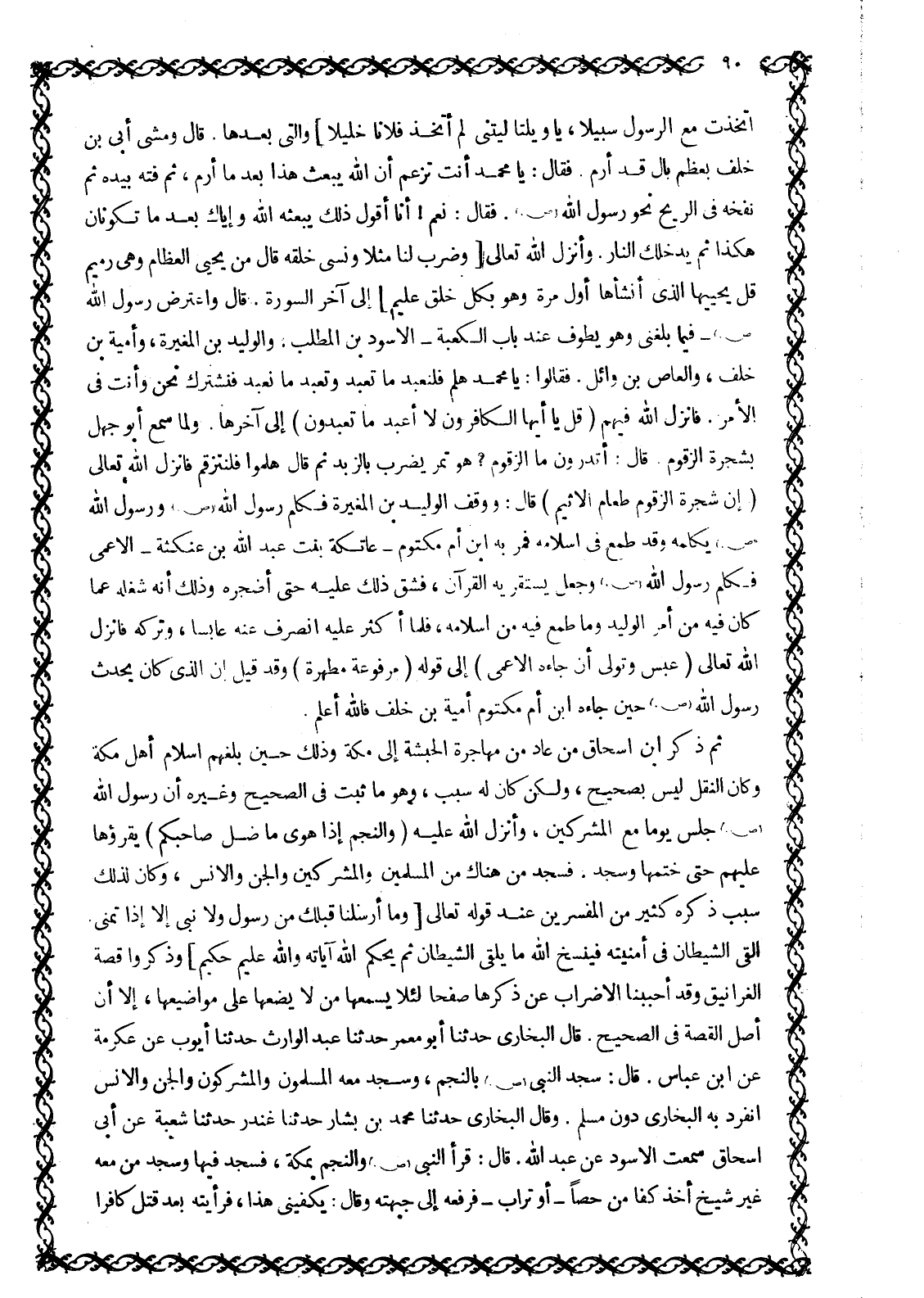 اتَّخَذْتُ مَعَ الرَّسُولِ سَبِيلًا، يَا وَيْلَتى لَيْتَنِي لَمْ أَتَّخِذْ فُلاناً خَلِيلًا 25: 27- 28 وَالَّتِي بَعْدَهَا. قَالَ وَمَشَى أُبَيُّ بْنُ خَلَفٍ بِعَظْمٍ بَالٍ قَدْ أَرَمَّ. فَقَالَ: يَا مُحَمَّدُ أَنْتَ تَزْعُمُ أَنَّ اللَّهَ يَبْعَثُ هَذَا بَعْدَ مَا أَرَمَّ، ثُمَّ فَتَّهُ بِيَدِهِ ثُمَّ نَفَخَهُ فِي الرِّيحِ نَحْوَ رَسُولِ اللَّهِ صَلَّى اللَّهُ عَلَيْهِ وَسَلَّمَ. فَقَالَ: نَعَمْ! أَنَا أَقُولُ ذَلِكَ يَبْعَثُهُ اللَّهُ وَإِيَّاكَ بَعْدَ مَا تَكُونَانِ هَكَذَا ثُمَّ يُدْخِلُكَ النَّارَ. وَأَنْزَلَ اللَّهُ تَعَالَى وَضَرَبَ لَنا مَثَلًا وَنَسِيَ خَلْقَهُ قَالَ مَنْ يُحْيِ الْعِظامَ وَهِيَ رَمِيمٌ قُلْ يُحْيِيهَا الَّذِي أَنْشَأَها أَوَّلَ مَرَّةٍ وَهُوَ بِكُلِّ خَلْقٍ عَلِيمٌ 36: 78- 79 إِلَى آخِرِ السُّورَةِ. قَالَ وَاعْتَرَضَ رَسُولِ اللَّهِ صَلَّى اللَّهُ عَلَيْهِ وَسَلَّمَ- فِيمَا بَلَغَنِي وَهُوَ يَطُوفُ عِنْدَ بَابِ الْكَعْبَةِ- الْأَسْوَدُ بْنُ الْمُطَّلِبِ، وَالْوَلِيدُ بْنُ الْمُغِيرَةِ، وَأُمَيَّةُ بْنُ خَلَفٍ، وَالْعَاصُ بْنُ وَائِلٍ. فَقَالُوا: يَا مُحَمَّدُ هَلُمَّ فَلْنَعْبُدْ مَا تَعْبُدُ وَتَعْبُدْ مَا نَعْبُدُ فَنَشْتَرِكُ نَحْنُ وَأَنْتَ فِي الْأَمْرِ. فَأَنْزَلَ اللَّهُ فِيهِمْ قُلْ يَا أَيُّهَا الْكافِرُونَ لَا أَعْبُدُ مَا تَعْبُدُونَ 109: 1- 2 إِلَى آخِرِهَا. وَلَمَّا سَمِعَ أَبُو جَهْلٍ بِشَجَرَةِ الزَّقُّومِ. قَالَ: أَتَدْرُونَ مَا الزَّقُّومُ؟ هُوَ تَمُرُّ يُضْرَبُ بِالزُّبْدِ ثُمَّ قَالَ هَلُمُّوا فَلْنَتَزَقَّمْ فَأَنْزَلَ اللَّهُ تَعَالَى إِنَّ شَجَرَةَ الزَّقُّومِ طَعامُ الْأَثِيمِ 44: 43- 44 قَالَ: وَوَقَفَ الْوَلِيدُ بْنُ الْمُغِيرَةِ فَكَلَّمَ رَسُولَ اللَّهِ صَلَّى اللَّهُ عَلَيْهِ وَسَلَّمَ وَرَسُولُ اللَّهِ صَلَّى اللَّهُ عَلَيْهِ وَسَلَّمَ يُكَلِّمُهُ وَقَدْ طَمِعَ فِي إِسْلَامِهِ فَمَرَّ بِهِ ابْنُ أُمِّ مَكْتُومٍ- عَاتِكَةَ بِنْتِ عَبْدِ اللَّهِ بْنِ عَنْكَثَةَ- الْأَعْمَى فَكَلَّمَ رَسُولَ اللَّهِ صَلَّى اللَّهُ عَلَيْهِ وَسَلَّمَ وَجَعَلَ يستقريه الْقُرْآنَ، فَشَقَّ ذَلِكَ عَلَيْهِ حَتَّى أَضْجَرَهُ وَذَلِكَ أَنَّهُ شَغَلَهُ عَمَّا كَانَ فِيهِ مِنْ أَمْرِ الْوَلِيدِ وَمَا طَمِعَ فِيهِ مِنْ إِسْلَامِهِ، فَلَمَّا أَكْثَرَ عَلَيْهِ انْصَرَفَ عَنْهُ عَابِسًا، وَتَرَكَهُ فَأَنْزَلَ اللَّهُ تَعَالَى عَبَسَ وَتَوَلَّى أَنْ جاءَهُ الْأَعْمى 80: 1- 2 إلى قوله مَرْفُوعَةٍ مُطَهَّرَةٍ 80: 14 وَقَدْ قِيلَ إِنَّ الَّذِي كَانَ يُحَدِّثُ رَسُولَ اللَّهِ صَلَّى اللَّهُ عَلَيْهِ وَسَلَّمَ حِينَ جَاءَهُ ابْنُ أُمِّ مَكْتُومٍ أُمَيَّةُ بْنُ خَلَفٍ فاللَّه أَعْلَمُ.