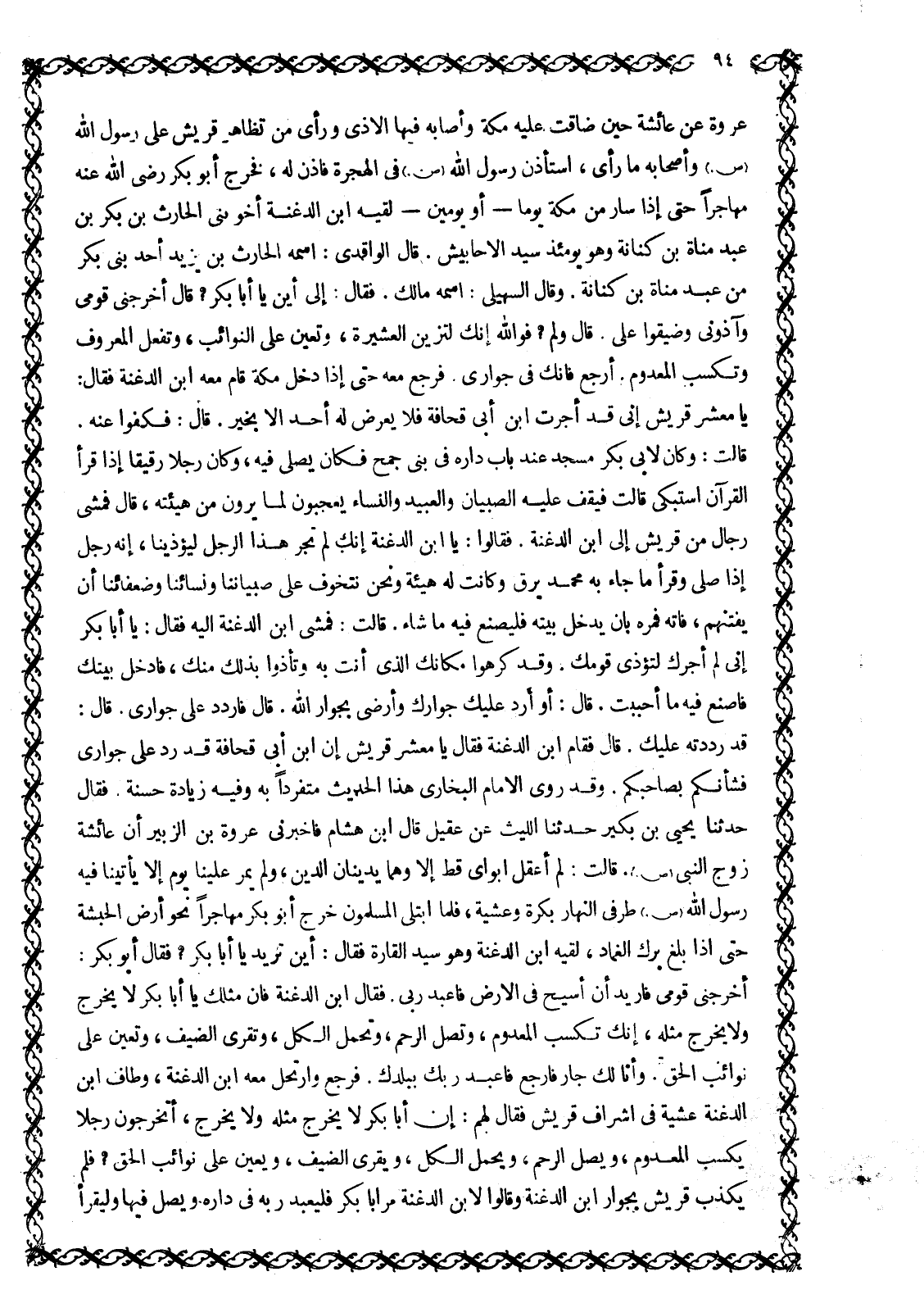عُرْوَةَ عَنْ عَائِشَةَ حِينَ ضَاقَتْ عَلَيْهِ مَكَّةُ وَأَصَابَهُ فِيهَا الْأَذَى وَرَأَى مِنْ تَظَاهُرِ قُرَيْشٍ عَلَى رَسُولِ اللَّهِ صَلَّى اللَّهُ عَلَيْهِ وَسَلَّمَ وَأَصْحَابِهِ مَا رَأَى، اسْتَأْذَنَ رَسُولَ اللَّهِ صَلَّى اللَّهُ عَلَيْهِ وَسَلَّمَ فِي الْهِجْرَةِ فَأَذِنَ لَهُ، فَخَرَجَ أَبُو بَكْرٍ رَضِيَ اللَّهُ عَنْهُ مُهَاجِرًا حَتَّى إِذَا سَارَ مِنْ مَكَّةَ يَوْمًا- أَوْ يَوْمَيْنِ- لَقِيَهُ ابْنُ الدَّغِنَةِ أَخُو بَنِي الْحَارِثِ بْنِ بَكْرِ بْنِ عَبْدِ مَنَاةَ بْنِ كِنَانَةَ وَهُوَ يَوْمَئِذٍ سَيِّدُ الْأَحَابِيشِ. قَالَ الْوَاقِدِيُّ: اسْمُهُ الْحَارِثُ بْنُ يَزِيدَ أَحَدُ بَنِي بَكْرٍ مِنْ عَبْدِ مَنَاةَ بْنِ كِنَانَةَ. وَقَالَ السُّهَيْلِيُّ: اسْمُهُ مَالِكٌ. فَقَالَ: إِلَى أَيْنَ يَا أَبَا بَكْرٍ؟ قَالَ أَخْرَجَنِي قَوْمِي وَآذَوْنِي وَضَيَّقُوا عَلَيَّ. قَالَ ولم؟ فو الله إِنَّكَ لَتَزِينُ الْعَشِيرَةَ، وَتُعِينُ عَلَى النَّوَائِبِ، وَتَفْعَلُ الْمَعْرُوفَ وَتُكْسِبُ الْمَعْدُومَ. ارْجِعْ فَإِنَّكَ فِي جِوَارِي. فَرَجَعَ مَعَهُ حَتَّى إِذَا دَخَلَ مَكَّةَ قَامَ معه ابْنُ الدَّغِنَةِ فَقَالَ: