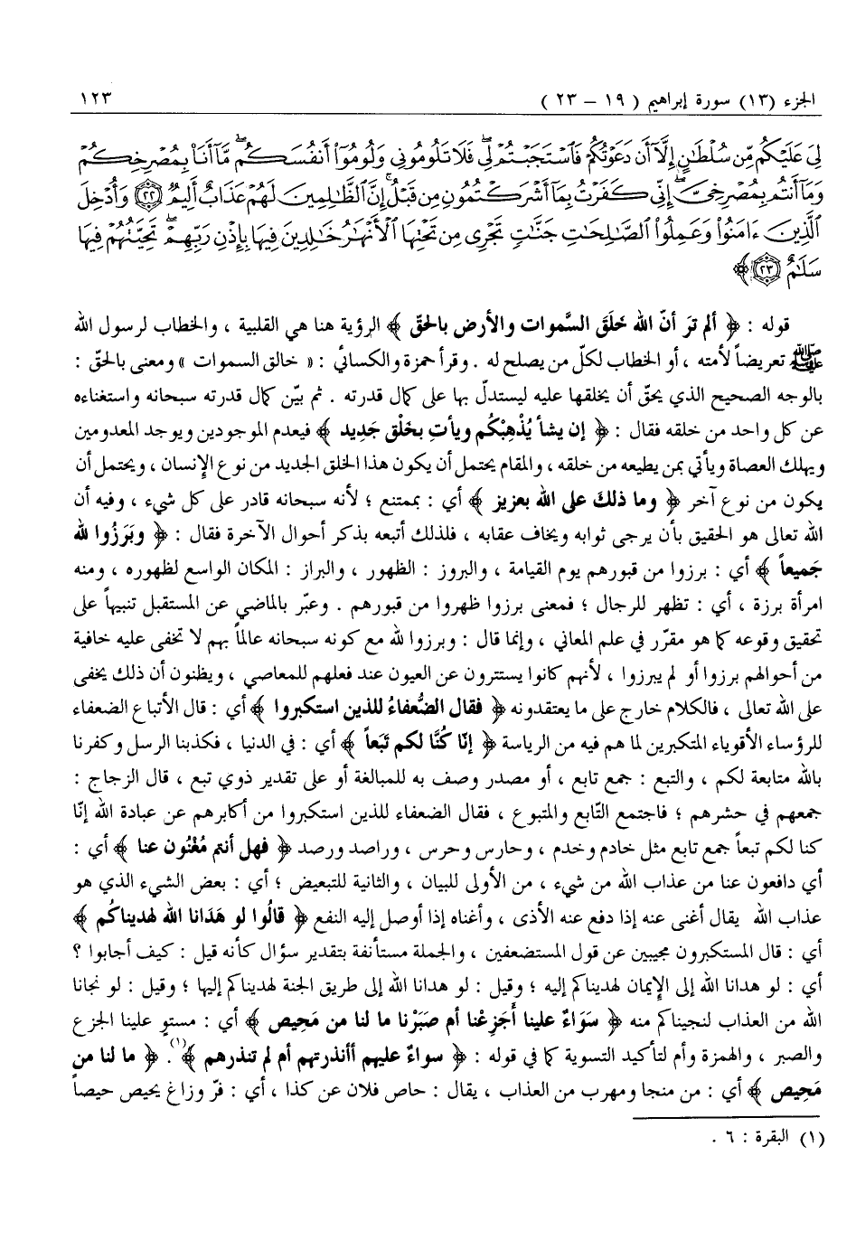 بِالْوَجْهِ الصَّحِيحِ الَّذِي يَحِقُّ أَنْ يَخْلُقَهَا عَلَيْهِ لِيُسْتَدَلَّ بِهَا عَلَى كَمَالِ قُدْرَتِهِ. ثُمَّ بَيَّنَ كَمَالَ قُدْرَتِهِ سُبْحَانَهُ وَاسْتِغْنَاءَهُ عَنْ كُلِّ وَاحِدٍ مِنْ خَلْقِهِ فَقَالَ: إِنْ يَشَأْ يُذْهِبْكُمْ وَيَأْتِ بِخَلْقٍ جَدِيدٍ فَيُعْدِمُ الْمَوْجُودِينَ وَيُوجِدُ الْمَعْدُومِينَ وَيُهْلِكُ الْعُصَاةَ وَيَأْتِي بِمَنْ يُطِيعُهُ مِنْ خَلْقِهِ، وَالْمَقَامُ يَحْتَمِلُ أَنْ يَكُونَ هَذَا الْخَلْقُ الْجَدِيدُ مِنْ نَوْعِ الْإِنْسَانِ، وَيَحْتَمِلُ أَنْ يَكُونَ مِنْ نَوْعٍ آخَرَ وَما ذلِكَ عَلَى اللَّهِ بِعَزِيزٍ أَيْ: بِمُمْتَنِعٍ لِأَنَّهُ سُبْحَانَهُ قَادِرٌ عَلَى كل شيء، وفيه أَنْ يَكُونَ مِنْ نَوْعٍ آخَرَ وَما ذلِكَ عَلَى اللَّهِ بِعَزِيزٍ أَيْ: بِمُمْتَنِعٍ لِأَنَّهُ سُبْحَانَهُ قَادِرٌ عَلَى كُلِّ شَيْءٍ، وَفِيهِ أَنَّ اللَّهَ تَعَالَى هُوَ الْحَقِيقُ بِأَنْ يُرْجَى ثَوَابُهُ وَيُخَافَ عِقَابُهُ، فَلِذَلِكَ أَتْبَعَهُ بِذِكْرِ أَحْوَالِ الْآخِرَةِ فَقَالَ: وَبَرَزُوا لِلَّهِ جَمِيعاً أَيْ: بَرَزُوا مِنْ قُبُورِهِمْ يَوْمَ الْقِيَامَةِ، وَالْبُرُوزُ: الظُّهُورُ، وَالْبَرَازُ: الْمَكَانُ الْوَاسِعُ لِظُهُورِهِ، وَمِنْهُ امْرَأَةٌ بَرْزَةٌ، أَيْ: تَظْهَرُ لِلرِّجَالِ فَمَعْنَى بَرَزُوا ظَهَرُوا مِنْ قُبُورِهِمْ. وَعُبِّرَ بِالْمَاضِي عَنِ الْمُسْتَقْبَلِ تَنْبِيهًا عَلَى تَحْقِيقِ وُقُوعِهِ كَمَا هُوَ مُقَرَّرٌ فِي عِلْمِ الْمَعَانِي، وَإِنَّمَا قَالَ: وَبَرَزُوا لِلَّهِ مَعَ كَوْنِهِ سُبْحَانَهُ عَالِمًا بِهِمْ لَا تَخْفَى عَلَيْهِ خَافِيَةٌ مِنْ أَحْوَالِهِمْ بَرَزُوا أَوْ لَمْ يَبْرُزُوا، لِأَنَّهُمْ كَانُوا يَسْتَتِرُونَ عَنِ الْعُيُونِ عِنْدَ فِعْلِهِمْ لِلْمَعَاصِي، وَيَظُنُّونَ أَنَّ ذَلِكَ يَخْفَى عَلَى اللَّهِ تَعَالَى، فَالْكَلَامُ خَارِجٌ عَلَى مَا يَعْتَقِدُونَهُ فَقالَ الضُّعَفاءُ لِلَّذِينَ اسْتَكْبَرُوا أَيْ: قَالَ الْأَتْبَاعُ الضُّعَفَاءُ لِلرُّؤَسَاءِ الْأَقْوِيَاءِ الْمُتَكَبِّرِينَ لِمَا هُمْ فِيهِ مِنَ الرِّيَاسَةِ إِنَّا كُنَّا لَكُمْ تَبَعاً أَيْ: فِي الدُّنْيَا، فَكَذَّبْنَا الرُّسُلَ وَكَفَرْنَا بِاللَّهِ مُتَابَعَةً لَكُمْ، وَالتَّبَعُ: جَمْعُ تَابِعٍ، أَوْ مَصْدَرٌ وُصِفَ بِهِ لِلْمُبَالَغَةِ أَوْ عَلَى تَقْدِيرِ ذَوِي تَبَعٍ، قَالَ الزَّجَّاجُ: