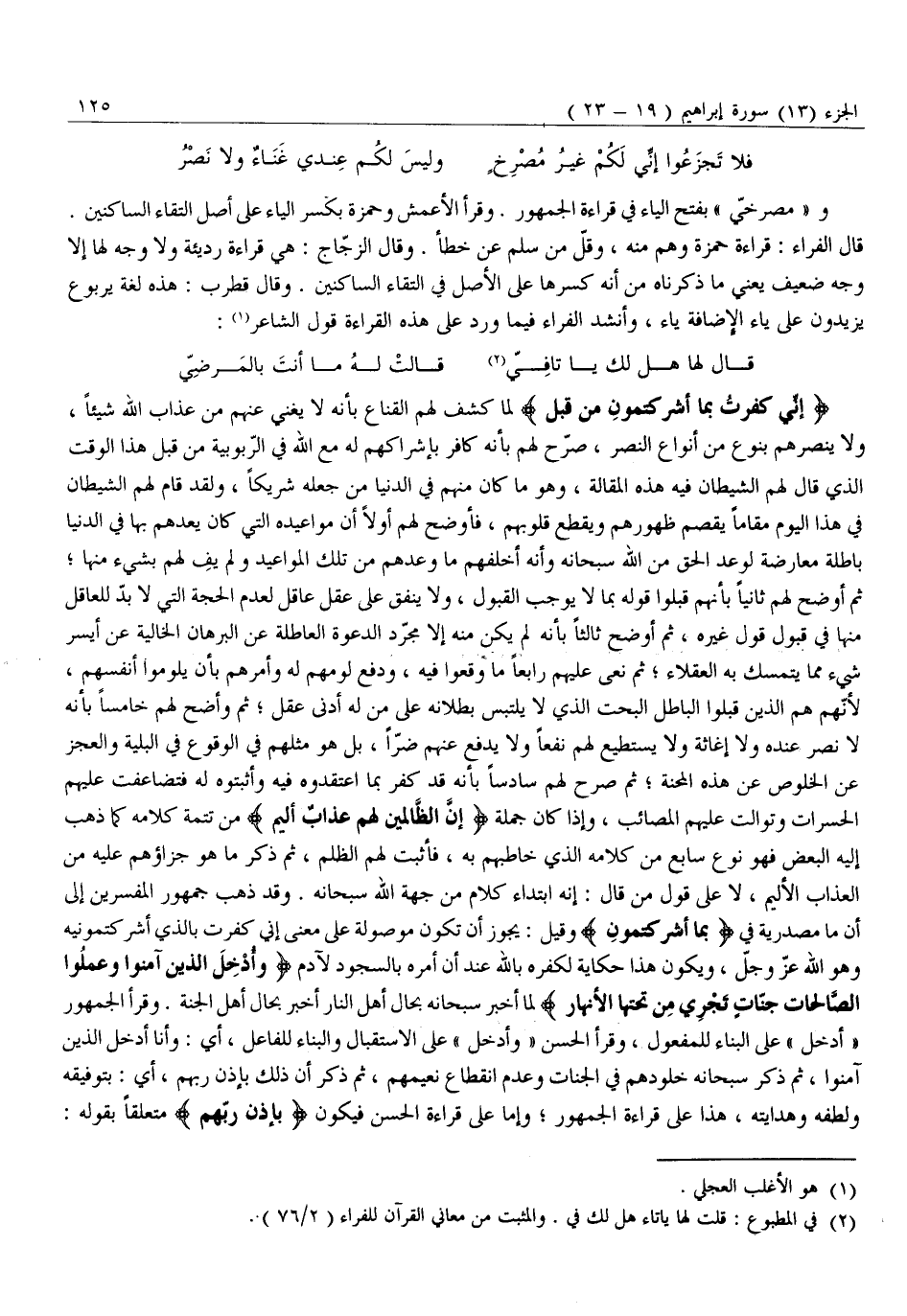 إِنِّي كَفَرْتُ بِما أَشْرَكْتُمُونِ مِنْ قَبْلُ لَمَّا كَشَفَ لَهُمُ الْقِنَاعَ بِأَنَّهُ لَا يُغْنِي عَنْهُمْ مِنْ عَذَابِ اللَّهِ شَيْئًا، وَلَا يَنْصُرُهُمْ بِنَوْعٍ مِنْ أَنْوَاعِ النَّصْرِ، صَرَّحَ لَهُمْ بِأَنَّهُ كَافِرٌ بِإِشْرَاكِهِمْ لَهُ مَعَ اللَّهِ فِي الرُّبُوبِيَّةِ مِنْ قَبْلِ هَذَا الْوَقْتِ الَّذِي قَالَ لَهُمُ الشَّيْطَانُ فِيهِ هَذِهِ الْمَقَالَةَ، وَهُوَ مَا كَانَ مِنْهُمْ فِي الدُّنْيَا مِنْ جَعْلِهِ شَرِيكًا، وَلَقَدْ قَامَ لَهُمُ الشَّيْطَانُ فِي هَذَا الْيَوْمِ مَقَامًا يَقْصِمُ ظُهُورَهُمْ وَيَقْطَعُ قُلُوبَهُمْ، فَأَوْضَحَ لَهُمْ أَوَّلًا أَنَّ مَوَاعِيدَهُ الَّتِي كَانَ يَعِدُهُمْ بِهَا فِي الدُّنْيَا بَاطِلَةٌ مُعَارِضَةٌ لِوَعْدِ الْحَقِّ مِنَ اللَّهِ سُبْحَانَهُ وَأَنَّهُ أَخْلَفَهُمْ مَا وَعَدَهُمْ مِنْ تِلْكَ الْمَوَاعِيدِ وَلَمْ يَفِ لَهُمْ بِشَيْءٍ مِنْهَا ثُمَّ أَوْضَحَ لَهُمْ ثَانِيًا بِأَنَّهُمْ قَبِلُوا قَوْلَهُ بِمَا لَا يُوجِبُ الْقَبُولَ، وَلَا يَنْفُقُ عَلَى عَقْلِ عَاقِلٍ لِعَدَمِ الْحُجَّةِ الَّتِي لَا بُدَّ لِلْعَاقِلِ مِنْهَا فِي قَبُولِ قَوْلِ غَيْرِهِ، ثُمَّ أَوْضَحَ ثَالِثًا بِأَنَّهُ لَمْ يَكُنْ مِنْهُ إِلَّا مُجَرَّدُ الدَّعْوَةِ الْعَاطِلَةِ عَنِ الْبُرْهَانِ الْخَالِيَةِ عَنْ أَيْسَرِ شَيْءٍ مِمَّا يَتَمَسَّكُ بِهِ الْعُقَلَاءُ ثُمَّ نَعَى عَلَيْهِمْ رَابِعًا مَا وَقَعُوا فِيهِ، وَدَفَعَ لَوْمَهُمْ لَهُ وَأَمَرَهُمْ بِأَنْ يَلُومُوا أَنْفُسَهُمْ، لِأَنَّهُمْ هُمُ الَّذِينَ قَبِلُوا الْبَاطِلَ الْبَحْتَ الَّذِي لَا يَلْتَبِسُ بُطْلَانُهُ عَلَى مَنْ لَهُ أَدْنَى عقل ثم وأضح لَهُمْ خَامِسًا بِأَنَّهُ لَا نَصْرَ عِنْدَهُ وَلَا إِغَاثَةَ وَلَا يَسْتَطِيعُ لَهُمْ نَفْعًا وَلَا يَدْفَعُ عَنْهُمْ ضُرًّا، بَلْ هُوَ مِثْلُهُمْ فِي الْوُقُوعِ فِي الْبَلِيَّةِ وَالْعَجْزِ عَنِ الْخُلُوصِ عَنْ هَذِهِ الْمِحْنَةِ ثُمَّ صَرَّحَ لَهُمْ سَادِسًا بِأَنَّهُ قَدْ كَفَرَ بِمَا اعْتَقَدُوهُ فِيهِ وَأَثْبَتُوهُ لَهُ فَتَضَاعَفَتْ عَلَيْهِمُ الْحَسَرَاتُ وَتَوَالَتْ عَلَيْهِمُ الْمَصَائِبُ، وَإِذَا كَانَ جُمْلَةُ إِنَّ الظَّالِمِينَ لَهُمْ عَذابٌ أَلِيمٌ مِنْ تَتِمَّةِ كَلَامِهِ كَمَا ذَهَبَ إِلَيْهِ الْبَعْضُ فَهُوَ نَوْعٌ سَابِعٌ مِنْ كَلَامِهِ الَّذِي خَاطَبَهُمْ بِهِ، فَأَثْبَتَ لَهُمُ الظُّلْمَ، ثُمَّ ذَكَرَ مَا هُوَ جَزَاؤُهُمْ عَلَيْهِ مِنَ الْعَذَابِ الْأَلِيمِ، لَا عَلَى قَوْلِ مَنْ قَالَ: إِنَّهُ ابْتِدَاءُ كَلَامٍ مِنْ جِهَةِ اللَّهِ سُبْحَانَهُ. وَقَدْ ذَهَبَ جُمْهُورُ الْمُفَسِّرِينَ إلى أن ما مصدرية في بِما أَشْرَكْتُمُونِ وَقِيلَ: يَجُوزُ أَنْ تَكُونَ مَوْصُولَةً عَلَى مَعْنَى إِنِّي كَفَرْتُ بِالَّذِي أَشْرَكْتُمُونِيهِ وَهُوَ اللَّهُ عَزَّ وَجَلَّ، وَيَكُونُ هَذَا حِكَايَةً لِكُفْرِهِ بِاللَّهِ عِنْدَ أَنْ أَمَرَهُ بِالسُّجُودِ لِآدَمَ وَأُدْخِلَ الَّذِينَ آمَنُوا وَعَمِلُوا الصَّالِحاتِ جَنَّاتٍ تَجْرِي مِنْ تَحْتِهَا الْأَنْهارُ لَمَّا أَخْبَرَ سُبْحَانَهُ بِحَالِ أَهْلِ النَّارِ أَخْبَرَ بِحَالِ أَهْلِ الْجَنَّةِ. وَقَرَأَ الْجُمْهُورُ «أُدْخِلَ» عَلَى الْبِنَاءِ لِلْمَفْعُولِ، وَقَرَأَ الْحَسَنُ «وَأَدْخَلَ» عَلَى الِاسْتِقْبَالِ وَالْبِنَاءِ لِلْفَاعِلِ، أَيْ: وَأَنَا أُدْخِلُ الَّذِينَ آمَنُوا، ثُمَّ ذَكَرَ سُبْحَانَهُ خُلُودَهُمْ فِي الْجَنَّاتِ وَعَدَمَ انْقِطَاعِ نَعِيمِهِمْ، ثُمَّ ذَكَرَ أَنَّ ذَلِكَ بِإِذْنِ رَبِّهِمْ، أَيْ: بِتَوْفِيقِهِ وَلُطْفِهِ وَهِدَايَتِهِ، هَذَا عَلَى قِرَاءَةِ الْجُمْهُورِ وَأَمَّا عَلَى قِرَاءَةِ الْحَسَنِ فيكون بِإِذْنِ رَبِّهِمْ متعلقا بقوله: