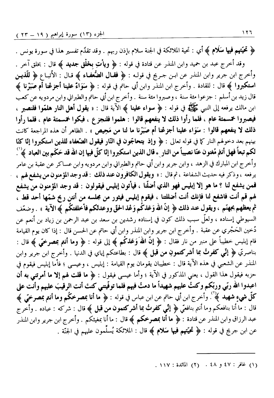 بِنَاصِرِيَّ إِنِّي كَفَرْتُ بِما أَشْرَكْتُمُونِ مِنْ قَبْلُ قَالَ: بِطَاعَتِكُمْ إِيَّايَ فِي الدُّنْيَا. وَأَخْرَجَ ابْنُ جَرِيرٍ وَابْنُ الْمُنْذِرِ عَنِ الشَّعْبِيِّ فِي هَذِهِ الْآيَةِ قَالَ: خَطِيبَانِ يَقُومَانِ يَوْمَ الْقِيَامَةِ: إِبْلِيسُ، وَعِيسَى فَأَمَّا إِبْلِيسُ فَيَقُومُ فِي حِزْبِهِ فَيَقُولُ هَذَا الْقَوْلَ، يَعْنِي الْمَذْكُورَ فِي الْآيَةِ وَأَمَّا عِيسَى فَيَقُولُ: مَا قُلْتُ لَهُمْ إِلَّا مَا أَمَرْتَنِي بِهِ أَنِ اعْبُدُوا اللَّهَ رَبِّي وَرَبَّكُمْ وَكُنْتُ عَلَيْهِمْ شَهِيداً مَا دُمْتُ فِيهِمْ فَلَمَّا تَوَفَّيْتَنِي كُنْتَ أَنْتَ الرَّقِيبَ عَلَيْهِمْ وَأَنْتَ عَلى كُلِّ شَيْءٍ شَهِيدٌ «2» . وَأَخْرَجَ ابْنُ أَبِي حَاتِمٍ عَنِ ابْنِ عَبَّاسٍ فِي قَوْلِهِ: مَا أَنَا بِمُصْرِخِكُمْ وَما أَنْتُمْ بِمُصْرِخِيَّ قَالَ: مَا أَنَا بِنَافِعِكُمْ وَمَا أَنْتُمْ بنافعيّ إِنِّي كَفَرْتُ بِما أَشْرَكْتُمُونِ مِنْ قَبْلُ قال: شركه: عباده. وَأَخْرَجَ عَبْدُ الرَّزَّاقِ وَابْنُ الْمُنْذِرِ عَنْ قَتَادَةَ: مَا أَنَا بِمُصْرِخِكُمْ قَالَ: مَا أَنَا بِمُغِيثِكُمْ. وَأَخْرَجَ ابْنُ جَرِيرٍ وَابْنُ الْمُنْذِرِ عَنِ ابْنِ جُرَيْجٍ فِي قَوْلِهِ: تَحِيَّتُهُمْ فِيها سَلامٌ قَالَ: الملائكة يسلّمون عليهم في الجنّة.