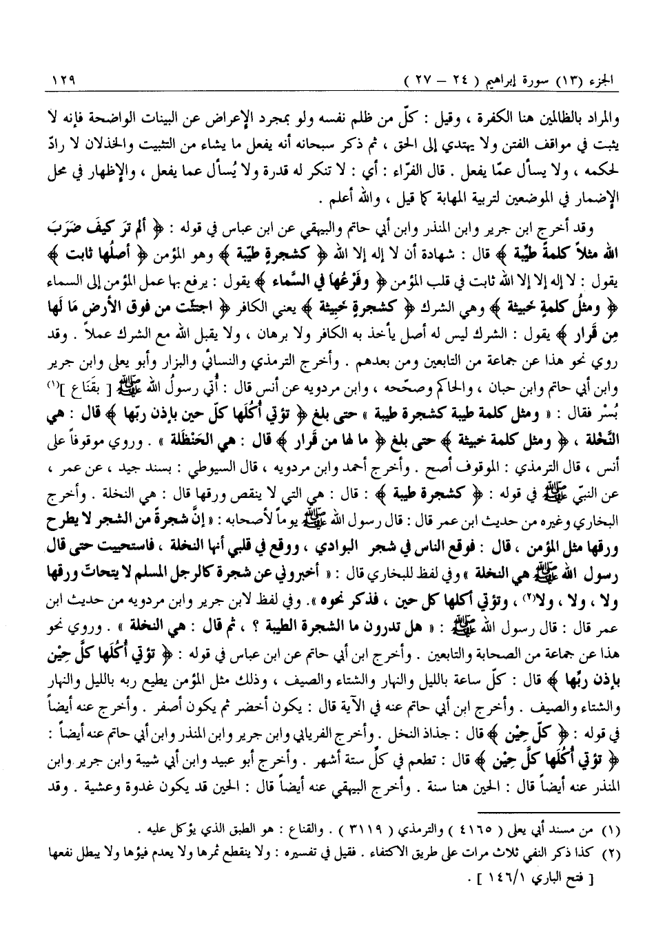 وَقَدْ أَخْرَجَ ابْنُ جَرِيرٍ وَابْنُ الْمُنْذِرِ وَابْنُ أَبِي حَاتِمٍ وَالْبَيْهَقِيُّ عَنِ ابْنِ عَبَّاسٍ فِي قَوْلِهِ: أَلَمْ تَرَ كَيْفَ ضَرَبَ اللَّهُ مَثَلًا كَلِمَةً طَيِّبَةً قَالَ: شَهَادَةَ أَنْ لَا إِلَهَ إِلَّا اللَّهُ كَشَجَرَةٍ طَيِّبَةٍ وَهُوَ الْمُؤْمِنُ أَصْلُها ثابِتٌ يَقُولُ: لَا إِلَهَ إِلَّا إِلَّا اللَّهُ ثَابِتٌ فِي قَلْبِ الْمُؤْمِنِ وَفَرْعُها فِي السَّماءِ يَقُولُ: يُرْفَعُ بِهَا عَمَلُ الْمُؤْمِنِ إِلَى السَّمَاءِ وَمَثَلُ كَلِمَةٍ خَبِيثَةٍ وَهِيَ الشِّرْكُ كَشَجَرَةٍ خَبِيثَةٍ يَعْنِي الْكَافِرَ اجْتُثَّتْ مِنْ فَوْقِ الْأَرْضِ مَا لَها مِنْ قَرارٍ يَقُولُ: الشِّرْكُ لَيْسَ لَهُ أَصْلٌ يَأْخُذُ بِهِ الْكَافِرُ وَلَا بُرْهَانٌ، وَلَا يَقْبَلُ اللَّهُ مَعَ الشِّرْكِ عَمَلًا. وَقَدْ رُوِيَ نَحْوُ هَذَا عَنْ جَمَاعَةٍ مِنَ التَّابِعِينَ وَمَنْ بَعْدَهُمْ. وَأَخْرَجَ التِّرْمِذِيُّ وَالنَّسَائِيُّ وَالْبَزَّارُ وَأَبُو يَعْلَى وَابْنُ جَرِيرٍ وَابْنُ أَبِي حَاتِمٍ وَابْنُ حِبَّانَ، وَالْحَاكِمُ وَصَحَّحَهُ، وَابْنُ مَرْدَوَيْهِ عَنْ أَنَسٍ قَالَ: أَتَى رَسُولَ اللَّهِ صَلَّى اللَّهُ عَلَيْهِ وَسَلَّمَ [بقناع] «1» بسر فقال: «ومثل كَلِمَةً طَيِّبَةً كَشَجَرَةٍ طَيِّبَةٍ» حَتَّى بَلَغَ تُؤْتِي أُكُلَها كُلَّ حِينٍ بِإِذْنِ رَبِّها قَالَ: هِيَ النَّخْلَةُ، وَمَثَلُ كَلِمَةٍ خَبِيثَةٍ حَتَّى بَلَغَ مَا لَها مِنْ قَرارٍ قَالَ: هِيَ الْحَنْظَلَةُ» . وَرُوِيَ مَوْقُوفًا عَلَى أَنَسٍ، قَالَ التِّرْمِذِيُّ: الْمَوْقُوفُ أَصَحُّ. وَأَخْرَجَ أَحْمَدُ وَابْنُ مَرْدَوَيْهِ، قَالَ السُّيُوطِيُّ: بِسَنَدٍ جَيِّدٍ، عَنْ عُمَرَ، عَنِ النَّبِيِّ صَلَّى اللَّهُ عَلَيْهِ وَسَلَّمَ فِي قَوْلِهِ: كَشَجَرَةٍ طَيِّبَةٍ: قَالَ: هِيَ الَّتِي لَا يَنْقُصُ وَرَقُهَا قَالَ: هِيَ النَّخْلَةُ. وَأَخْرَجَ الْبُخَارِيُّ وَغَيْرُهُ مِنْ حَدِيثِ ابْنِ عُمَرَ قَالَ: قَالَ رَسُولُ اللَّهِ صَلَّى اللَّهُ عَلَيْهِ وَسَلَّمَ يَوْمًا لِأَصْحَابِهِ: «إِنَّ شَجَرَةً مِنَ الشَّجَرِ لَا يَطَّرِحُ وَرَقُهَا مَثَلُ الْمُؤْمِنِ، قَالَ: فَوَقَعَ الناس في شجر الْبَوَادِي، وَوَقَعَ فِي قَلْبِي أَنَّهَا النَّخْلَةُ، فَاسْتَحْيَيْتُ حَتَّى قَالَ رَسُولُ اللَّهِ صَلَّى اللَّهُ عَلَيْهِ وَسَلَّمَ هِيَ النَّخْلَةُ» وَفِي لَفْظٍ لِلْبُخَارِيِّ قَالَ: «أَخْبِرُونِي عَنْ شَجَرَةٍ كَالرَّجُلِ الْمُسْلِمِ لَا يَتَحَاتُّ ورقها ولا، ولا، ولا «2» ، وتؤتي أُكُلَهَا كُلَّ حِينٍ، فَذَكَرَ نَحْوَهُ» . وَفِي لَفْظٍ لِابْنِ جَرِيرٍ وَابْنِ مَرْدَوَيْهِ مِنْ حَدِيثِ ابْنِ عُمَرَ قَالَ: قَالَ رَسُولُ اللَّهِ صَلَّى اللَّهُ عليه وَسَلَّمَ: «هَلْ تَدْرُونَ مَا الشَّجَرَةُ الطَّيِّبَةُ؟، ثُمَّ قَالَ: هِيَ النَّخْلَةُ» . وَرُوِيَ نَحْوُ هَذَا عَنْ جَمَاعَةٍ مِنَ الصَّحَابَةِ وَالتَّابِعِينَ. وَأَخْرَجَ ابْنُ أَبِي حَاتِمٍ عَنِ ابْنِ عَبَّاسٍ فِي قَوْلِهِ: تُؤْتِي أُكُلَها كُلَّ حِينٍ بِإِذْنِ رَبِّها قَالَ: كُلَّ سَاعَةٍ بِاللَّيْلِ وَالنَّهَارِ وَالشِّتَاءِ وَالصَّيْفِ، وَذَلِكَ مَثَلُ الْمُؤْمِنِ يُطِيعُ رَبَّهُ بِاللَّيْلِ وَالنَّهَارِ وَالشِّتَاءِ وَالصَّيْفِ. وَأَخْرَجَ ابْنُ أَبِي حَاتِمٍ عَنْهُ فِي الْآيَةِ قَالَ: يَكُونُ أَخْضَرَ ثُمَّ يَكُونُ أَصْفَرَ. وَأَخْرَجَ عَنْهُ أَيْضًا فِي قَوْلِهِ: كُلَّ حِينٍ قَالَ: جُذَاذُ النَّخْلِ. وَأَخْرَجَ الْفِرْيَابِيُّ وَابْنُ جَرِيرٍ وَابْنُ الْمُنْذِرِ وَابْنُ أَبِي حَاتِمٍ عَنْهُ أَيْضًا: