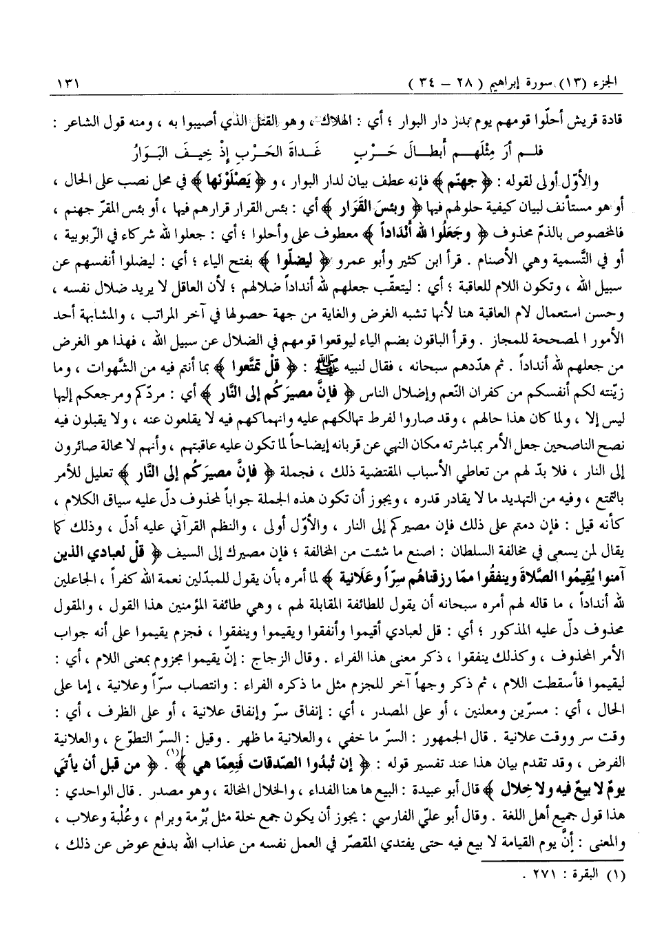 لِيُقِيمُوا فَأُسْقِطَتِ اللَّامُ، ثُمَّ ذَكَرَ وَجْهًا آخَرَ لِلْجَزْمِ مِثْلَ مَا ذَكَرَهُ الْفَرَّاءُ: وَانْتِصَابُ سِرًّا وَعَلَانِيَةً، إِمَّا عَلَى الْحَالِ، أَيْ: مُسِرِّينَ وَمُعْلِنِينَ، أَوْ عَلَى الْمَصْدَرِ، أَيْ: إِنْفَاقَ سِرٍّ وَإِنْفَاقَ عَلَانِيَةٍ، أَوْ عَلَى الظَّرْفِ، أَيْ: