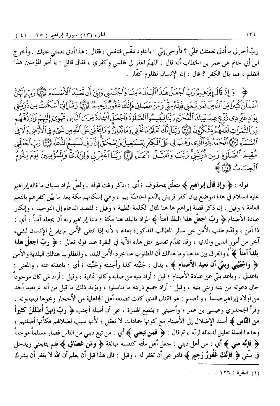 وَإِذْ قالَ إِبْراهِيمُ رَبِّ اجْعَلْ هَذَا الْبَلَدَ آمِناً وَاجْنُبْنِي وَبَنِيَّ أَنْ نَعْبُدَ الْأَصْنامَ (35) رَبِّ إِنَّهُنَّ أَضْلَلْنَ كَثِيراً مِنَ النَّاسِ فَمَنْ تَبِعَنِي فَإِنَّهُ مِنِّي وَمَنْ عَصانِي فَإِنَّكَ غَفُورٌ رَحِيمٌ (36) رَبَّنا إِنِّي أَسْكَنْتُ مِنْ ذُرِّيَّتِي بِوادٍ غَيْرِ ذِي زَرْعٍ عِنْدَ بَيْتِكَ الْمُحَرَّمِ رَبَّنا لِيُقِيمُوا الصَّلاةَ فَاجْعَلْ أَفْئِدَةً مِنَ النَّاسِ تَهْوِي إِلَيْهِمْ وَارْزُقْهُمْ مِنَ الثَّمَراتِ لَعَلَّهُمْ يَشْكُرُونَ (37) رَبَّنا إِنَّكَ تَعْلَمُ مَا نُخْفِي وَما نُعْلِنُ وَما يَخْفى عَلَى اللَّهِ مِنْ شَيْءٍ فِي الْأَرْضِ وَلا فِي السَّماءِ (38) الْحَمْدُ لِلَّهِ الَّذِي وَهَبَ لِي عَلَى الْكِبَرِ إِسْماعِيلَ وَإِسْحاقَ إِنَّ رَبِّي لَسَمِيعُ الدُّعاءِ (39)