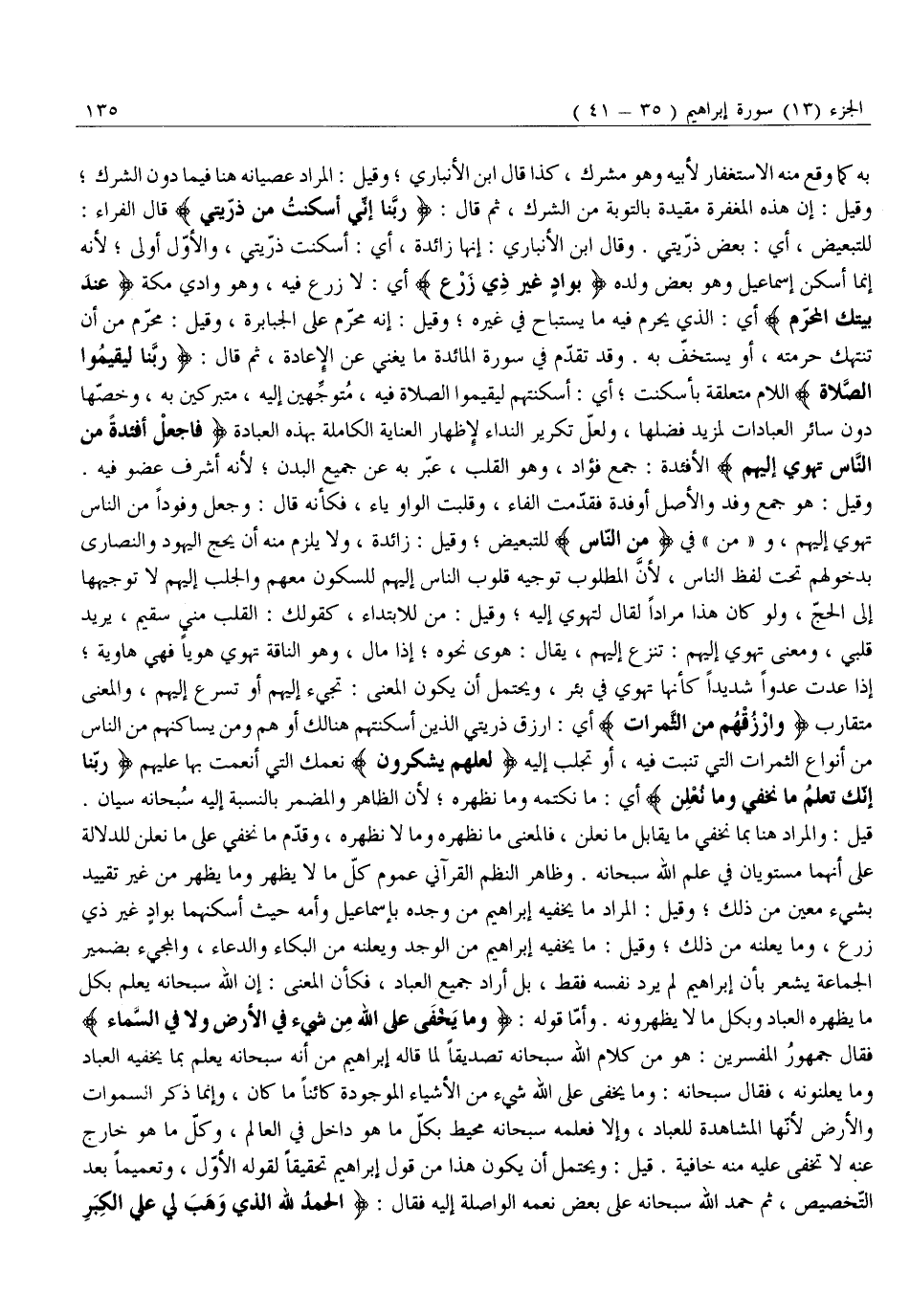 لِلتَّبْعِيضِ، أَيْ: بَعْضِ ذُرِّيَّتِي. وَقَالَ ابْنُ الْأَنْبَارِيِّ: إِنَّهَا زَائِدَةٌ، أَيْ: أَسْكَنْتُ ذُرِّيَّتِي، وَالْأَوَّلُ أَوْلَى لِأَنَّهُ إِنَّمَا أَسْكَنَ إِسْمَاعِيلَ وَهُوَ بَعْضُ وَلَدِهِ بِوادٍ غَيْرِ ذِي زَرْعٍ أَيْ: لَا زَرْعَ فِيهِ، وَهُوَ وَادِي مَكَّةَ عِنْدَ بَيْتِكَ الْمُحَرَّمِ أَيِ: الَّذِي يَحْرُمُ فِيهِ مَا يُسْتَبَاحُ فِي غَيْرِهِ وَقِيلَ: إِنَّهُ مُحَرَّمٌ عَلَى الْجَبَابِرَةِ، وَقِيلَ: مُحَرَّمٌ مِنْ أَنْ تُنْتَهَكَ حُرْمَتُهُ، أَوْ يُسْتَخَفَّ بِهِ. وَقَدْ تَقَدَّمَ فِي سُورَةِ الْمَائِدَةِ مَا يُغْنِي عَنِ الْإِعَادَةِ، ثُمَّ قَالَ: رَبَّنا لِيُقِيمُوا الصَّلاةَ اللام متعلقة بأسكنت أَيْ: أَسْكَنْتُهُمْ لِيُقِيمُوا الصَّلَاةَ فِيهِ، مُتَوَجِّهِينَ إِلَيْهِ، مُتَبَرِّكِينَ بِهِ، وَخَصَّهَا دُونَ سَائِرِ الْعِبَادَاتِ لِمَزِيدِ فَضْلِهَا، وَلَعَلَّ تَكْرِيرَ النِّدَاءِ لِإِظْهَارِ الْعِنَايَةِ الْكَامِلَةِ بِهَذِهِ الْعِبَادَةِ فَاجْعَلْ أَفْئِدَةً مِنَ النَّاسِ تَهْوِي إِلَيْهِمْ الْأَفْئِدَةُ: جَمْعُ فُؤَادٍ، وَهُوَ الْقَلْبُ، عُبِّرَ بِهِ عَنْ جَمِيعِ الْبَدَنِ لِأَنَّهُ أَشْرَفُ عُضْوٍ فِيهِ.