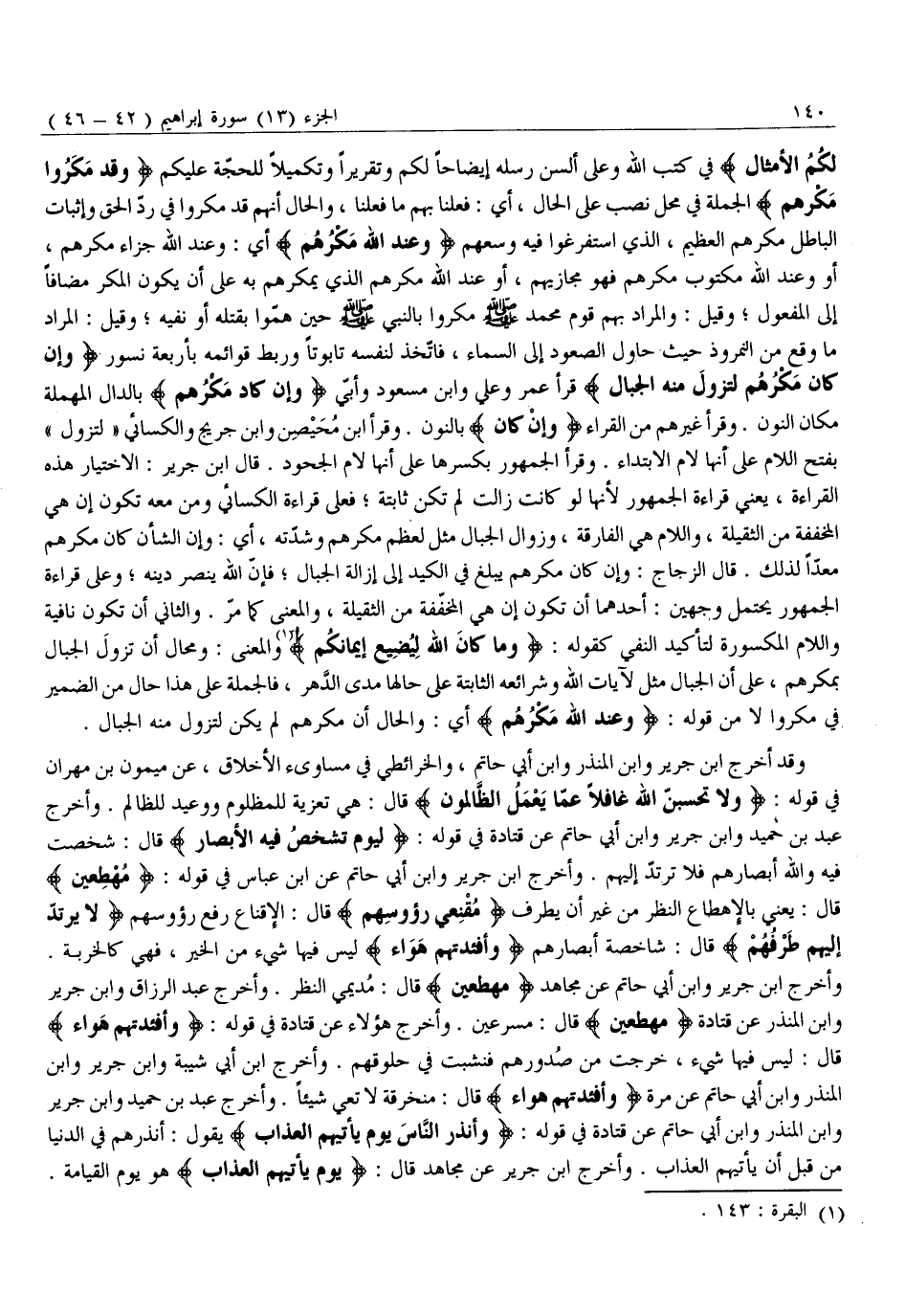 وَقَدْ أَخْرَجَ ابْنُ جَرِيرٍ وَابْنُ الْمُنْذِرِ وَابْنُ أَبِي حاتم، والخرائطي في مساوئ الْأَخْلَاقِ، عَنْ مَيْمُونِ بْنِ مِهْرَانَ فِي قَوْلِهِ: وَلا تَحْسَبَنَّ اللَّهَ غافِلًا عَمَّا يَعْمَلُ الظَّالِمُونَ قَالَ: هِيَ تَعْزِيَةٌ لِلْمَظْلُومِ وَوَعِيدٌ لِلظَّالِمِ. وَأَخْرَجَ عَبْدُ بْنُ حُمَيْدٍ وَابْنُ جَرِيرٍ وَابْنُ أَبِي حَاتِمٍ عَنْ قَتَادَةَ فِي قَوْلِهِ: لِيَوْمٍ تَشْخَصُ فِيهِ الْأَبْصارُ قَالَ: شَخَصَتْ فِيهِ وَاللَّهِ أَبْصَارُهُمْ فَلَا تَرْتَدُّ إِلَيْهِمْ. وَأَخْرَجَ ابْنُ جَرِيرٍ وَابْنُ أَبِي حَاتِمٍ عَنِ ابْنِ عَبَّاسٍ فِي قَوْلِهِ: مُهْطِعِينَ قَالَ: يَعْنِي بِالْإِهْطَاعِ النَّظَرَ مِنْ غَيْرِ أن يطرف مُقْنِعِي رُؤُسِهِمْ قال: الإقناع رفع رؤوسهم لَا يَرْتَدُّ إِلَيْهِمْ طَرْفُهُمْ قَالَ: شَاخِصَةٌ أَبْصَارُهُمْ وَأَفْئِدَتُهُمْ هَواءٌ لَيْسَ فِيهَا شَيْءٌ مِنَ الْخَيْرِ، فَهِيَ كَالْخَرِبَةِ.