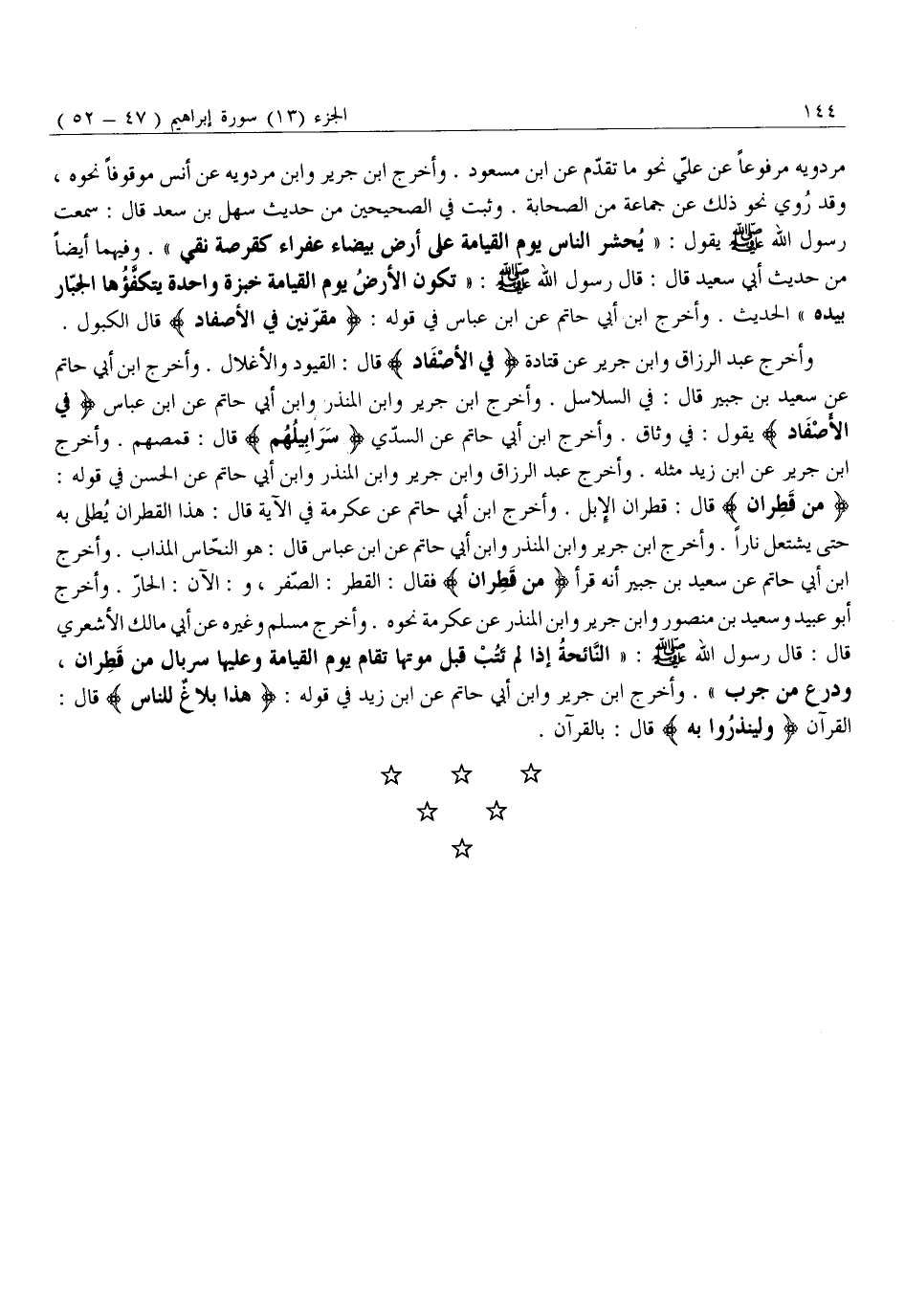 مِنْ قَطِرانٍ قَالَ: قَطِرَانِ الْإِبِلِ. وَأَخْرَجَ ابْنُ أَبِي حَاتِمٍ عَنْ عِكْرِمَةَ فِي الْآيَةِ قَالَ: هَذَا الْقَطِرَانُ يُطْلَى بِهِ حَتَّى يَشْتَعِلَ نَارًا. وَأَخْرَجَ ابْنُ جَرِيرٍ وَابْنُ الْمُنْذِرِ وَابْنُ أَبِي حَاتِمٍ عَنِ ابْنِ عَبَّاسٍ قَالَ: هُوَ النُّحَاسُ الْمُذَابُ. وَأَخْرَجَ ابْنُ أَبِي حَاتِمٍ عَنْ سَعِيدِ بْنِ جُبَيْرٍ أَنَّهُ قَرَأَ مِنْ قَطِرانٍ فقال: القطر: الصّفر، و: الآن: الْحَارُّ. وَأَخْرَجَ أَبُو عُبَيْدٍ وَسَعِيدُ بْنُ مَنْصُورٍ وَابْنُ جَرِيرٍ وَابْنُ الْمُنْذِرِ عَنْ عِكْرِمَةَ نَحْوَهُ. وَأَخْرَجَ مُسْلِمٌ وَغَيْرُهُ عَنْ أَبِي مَالِكٍ الْأَشْعَرِيِّ قَالَ: قَالَ رَسُولُ اللَّهِ صَلَّى اللَّهُ عَلَيْهِ وَسَلَّمَ: «النَّائِحَةُ إِذَا لَمْ تَتُبْ قَبْلَ مَوْتِهَا تُقَامُ يَوْمَ الْقِيَامَةِ وَعَلَيْهَا سِرْبَالٌ مِنْ قَطِرَانٍ، وَدِرْعٌ مَنْ جَرَبٍ» . وَأَخْرَجَ ابْنُ جَرِيرٍ وَابْنُ أَبِي حَاتِمٍ عَنِ ابْنِ زَيْدٍ فِي قَوْلِهِ: هَذَا بَلاغٌ لِلنَّاسِ قَالَ: