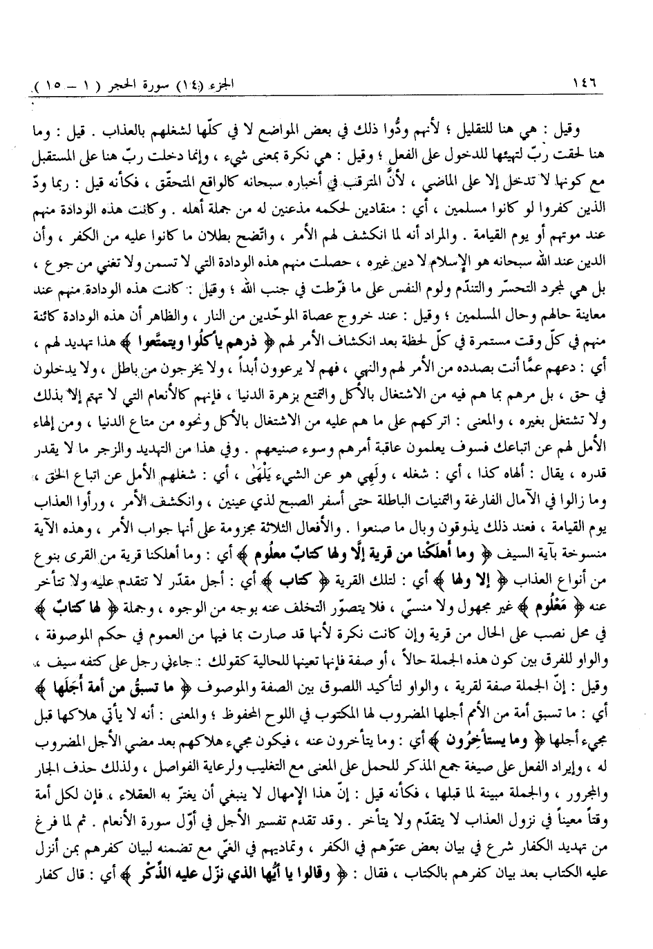 وَقِيلَ: هِيَ هُنَا لِلتَّقْلِيلِ لِأَنَّهُمْ وَدُّوا ذَلِكَ فِي بَعْضِ الْمَوَاضِعِ لَا فِي كُلِّهَا لِشُغْلِهِمْ بالعذاب. قيل: وما هُنَا لَحِقَتْ رُبَّ لِتُهَيِّئَهَا لِلدُّخُولِ عَلَى الْفِعْلِ وَقِيلَ: هِيَ نَكِرَةٌ بِمَعْنَى شَيْءٍ، وَإِنَّمَا دَخَلَتْ رُبَّ هُنَا عَلَى الْمُسْتَقْبَلِ مَعَ كَوْنِهَا لَا تَدْخُلُ إِلَّا عَلَى الْمَاضِي، لِأَنَّ الْمُتَرَقَّبَ فِي إِخْبَارِهِ سُبْحَانَهُ كَالْوَاقِعِ الْمُتَحَقِّقِ، فَكَأَنَّهُ قِيلَ: رُبَمَا وَدَّ الَّذِينَ كَفَرُوا لَوْ كَانُوا مُسْلِمِينَ، أَيْ: مُنْقَادِينَ لِحُكْمِهِ مُذْعِنِينَ لَهُ مِنْ جُمْلَةِ أَهْلِهِ. وَكَانَتْ هَذِهِ الْوِدَادَةُ مِنْهُمْ عِنْدَ مَوْتِهِمْ أَوْ يَوْمَ الْقِيَامَةِ. وَالْمُرَادُ أَنَّهُ لَمَّا انْكَشَفَ لَهُمُ الْأَمْرُ، وَاتَّضَحَ بُطْلَانُ مَا كَانُوا عَلَيْهِ مِنَ الْكُفْرِ، وَأَنَّ الدِّينَ عِنْدَ اللَّهِ سُبْحَانَهُ هُوَ الْإِسْلَامُ لَا دِينَ غَيْرُهُ، حَصَلَتْ مِنْهُمْ هَذِهِ الْوِدَادَةُ الَّتِي لَا تُسْمِنُ وَلَا تُغْنِي مِنْ جُوعٍ، بَلْ هِيَ لِمُجَرَّدِ التَّحَسُّرِ وَالتَّنَدُّمِ وَلَوْمِ النَّفْسِ عَلَى مَا فَرَّطَتْ فِي جَنْبِ اللَّهِ وَقِيلَ: كَانَتْ هَذِهِ الْوِدَادَةُ مِنْهُمْ عِنْدَ مُعَايَنَةِ حَالِهِمْ وَحَالِ الْمُسْلِمِينَ وَقِيلَ: عِنْدَ خُرُوجِ عُصَاةِ الْمُوَحِّدِينَ مِنَ النَّارِ، وَالظَّاهِرُ أَنَّ هَذِهِ الْوِدَادَةَ كَائِنَةٌ مِنْهُمْ فِي كُلِّ وَقْتٍ مُسْتَمِرَّةٌ فِي كُلِّ لَحْظَةٍ بَعْدَ انْكِشَافِ الْأَمْرِ لَهُمْ ذَرْهُمْ يَأْكُلُوا وَيَتَمَتَّعُوا هَذَا تَهْدِيدٌ لَهُمْ، أَيْ: دَعْهُمْ عَمَّا أَنْتَ بِصَدَدِهِ مِنَ الْأَمْرِ لَهُمْ وَالنَّهْيِ، فَهُمْ لَا يَرْعَوُونَ أَبَدًا، وَلَا يَخْرُجُونَ مِنْ بَاطِلٍ، وَلَا يَدْخُلُونَ فِي حَقٍّ، بَلْ مُرْهُمْ بِمَا هُمْ فِيهِ مِنَ الِاشْتِغَالِ بِالْأَكْلِ وَالتَّمَتُّعِ بِزَهْرَةِ الدُّنْيَا، فَإِنَّهُمْ كَالْأَنْعَامِ الَّتِي لَا تَهْتَمُّ إِلَّا بِذَلِكَ وَلَا تَشْتَغِلُ بِغَيْرِهِ، وَالْمَعْنَى: اتْرُكْهُمْ عَلَى مَا هُمْ عَلَيْهِ مِنَ الِاشْتِغَالِ بِالْأَكْلِ وَنَحْوِهِ مِنْ مَتَاعِ الدُّنْيَا، وَمِنْ إِلْهَاءِ الْأَمَلِ لَهُمْ عَنِ اتِّبَاعِكَ فَسَوْفَ يَعْلَمُونَ عَاقِبَةَ أَمْرِهِمْ وَسُوءَ صَنِيعِهِمْ. وَفِي هَذَا مِنَ التَّهْدِيدِ وَالزَّجْرِ مَا لَا يُقَدَّرُ قَدَرُهُ، يُقَالُ: أَلْهَاهُ كَذَا، أي: شغله، ولهي هو عن الشيء يلهى، أَيْ: شَغَلَهُمُ الْأَمَلُ عَنِ اتِّبَاعِ الْحَقِّ، وَمَا زَالُوا فِي الْآمَالِ الْفَارِغَةِ وَالتَّمَنِّيَاتِ الْبَاطِلَةِ حَتَّى أَسْفَرَ الصُّبْحُ لِذِي عَيْنَيْنِ، وَانْكَشَفَ الْأَمْرُ، وَرَأَوُا الْعَذَابَ يَوْمَ الْقِيَامَةِ، فَعِنْدَ ذَلِكَ يَذُوقُونَ وَبَالَ مَا صَنَعُوا. وَالْأَفْعَالُ الثَّلَاثَةُ مَجْزُومَةٌ عَلَى أَنَّهَا جَوَابُ الْأَمْرِ، وَهَذِهِ الْآيَةُ مَنْسُوخَةٌ بِآيَةِ السَّيْفِ وَما أَهْلَكْنا مِنْ قَرْيَةٍ إِلَّا وَلَها كِتابٌ مَعْلُومٌ أَيْ: وَمَا أَهْلَكْنَا قَرْيَةً مِنَ الْقُرَى بِنَوْعٍ مِنْ أَنْوَاعِ الْعَذَابِ إِلَّا وَلَها أَيْ: لِتِلْكَ الْقَرْيَةِ كِتابٌ أَيْ: أَجْلٌ مُقَدَّرٌ لَا تَتَقَدَّمُ عَلَيْهِ وَلَا تَتَأَخَّرُ عَنْهُ مَعْلُومٌ غَيْرُ مَجْهُولٍ وَلَا مَنْسِيٍّ، فَلَا يُتَصَوَّرُ التَّخَلُّفُ عَنْهُ بِوَجْهٍ مِنَ الْوُجُوهِ، وَجُمْلَةُ لَها كِتابٌ فِي مَحَلِّ نَصْبٍ عَلَى الْحَالِ مِنْ قَرْيَةٍ وَإِنْ كَانَتْ نَكِرَةً لِأَنَّهَا قَدْ صَارَتْ بِمَا فِيهَا مِنَ الْعُمُومِ فِي حُكْمِ الْمَوْصُوفَةِ، وَالْوَاوُ لِلْفَرْقِ بَيْنَ كَوْنِ هَذِهِ الْجُمْلَةِ حَالًا، أَوْ صِفَةً فإنها تعينها للحالية كقولك: جاءني رَجُل
