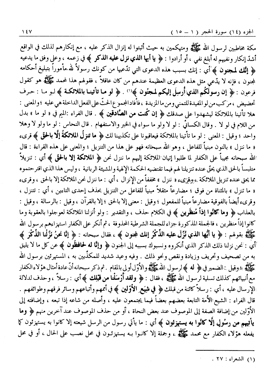 بِالْعَذَابِ وَما كانُوا إِذاً مُنْظَرِينَ فِي الْكَلَامِ حَذْفٌ، وَالتَّقْدِيرُ: وَلَوْ أَنْزَلْنَا الْمَلَائِكَةَ لَعُوجِلُوا بِالْعُقُوبَةِ وَمَا كَانُوا إِذًا مُنْظَرِينَ، فَالْجُمْلَةُ الْمَذْكُورَةُ جَزَاءٌ لِلْجُمْلَةِ الشَّرْطِيَّةِ الْمَحْذُوفَةِ، ثُمَّ أَنْكَرَ عَلَى الْكُفَّارِ اسْتِهْزَاءَهُمْ بِرَسُولِ اللَّهِ صَلَّى اللَّهُ عليه وسلّم بقولهم: يَا أَيُّهَا الَّذِي نُزِّلَ عَلَيْهِ الذِّكْرُ إِنَّكَ لَمَجْنُونٌ، فَقَالَ سُبْحَانَهُ: إِنَّا نَحْنُ نَزَّلْنَا الذِّكْرَ أَيْ: نَحْنُ نَزَّلْنَا ذَلِكَ الذِّكْرَ الَّذِي أَنْكَرُوهُ وَنَسَبُوكَ بِسَبَبِهِ إِلَى الْجُنُونِ وَإِنَّا لَهُ لَحافِظُونَ عَنْ كُلِّ مَا لَا يَلِيقُ بِهِ مِنْ تَصْحِيفٍ وَتَحْرِيفٍ وَزِيَادَةٍ وَنَقْصٍ وَنَحْوِ ذَلِكَ. وَفِيهِ وَعِيدٌ شَدِيدٌ لِلْمُكَذِّبِينَ بِهِ، الْمُسْتَهْزِئِينَ بِرَسُولِ اللَّهِ صَلَّى اللَّهُ عَلَيْهِ وَسَلَّمَ وَقِيلَ: الضَّمِيرُ فِي لَهُ لِرَسُولِ اللَّهِ صلّى الله عليه وَسَلَّمَ وَالْأَوَّلُ أَوْلَى بِالْمَقَامِ. ثُمَّ ذَكَرَ سُبْحَانَهُ أَنَّ عَادَةَ أَمْثَالِ هَؤُلَاءِ الْكُفَّارِ مَعَ أَنْبِيَائِهِمْ كَذَلِكَ تَسْلِيَةٌ لِرَسُولِ اللَّهِ صَلَّى اللَّهُ عَلَيْهِ وَسَلَّمَ، فَقَالَ: وَلَقَدْ أَرْسَلْنا مِنْ قَبْلِكَ أَيْ: رُسُلًا، وَحُذِفَ لِدِلَالَةِ الْإِرْسَالِ عَلَيْهِ، أَيْ: رُسُلًا كَائِنَةً مِنْ قَبْلِكَ فِي شِيَعِ الْأَوَّلِينَ فِي أُمَمِهِمْ وَأَتْبَاعِهِمْ وَسَائِرِ فِرَقِهِمْ وَطَوَائِفِهِمْ.