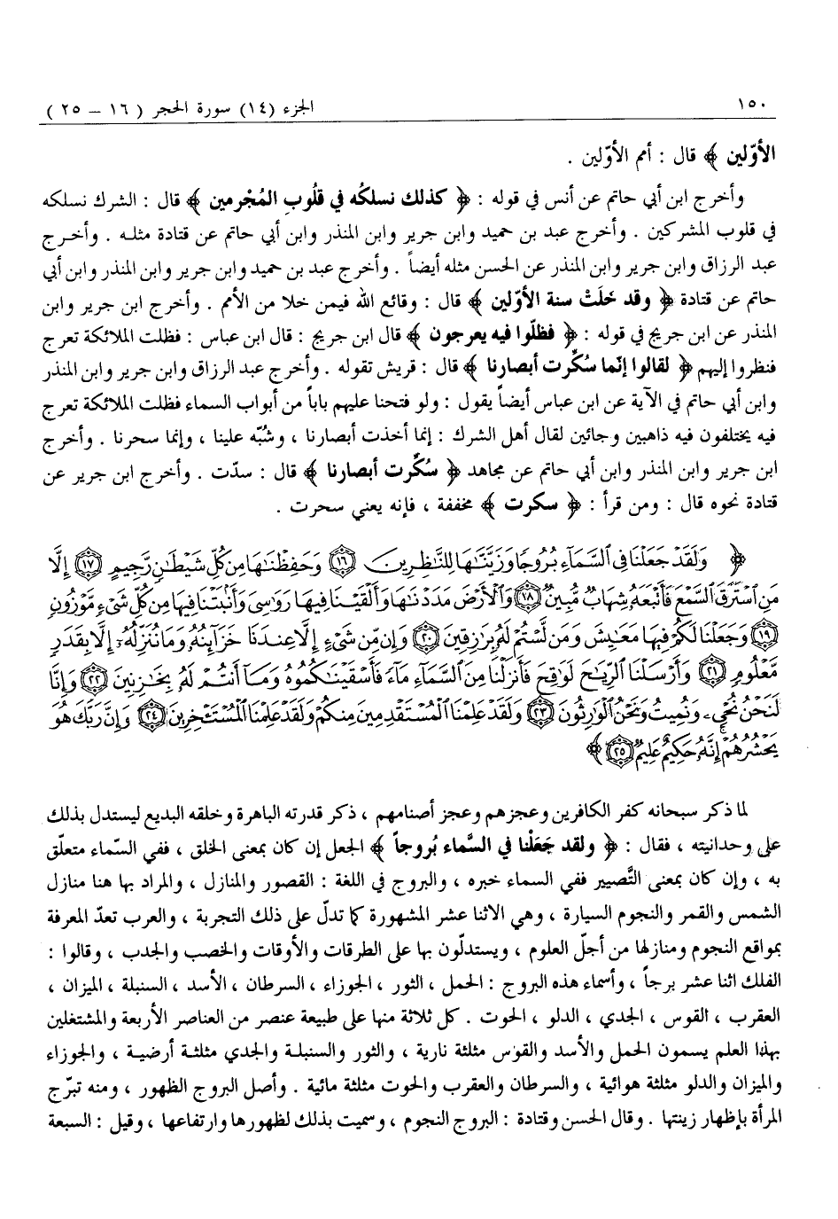 وَأَخْرَجَ ابْنُ أَبِي حَاتِمٍ عَنْ أَنَسٍ فِي قَوْلِهِ: كَذلِكَ نَسْلُكُهُ فِي قُلُوبِ الْمُجْرِمِينَ قَالَ: الشِّرْكُ نَسْلُكُهُ فِي قُلُوبِ الْمُشْرِكِينَ. وَأَخْرَجَ عَبْدُ بْنُ حُمَيْدٍ وَابْنُ جَرِيرٍ وَابْنُ المنذر وابن أبي حاتم عن قَتَادَةَ مِثْلَهُ. وَأَخْرَجَ عَبْدُ الرَّزَّاقِ وَابْنُ جَرِيرٍ وَابْنُ الْمُنْذِرِ عَنِ الْحَسَنِ مِثْلَهُ أَيْضًا. وَأَخْرَجَ عَبْدُ بْنُ حُمَيْدٍ وَابْنُ جَرِيرٍ وَابْنُ الْمُنْذِرِ وَابْنُ أَبِي حَاتِمٍ عَنْ قَتَادَةَ وَقَدْ خَلَتْ سُنَّةُ الْأَوَّلِينَ قَالَ: وَقَائِعُ اللَّهِ فِيمَنْ خَلَا مِنَ الْأُمَمِ. وَأَخْرَجَ ابْنُ جَرِيرٍ وَابْنُ الْمُنْذِرِ عَنِ ابْنِ جُرَيْجٍ فِي قَوْلِهِ: فَظَلُّوا فِيهِ يَعْرُجُونَ قَالَ ابْنُ جُرَيْجٍ: قَالَ ابْنُ عَبَّاسٍ: فَظَلَّتِ الْمَلَائِكَةُ تَعْرُجُ فَنَظَرُوا إِلَيْهِمْ لَقالُوا إِنَّما سُكِّرَتْ أَبْصارُنا قَالَ: قُرَيْشٌ تَقُولُهُ. وَأَخْرَجَ عَبْدُ الرَّزَّاقِ وَابْنُ جَرِيرٍ وَابْنُ الْمُنْذِرِ وَابْنُ أَبِي حَاتِمٍ فِي الْآيَةِ عَنِ ابْنِ عَبَّاسٍ أَيْضًا يَقُولُ: وَلَوْ فَتَحْنَا عَلَيْهِمْ بَابًا مِنْ أَبْوَابِ السَّمَاءِ فَظَلَّتِ الْمَلَائِكَةُ تَعْرُجُ فِيهِ يَخْتَلِفُونَ فِيهِ ذاهبين وجائين لقال أهل الشرك: إنما أخذت أَبْصَارُنَا، وَشُبِّهَ عَلَيْنَا، وَإِنَّمَا سُحِرْنَا. وَأَخْرَجَ ابْنُ جَرِيرٍ وَابْنُ الْمُنْذِرِ وَابْنُ أَبِي حاتم عن مُجَاهِدٍ سُكِّرَتْ أَبْصارُنا قَالَ: سُدَّتْ. وَأَخْرَجَ ابْنُ جَرِيرٍ عَنْ قَتَادَةَ نَحْوَهُ قَالَ: وَمَنْ قَرَأَ: سُكِّرَتْ مخففة، فإنه يعني سحرت.