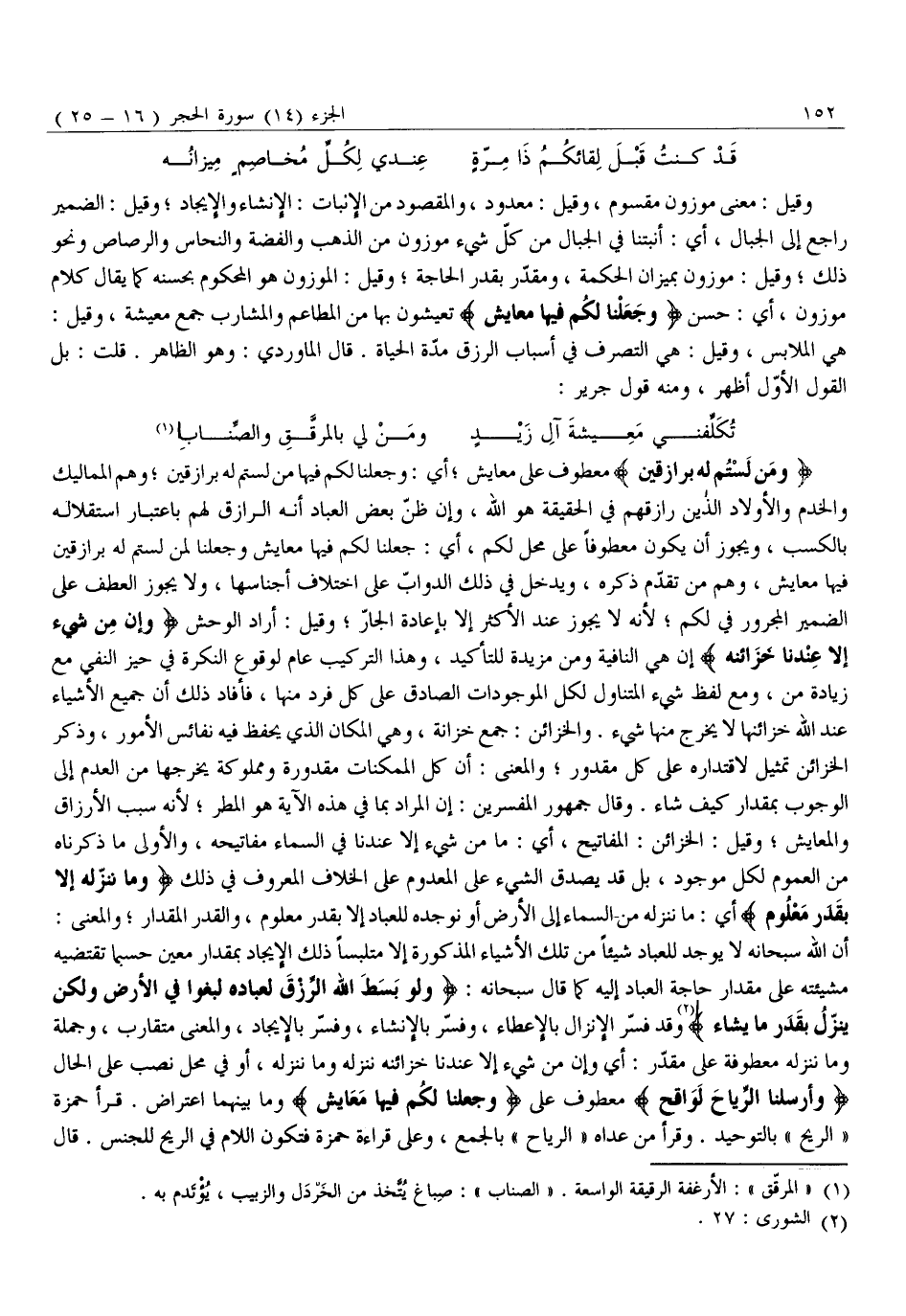 وَقِيلَ: مَعْنَى مَوْزُونٍ مَقْسُومٍ، وقيل: معدود، والمقصود من الإنبات: الْإِنْشَاءُ وَالْإِيجَادُ وَقِيلَ: الضَّمِيرُ رَاجِعٌ إِلَى الْجِبَالِ، أَيْ: أَنْبَتْنَا فِي الْجِبَالِ مِنْ كُلِّ شَيْءٍ مَوْزُونٍ مِنَ الذَّهَبِ وَالْفِضَّةِ وَالنُّحَاسِ وَالرَّصَاصِ وَنَحْوِ ذَلِكَ وَقِيلَ: مَوْزُونٌ بِمِيزَانِ الْحِكْمَةِ، وَمُقَدَّرٌ بِقَدَرِ الْحَاجَةِ وَقِيلَ: الْمَوْزُونُ هُوَ الْمَحْكُومُ بِحُسْنِهِ كَمَا يُقَالُ كَلَامٌ مَوْزُونٌ، أَيْ: حَسَنٌ وَجَعَلْنا لَكُمْ فِيها مَعايِشَ تَعِيشُونَ بِهَا مِنَ الْمَطَاعِمِ وَالْمَشَارِبِ جَمْعُ مَعِيشَةٍ، وَقِيلَ: