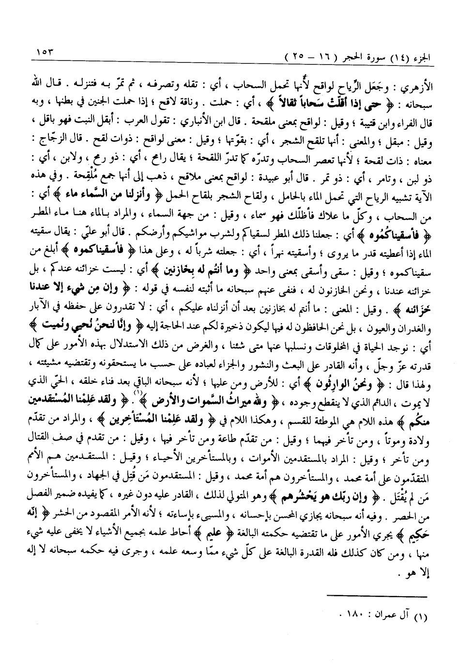 مِنَ السَّحَابِ، وَكُلُّ مَا عَلَاكَ فَأَظَلَّكَ فَهُوَ سَمَاءٌ، وَقِيلَ: مِنْ جِهَةِ السَّمَاءِ، وَالْمُرَادُ بِالْمَاءِ هُنَا مَاءُ الْمَطَرِ فَأَسْقَيْناكُمُوهُ أَيْ: جَعَلْنَا ذَلِكَ الْمَطَرَ لَسُقْيَاكُمْ وَلِشُرْبِ مَوَاشِيكُمْ وَأَرْضِكُمْ. قَالَ أَبُو عَلِيٍّ: يُقَالُ سَقَيْتُهُ الْمَاءَ إِذَا أَعْطَيْتَهُ قَدْرَ مَا يَرْوِي وَأَسْقَيْتُهُ نَهْرًا، أَيْ: جَعَلْتَهُ شِرْبًا لَهُ، وَعَلَى هَذَا فَأَسْقَيْناكُمُوهُ أَبْلَغُ مِنْ سَقَيْنَاكُمُوهُ وَقِيلَ: سَقَى وَأَسْقَى بِمَعْنًى وَاحِدٍ وَما أَنْتُمْ لَهُ بِخازِنِينَ أَيْ: لَيْسَتْ خَزَائِنُهُ عِنْدَكُمْ، بَلْ خَزَائِنُهُ عِنْدَنَا، وَنَحْنُ الْخَازِنُونَ لَهُ، فَنَفَى عَنْهُمْ سُبْحَانَهُ مَا أَثْبَتَهُ لِنَفْسِهِ فِي قَوْلِهِ: وَإِنْ مِنْ شَيْءٍ إِلَّا عِنْدَنا خَزائِنُهُ. وقيل: المعنى: مَا أَنْتُمْ لَهُ بِخَازِنِينَ بَعْدَ أَنْ أَنْزَلْنَاهُ عَلَيْكُمْ، أَيْ: لَا تَقْدِرُونَ عَلَى حِفْظِهِ فِي الْآبَارِ وَالْغُدْرَانِ وَالْعُيُونِ، بَلْ نَحْنُ الْحَافِظُونَ لَهُ فِيهَا لِيَكُونَ ذَخِيرَةً لَكُمْ عِنْدَ الْحَاجَةِ إِلَيْهِ وَإِنَّا لَنَحْنُ نُحْيِي وَنُمِيتُ أَيْ: نُوجِدُ الْحَيَاةَ فِي الْمَخْلُوقَاتِ وَنَسْلُبُهَا عَنْهَا مَتَى شِئْنَا، وَالْغَرَضُ مِنْ ذَلِكَ الِاسْتِدْلَالُ بِهَذِهِ الْأُمُورِ عَلَى كَمَالِ قُدْرَتِهِ عَزَّ وَجَلَّ، وَأَنَّهُ الْقَادِرُ عَلَى الْبَعْثِ وَالنُّشُورِ وَالْجَزَاءِ لِعِبَادِهِ عَلَى حَسَبِ مَا يَسْتَحِقُّونَهُ وَتَقْتَضِيهِ مَشِيئَتُهُ، وَلِهَذَا قَالَ: وَنَحْنُ الْوارِثُونَ أَيْ: لِلْأَرْضِ وَمَنْ عَلَيْهَا لِأَنَّهُ سُبْحَانَهُ الْبَاقِي بَعْدَ فَنَاءِ خَلْقِهِ، الْحَيُّ الَّذِي لَا يَمُوتُ، الدَّائِمُ الَّذِي لَا يَنْقَطِعُ وُجُودُهُ، وَلِلَّهِ مِيراثُ السَّماواتِ وَالْأَرْضِ «1» . وَلَقَدْ عَلِمْنَا الْمُسْتَقْدِمِينَ مِنْكُمْ هَذِهِ اللَّامُ هِيَ الْمُوَطِّئَةُ لِلْقَسَمِ، وَهَكَذَا اللَّامُ فِي وَلَقَدْ عَلِمْنَا الْمُسْتَأْخِرِينَ، وَالْمُرَادُ مَنْ تَقَدَّمَ وِلَادَةً وَمَوْتًا، وَمَنْ تَأَخَّرَ فِيهِمَا وَقِيلَ: مَنْ تَقَدَّمَ طَاعَةً وَمَنْ تَأَخَّرَ فِيهَا، وَقِيلَ: مِنْ تَقَدَّمَ فِي صَفِّ الْقِتَالِ وَمَنْ تَأَخَّرَ وَقِيلَ: الْمُرَادُ بِالْمُسْتَقْدِمِينَ الْأَمْوَاتُ، وَبِالْمُسْتَأْخِرِينَ الْأَحْيَاءُ وَقِيلَ: الْمُسْتَقْدِمِينَ هُمُ الْأُمَمُ الْمُتَقَدِّمُونَ عَلَى أُمَّةِ مُحَمَّدٍ، وَالْمُسْتَأْخِرُونَ هُمْ أُمَّةُ مُحَمَّدٍ، وَقِيلَ: الْمُسْتَقْدِمُونَ مَنْ قُتِلَ فِي الْجِهَادِ، وَالْمُسْتَأْخِرُونَ مَنْ لَمْ يُقْتَلْ. وَإِنَّ رَبَّكَ هُوَ يَحْشُرُهُمْ وهو الْمُتَوَلِّي لِذَلِكَ، الْقَادِرُ عَلَيْهِ دُونَ غَيْرِهِ، كَمَا يُفِيدُهُ ضَمِيرُ الْفَصْلِ مِنَ الْحَصْرِ. وَفِيهِ أَنَّهُ سبحانه يجازي المحسن بإحسانه، والمسيئ بِإِسَاءَتِهِ لِأَنَّهُ الْأَمْرُ الْمَقْصُودُ مِنَ الْحَشْرِ إِنَّهُ حَكِيمٌ يُجْرِي الْأُمُورَ عَلَى مَا تَقْتَضِيهِ حِكْمَتُهُ الْبَالِغَةُ عَلِيمٌ أَحَاطَ عِلْمُهُ بِجَمِيعِ الْأَشْيَاءِ لَا يَخْفَى عَلَيْهِ شَيْءٌ مِنْهَا، وَمَنْ كَانَ كَذَلِكَ فَلَهُ الْقُدْرَةُ الْبَالِغَةُ عَلَى كُلِّ شَيْءٍ مِمَّا وَسِعَهُ عِلْمُهُ، وَجَرَى فِيهِ حُكْمُهُ سُبْحَانَهُ لَا إله إلا هو.