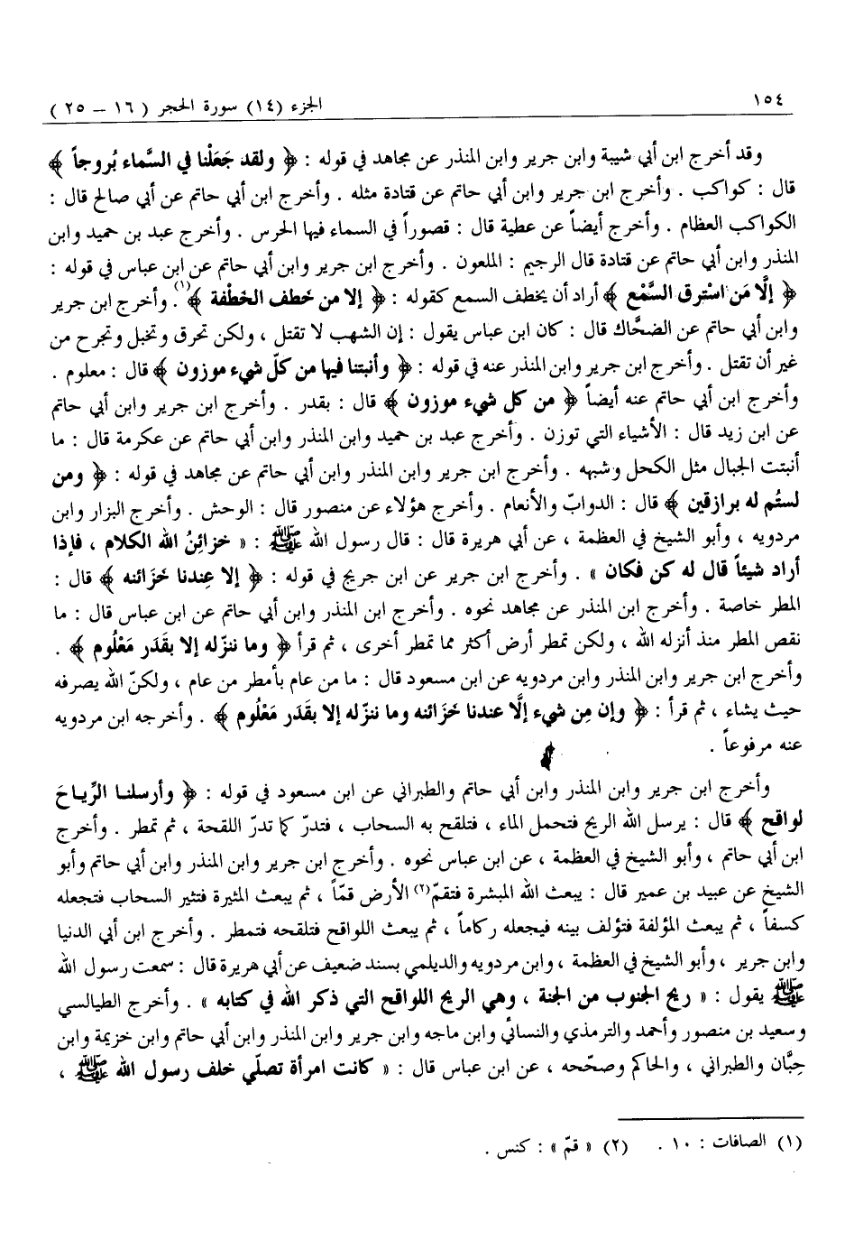 وَأَخْرَجَ ابْنُ أَبِي حَاتِمٍ عَنْهُ أَيْضًا مِنْ كُلِّ شَيْءٍ مَوْزُونٍ قَالَ: بِقَدَرٍ. وَأَخْرَجَ ابْنُ جَرِيرٍ وَابْنُ أَبِي حَاتِمٍ عَنِ ابْنِ زَيْدٍ قَالَ: الْأَشْيَاءُ الَّتِي تُوزَنُ. وَأَخْرَجَ عَبْدُ بْنُ حُمَيْدٍ وَابْنُ الْمُنْذِرِ وَابْنُ أَبِي حَاتِمٍ عَنْ عِكْرِمَةَ قَالَ: مَا أَنْبَتَتِ الْجِبَالُ مِثْلَ الْكُحْلِ وَشِبْهِهِ. وَأَخْرَجَ ابْنُ جَرِيرٍ وَابْنُ الْمُنْذِرِ وَابْنُ أَبِي حَاتِمٍ عَنْ مُجَاهِدٍ فِي قَوْلِهِ: وَمَنْ لَسْتُمْ لَهُ بِرازِقِينَ قَالَ: الدَّوَابُّ وَالْأَنْعَامُ. وَأَخْرَجَ هَؤُلَاءِ عَنْ مَنْصُورٍ قَالَ: الْوَحْشُ. وَأَخْرَجَ الْبَزَّارُ وَابْنُ مَرْدَوَيْهِ، وَأَبُو الشَّيْخِ فِي الْعَظَمَةِ، عَنْ أَبِي هُرَيْرَةَ قَالَ: قَالَ رَسُولُ اللَّهِ صَلَّى اللَّهُ عليه وَسَلَّمَ: «خَزَائِنُ اللَّهِ الْكَلَامُ، فَإِذَا أَرَادَ شَيْئًا قَالَ لَهُ كُنْ فَكَانَ» . وَأَخْرَجَ ابْنُ جَرِيرٍ عَنِ ابْنِ جُرَيْجٍ فِي قَوْلِهِ: إِلَّا عِنْدَنا خَزائِنُهُ قَالَ: