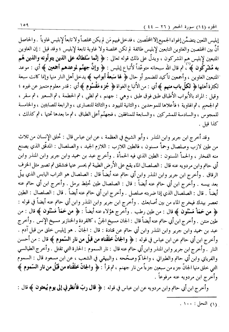 مِنْ حَمَإٍ مَسْنُونٍ قَالَ: مِنْ طِينٍ رَطْبٍ. وَأَخْرَجَ هَؤُلَاءِ عَنْهُ أَيْضًا: مِنْ حَمَإٍ مَسْنُونٍ قَالَ: مِنْ طِينٍ مُنْتِنٍ. وَأَخْرَجَ ابْنُ أَبِي حَاتِمٍ عَنْهُ أَيْضًا قَالَ: الْجَانُّ مَسِيخُ الْجِنِّ، كَالْقِرَدَةِ وَالْخَنَازِيرِ مَسِيخُ الْإِنْسِ. وَأَخْرَجَ عَبْدُ بْنُ حُمَيْدٍ وَابْنُ جَرِيرٍ وَابْنُ الْمُنْذِرِ وَابْنُ أَبِي حَاتِمٍ عَنْ قَتَادَةَ: قَالَ: الْجَانُّ. هُوَ إِبْلِيسُ خُلِقَ مِنْ قَبْلِ آدَمَ.