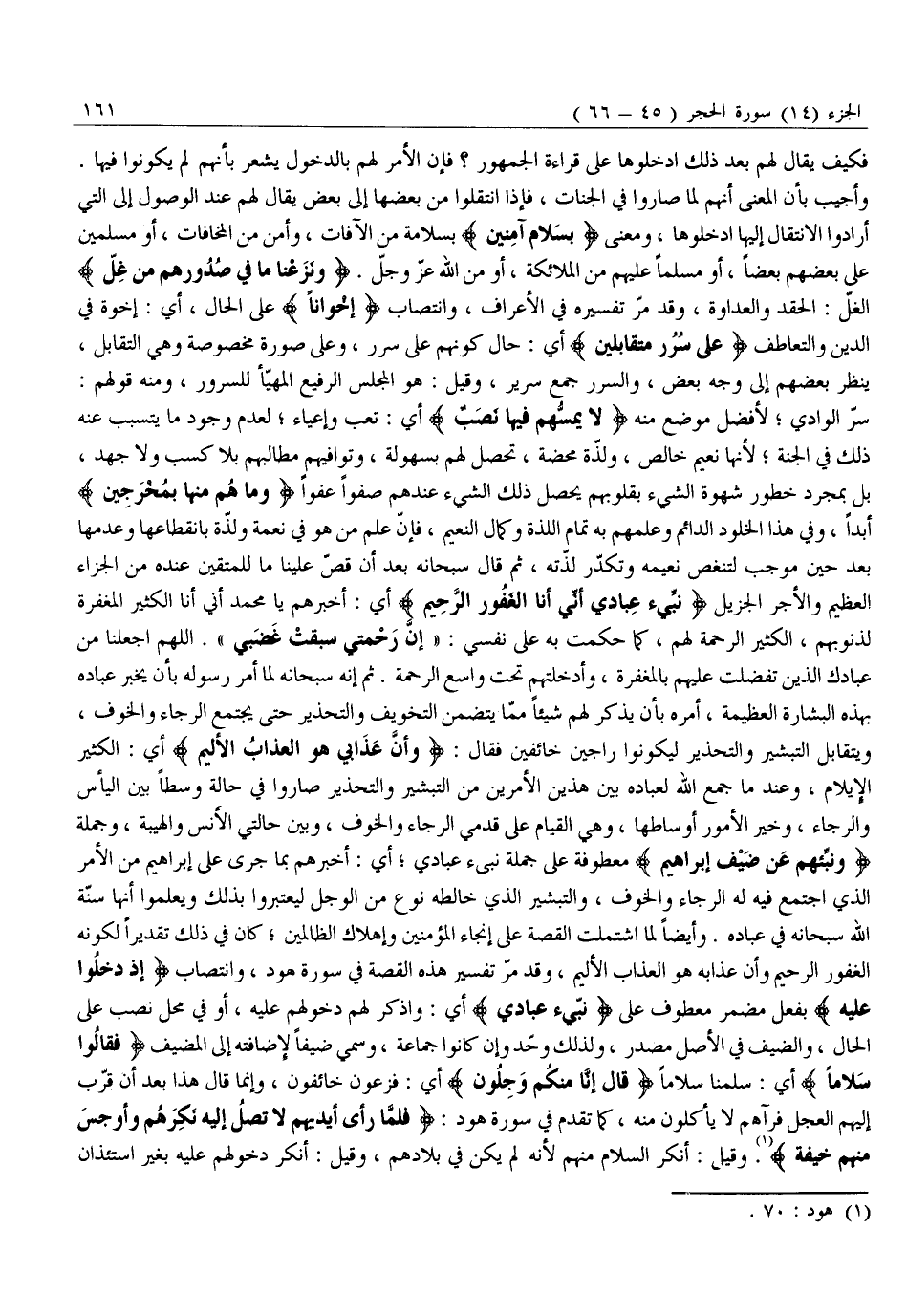 وَأُجِيبَ بِأَنَّ الْمَعْنَى أَنَّهُمْ لَمَّا صَارُوا فِي الْجَنَّاتِ، فَإِذَا انْتَقَلُوا مِنْ بَعْضِهَا إِلَى بَعْضٍ يُقَالُ لَهُمْ عِنْدَ الْوُصُولِ إِلَى الَّتِي أَرَادُوا الِانْتِقَالَ إِلَيْهَا ادْخُلُوهَا، وَمَعْنَى بِسَلامٍ آمِنِينَ بِسَلَامَةٍ مِنَ الْآفَاتِ، وَأَمْنٍ مِنَ الْمَخَافَاتِ، أَوْ مُسَلِّمِينَ عَلَى بَعْضِهِمْ بَعْضًا، أَوْ مُسَلَّمًا عَلَيْهِمْ مِنَ الْمَلَائِكَةِ، أَوْ مِنَ اللَّهِ عَزَّ وَجَلَّ. وَنَزَعْنا مَا فِي صُدُورِهِمْ مِنْ غِلٍّ الْغِلُّ: الْحِقْدُ وَالْعَدَاوَةُ، وَقَدْ مَرَّ تَفْسِيرُهُ فِي الْأَعْرَافِ، وَانْتِصَابُ إِخْواناً عَلَى الْحَالِ، أَيْ: إِخْوَةً فِي الدِّينِ وَالتَّعَاطُفِ عَلى سُرُرٍ مُتَقابِلِينَ أَيْ: حَالَ كَوْنِهِمْ عَلَى سُرُرٍ، وَعَلَى صُورَةٍ مَخْصُوصَةٍ وَهِيَ التَّقَابُلُ، يَنْظُرُ بَعْضُهُمْ إِلَى وَجْهِ بَعْضٍ، وَالسُّرُرُ جَمْعُ سَرِيرٍ، وَقِيلَ: هُوَ الْمَجْلِسُ الرَّفِيعُ الْمُهَيَّأُ لِلسُّرُورِ، وَمِنْهُ قَوْلُهُمْ: