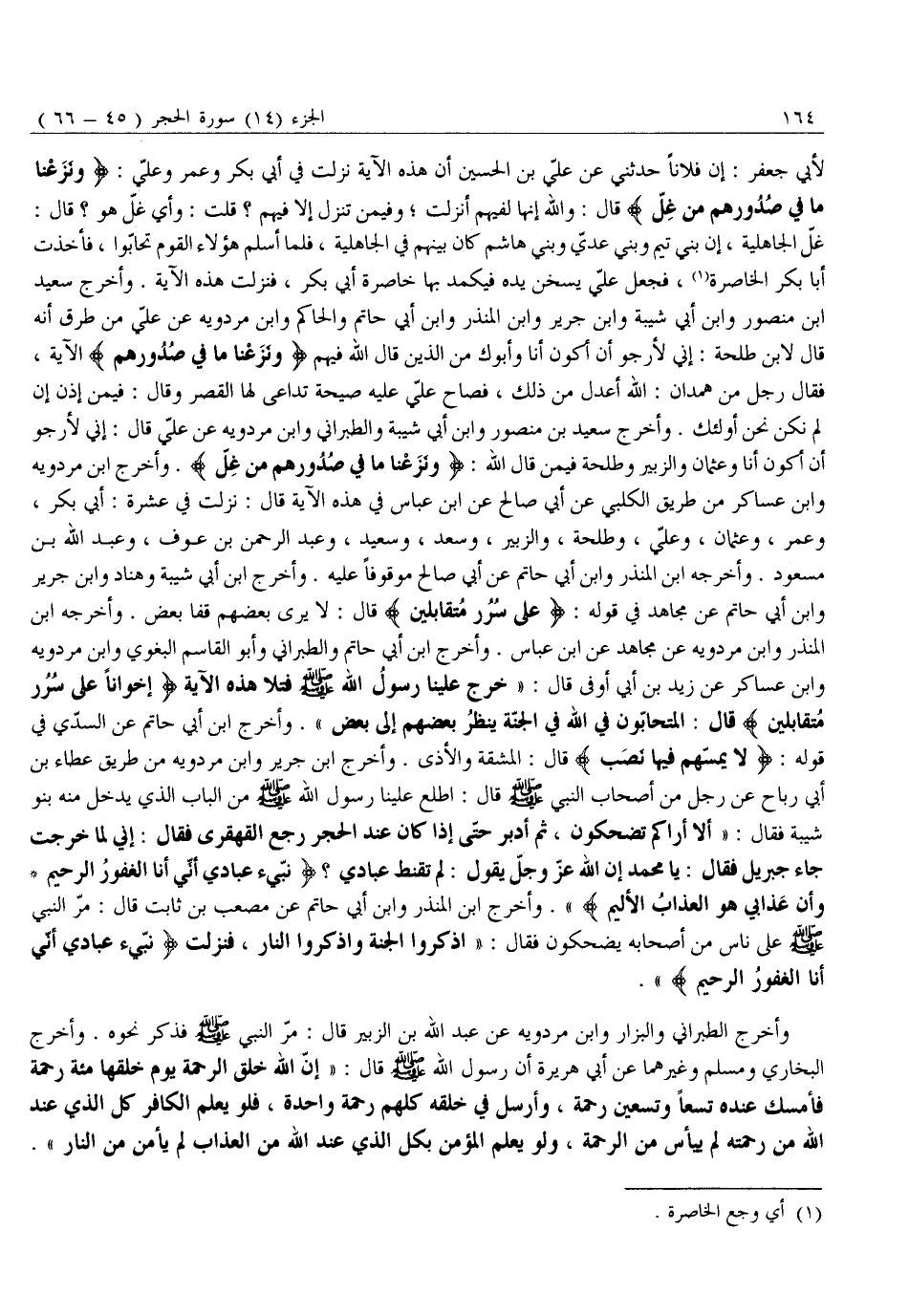 غِلُّ الْجَاهِلِيَّةِ، إِنَّ بَنِي تَيْمٍ وَبَنِي عَدِيٍّ وَبَنِي هَاشِمٍ كَانَ بَيْنَهُمْ فِي الْجَاهِلِيَّةِ، فَلَمَّا أَسَلَمَ هَؤُلَاءِ الْقَوْمُ تَحَابُّوا، فَأَخَذَتْ أَبَا بَكْرٍ الْخَاصِرَةُ «1» ، فَجَعَلَ عَلِيٌّ يُسْخِنُ يَدَهُ فَيُكَمِّدُ بِهَا خَاصِرَةَ أَبِي بَكْرٍ، فَنَزَلَتْ هذه الآية. وأخرج سعيد ابن مَنْصُورٍ وَابْنُ أَبِي شَيْبَةَ وَابْنُ جَرِيرٍ وَابْنُ الْمُنْذِرِ وَابْنُ أَبِي حَاتِمٍ وَالْحَاكِمُ وَابْنُ مَرْدَوَيْهِ عَنْ عَلِيٍّ مِنْ طُرُقٍ أَنَّهُ قَالَ لِابْنِ طَلْحَةَ: إِنِّي لِأَرْجُوَ أَنْ أَكُونَ أَنَا وَأَبُوكَ مِنَ الَّذِينَ قَالَ اللَّهُ فِيهِمْ وَنَزَعْنا مَا فِي صُدُورِهِمْ الْآيَةَ، فَقَالَ رَجُلٌ مِنْ هَمْدَانَ: اللَّهُ أَعْدَلُ مِنْ ذَلِكَ، فَصَاحَ عَلِيٌّ عَلَيْهِ صيحة تداعى لها القصر وقال: فيمن إذن إِنْ لَمْ نَكُنْ نَحْنُ أُولَئِكَ. وَأَخْرَجَ سَعِيدُ بْنُ مَنْصُورٍ وَابْنُ أَبِي شَيْبَةَ وَالطَّبَرَانِيُّ وَابْنُ مَرْدَوَيْهِ عَنْ عَلِيٍّ قَالَ: إِنِّي لَأَرْجُوَ أَنْ أَكُونَ أَنَا وَعُثْمَانُ وَالزُّبَيْرُ وَطَلْحَةُ فِيمَنْ قَالَ اللَّهُ: وَنَزَعْنا مَا فِي صُدُورِهِمْ مِنْ غِلٍّ. وَأَخْرَجَ ابْنُ مَرْدَوَيْهِ وَابْنُ عَسَاكِرَ مِنْ طَرِيقِ الْكَلْبِيِّ عَنْ أَبِي صَالِحٍ عَنِ ابْنِ عَبَّاسٍ فِي هَذِهِ الْآيَةِ قَالَ: نَزَلَتْ فِي عَشَرَةٍ: أَبِي بَكْرٍ، وَعُمَرَ، وَعُثْمَانَ، وَعَلِيٍّ، وَطِلْحَةَ، وَالزُّبَيْرِ، وَسَعْدٍ، وَسَعِيدٍ، وَعَبْدِ الرَّحْمَنِ بْنِ عَوْفٍ، وَعَبْدِ اللَّهِ بْنِ مَسْعُودٍ. وَأَخْرَجَهُ ابْنُ الْمُنْذِرِ وَابْنُ أَبِي حَاتِمٍ عَنْ أَبِي صَالِحٍ مَوْقُوفًا عَلَيْهِ. وَأَخْرَجَ ابْنُ أَبِي شَيْبَةَ وَهَنَّادٌ وَابْنُ جَرِيرٍ وَابْنُ أَبِي حَاتِمٍ عَنْ مُجَاهِدٍ فِي قَوْلِهِ: عَلى سُرُرٍ مُتَقابِلِينَ قَالَ: لَا يَرَى بَعْضُهُمْ قَفَا بَعْضٍ. وَأَخْرَجَهُ ابْنُ الْمُنْذِرِ وَابْنُ مَرْدَوَيْهِ عَنْ مُجَاهِدٍ عَنِ ابْنِ عَبَّاسٍ. وَأَخْرَجَ ابْنُ أَبِي حَاتِمٍ وَالطَّبَرَانِيُّ وَأَبُو الْقَاسِمِ الْبَغَوِيُّ وَابْنُ مَرْدَوَيْهِ وَابْنُ عَسَاكِرَ عَنْ زَيْدِ بْنِ أَبِي أَوْفَى قَالَ: «خَرَجَ عَلَيْنَا رَسُولُ اللَّهِ صَلَّى اللَّهُ عَلَيْهِ وَسَلَّمَ فَتَلَا هَذِهِ الْآيَةَ إِخْواناً عَلى سُرُرٍ مُتَقابِلِينَ قَالَ: الْمُتَحَابُّونَ فِي اللَّهِ فِي الْجَنَّةِ يَنْظُرُ بَعْضُهُمْ إِلَى بَعْضٍ» . وَأَخْرَجَ ابْنُ أَبِي حَاتِمٍ عَنِ السُّدِّيِّ فِي قَوْلِهِ: لَا يَمَسُّهُمْ فِيها نَصَبٌ قَالَ: الْمَشَقَّةُ وَالْأَذَى. وَأَخْرَجَ ابْنُ جَرِيرٍ وَابْنُ مَرْدَوَيْهِ مِنْ طَرِيقِ عَطَاءِ بْنِ أَبِي رَبَاحٍ عَنْ رَجُلٍ مِنْ أَصْحَابِ النَّبِيِّ صَلَّى اللَّهُ عَلَيْهِ وَسَلَّمَ قَالَ: اطَّلَعَ عَلَيْنَا رَسُولُ اللَّهِ صَلَّى اللَّهُ عَلَيْهِ وَسَلَّمَ مِنَ الْبَابِ الَّذِي يَدْخُلُ مِنْهُ بَنُو شَيْبَةَ فَقَالَ: «أَلَا أَرَاكُمْ تَضْحَكُونَ، ثُمَّ أَدْبَرَ حَتَّى إِذَا كَانَ عِنْدَ الْحَجَرِ رَجَعَ الْقَهْقَرَى فَقَالَ: إِنِّي لَمَّا خَرَجْتُ جَاءَ جِبْرِيلُ فَقَالَ: يَا مُحَمَّدُ إِنَّ اللَّهَ عَزَّ وَجَلَّ يَقُولُ: لِمَ تُقَنِّطُ عِبَادِي؟ نَبِّئْ عِبادِي أَنِّي أَنَا الْغَفُورُ الرَّحِيمُ وَأَنَّ عَذابِي هُوَ الْعَذابُ الْأَلِيمُ» . وَأَخْرَجَ ابْنُ الْمُنْذِرِ وَابْنُ أَبِي حَاتِمٍ عَنِ مُصْعَبِ بْنِ ثَابِتٍ قَالَ: مَرَّ النَّبِيُّ صَلَّى الله عليه وَسَلَّمَ عَلَى نَاسٍ مِنْ أَصْحَابِهِ يَضْحَكُونَ فَقَالَ: «اذْكُرُوا الْجَنَّةَ وَاذْكُرُوا النَّارَ، فَنَزَلَتْ نَبِّئْ عِبادِي أَنِّي أَنَا الْغَفُورُ الرَّحِيمُ» .