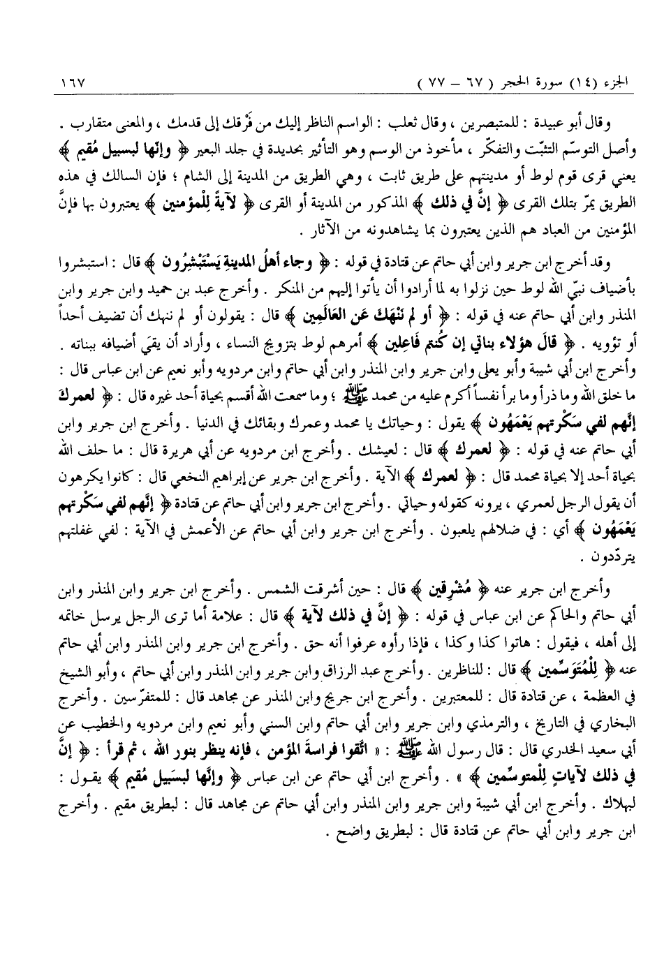 وَأَخْرَجَ ابْنُ جَرِيرٍ عَنْهُ مُشْرِقِينَ قَالَ: حِينَ أَشْرَقَتِ الشَّمْسُ. وَأَخْرَجَ ابْنُ جَرِيرٍ وَابْنُ الْمُنْذِرِ وَابْنُ أَبِي حَاتِمٍ وَالْحَاكِمُ عَنِ ابْنِ عَبَّاسٍ فِي قَوْلِهِ: إِنَّ فِي ذلِكَ لَآيَةً قَالَ: عَلَامَةً أَمَا تَرَى الرَّجُلَ يُرْسِلُ خَاتَمَهُ إِلَى أَهْلِهِ، فَيَقُولُ: هَاتُوا كَذَا وَكَذَا، فَإِذَا رَأَوْهُ عَرَفُوا أَنَّهُ حَقٌّ. وَأَخْرَجَ ابْنُ جَرِيرٍ وَابْنُ الْمُنْذِرِ وَابْنُ أَبِي حَاتِمٍ عَنْهُ لِلْمُتَوَسِّمِينَ قَالَ: لِلنَّاظِرِينَ. وَأَخْرَجَ عَبْدُ الرَّزَّاقِ وَابْنُ جَرِيرٍ وَابْنُ الْمُنْذِرِ وَابْنُ أَبِي حَاتِمٍ، وَأَبُو الشَّيْخِ فِي الْعَظَمَةِ، عَنْ قَتَادَةَ قَالَ: لِلْمُعْتَبِرِينَ. وَأَخْرَجَ ابْنُ جُرَيْجٍ وَابْنُ الْمُنْذِرِ عَنْ مُجَاهِدٍ قَالَ: لِلْمُتَفَرِّسِينَ. وَأَخْرَجَ الْبُخَارِيُّ فِي التَّارِيخِ، وَالتِّرْمِذِيُّ وَابْنُ جَرِيرٍ وَابْنُ أَبِي حَاتِمٍ وَابْنُ السُّنِّيِّ وَأَبُو نُعَيْمٍ وَابْنُ مَرْدَوَيْهِ وَالْخَطِيبُ عَنْ أَبِي سَعِيدٍ الْخُدْرِيِّ قَالَ: قَالَ رَسُولُ اللَّهِ صَلَّى اللَّهُ عَلَيْهِ وَسَلَّمَ: «اتَّقُوا فِرَاسَةَ الْمُؤْمِنِ، فَإِنَّهُ يَنْظُرُ بِنُورِ اللَّهِ، ثُمَّ قَرَأَ: إِنَّ فِي ذلِكَ لَآياتٍ لِلْمُتَوَسِّمِينَ» . وَأَخْرَجَ ابْنُ أَبِي حَاتِمٍ عَنِ ابْنِ عَبَّاسٍ وَإِنَّها لَبِسَبِيلٍ مُقِيمٍ يَقُولُ: