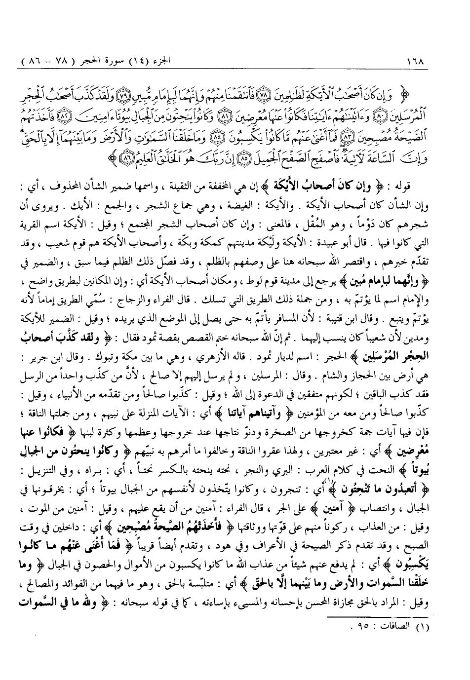وَإِنَّ الشَّأْنَ كَانَ أَصْحَابُ الْأَيْكَةِ. وَالْأَيْكَةُ: الْغَيْضَةُ، وَهِيَ جِمَاعُ الشَّجَرِ، وَالْجَمْعُ: الْأَيْكُ. وَيُرْوَى أَنَّ شَجَرَهُمْ كَانَ دَوْمًا، وَهُوَ الْمُقْلُ، فَالْمَعْنَى: وَإِنْ كَانَ أَصْحَابُ الشَّجَرِ الْمُجْتَمِعِ وَقِيلَ: الْأَيْكَةُ اسْمُ الْقَرْيَةِ الَّتِي كَانُوا فِيهَا. قَالَ أَبُو عُبَيْدَةَ: الْأَيْكَةُ وَلَيْكَةُ مَدِينَتُهُمْ كَمَكَّةَ وَبَكَّةَ، وَأَصْحَابُ الْأَيْكَةِ هُمْ قَوْمُ شُعَيْبٍ، وَقَدْ تَقَدَّمَ خَبَرُهُمْ، وَاقْتَصَرَ اللَّهُ سُبْحَانَهُ هُنَا عَلَى وَصْفِهِمْ بِالظُّلْمِ، وَقَدْ فَصَّلَ ذَلِكَ الظُّلْمَ فِيمَا سَبَقَ، وَالضَّمِيرُ فِي وَإِنَّهُما لَبِإِمامٍ مُبِينٍ يَرْجِعُ إِلَى مَدِينَةِ قَوْمِ لُوطٍ، وَمَكَانِ أَصْحَابِ الْأَيْكَةِ أَيْ: وَإِنَّ الْمَكَانَيْنِ لَبِطَرِيقٍ وَاضِحٍ، وَالْإِمَامُ اسْمٌ لِمَا يُؤْتَمُّ بِهِ، وَمِنْ جُمْلَةِ ذَلِكَ الطَّرِيقُ الَّتِي تُسْلَكُ. قَالَ الْفَرَّاءُ وَالزَّجَّاجُ: سُمِّيَ الطَّرِيقُ إِمَامًا لِأَنَّهُ يُؤْتَمُّ وَيُتَّبَعُ. وَقَالَ ابْنُ قُتَيْبَةَ: لِأَنَّ الْمُسَافِرَ يَأْتَمُّ بِهِ حَتَّى يَصِلَ إِلَى الْمَوْضِعِ الَّذِي يُرِيدُهُ وَقِيلَ: الضَّمِيرُ لِلْأَيْكَةِ وَمَدْيَنَ لِأَنَّ شُعَيْبًا كَانَ يُنْسَبُ إِلَيْهِمَا. ثُمَّ إِنَّ اللَّهَ سُبْحَانَهُ خَتَمَ الْقَصَصَ بِقِصَّةِ ثَمُودَ فَقَالَ: وَلَقَدْ كَذَّبَ أَصْحابُ الْحِجْرِ الْمُرْسَلِينَ الْحِجْرُ: اسْمٌ لِدِيَارِ ثَمُودَ. قَالَهُ الْأَزْهَرِيُّ، وَهِيَ مَا بَيْنَ مَكَّةَ وَتَبُوكَ. وَقَالَ ابْنُ جَرِيرٍ: