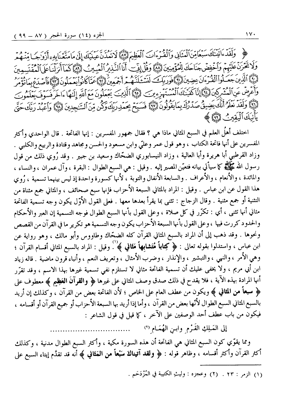 وزاد القرطبي أبا هريرة وأبا العالية، وَزَادَ النَّيْسَابُورِيُّ الضَّحَّاكَ وَسَعِيدَ بْنَ جُبَيْرٍ. وَقَدْ روي ذلك مِنْ قَوْلِ رَسُولِ اللَّهِ صَلَّى اللَّهُ عَلَيْهِ وَسَلَّمَ كَمَا سَيَأْتِي بَيَانُهُ فَتَعَيَّنَ الْمَصِيرُ إِلَيْهِ. وَقِيلَ: هِيَ السَّبْعُ الطِّوَالُ: الْبَقَرَةُ، وَآلُ عِمْرَانَ، وَالنِّسَاءُ، وَالْمَائِدَةُ، وَالْأَنْعَامُ، وَالْأَعْرَافُ. وَالسَّابِعَةُ الْأَنْفَالُ وَالتَّوْبَةُ، لِأَنَّهَا كَسُورَةٍ وَاحِدَةٍ إِذْ لَيْسَ بَيْنَهُمَا تَسْمِيَةٌ، رُوِيَ هَذَا الْقَوْلُ عَنِ ابْنِ عَبَّاسٍ. وَقِيلَ: الْمُرَادُ بِالْمَثَانِي السَّبْعَةُ الْأَحْزَابِ فَإِنَّهَا سَبْعُ صَحَائِفَ، وَالْمَثَانِي جَمْعُ مُثَنَّاةٍ مِنَ التَّثْنِيَةِ أَوْ جَمْعُ مَثْنِيَّةٍ. وَقَالَ الزَّجَّاجُ: تُثَنَّى بِمَا يُقْرَأُ بَعْدَهَا مَعَهَا. فَعَلَى الْقَوْلِ الْأَوَّلِ يَكُونُ وَجْهُ تَسْمِيَةِ الْفَاتِحَةِ مَثَانِيَ أَنَّهَا تُثَنَّى، أَيْ: تُكَرَّرُ فِي كُلِّ صَلَاةٍ، وَعَلَى الْقَوْلِ بِأَنَّهَا السَّبْعُ الطُّوَالُ فَوَجْهُ التَّسْمِيَةِ أَنَّ الْعِبَرَ وَالْأَحْكَامَ وَالْحُدُودَ كُرِّرَتْ فِيهَا، وَعَلَى الْقَوْلِ بِأَنَّهَا السَّبْعَةُ الْأَحْزَابِ يَكُونُ وَجْهُ التَّسْمِيَةِ هُوَ تَكْرِيرَ مَا فِي الْقُرْآنِ مِنَ الْقَصَصِ وَنَحْوِهَا. وَقَدْ ذَهَبَ إِلَى أَنَّ الْمُرَادَ بِالسَّبْعِ الْمَثَانِي الْقُرْآنُ كُلُّهُ الضَّحَّاكُ وَطَاوُسٌ وَأَبُو مَالِكٍ، وَهُوَ رِوَايَةٌ عَنِ ابْنِ عَبَّاسٍ، واستدلوا بقوله تعالى: كِتاباً مُتَشابِهاً مَثانِيَ «1» . وَقِيلَ: الْمُرَادُ بِالسَّبْعِ الْمَثَانِي أَقْسَامُ الْقُرْآنِ وَهِيَ الْأَمْرُ، وَالنَّهْيُ، وَالتَّبْشِيرُ، وَالْإِنْذَارُ، وَضَرْبُ الْأَمْثَالِ، وَتَعْرِيفُ النعم، وأنباء قرون ماضية. قاله زياد ابن أَبِي مَرْيَمَ، وَلَا يَخْفَى عَلَيْكَ أَنَّ تَسْمِيَةَ الْفَاتِحَةِ مَثَانِيَ لَا تَسْتَلْزِمُ نَفْيَ تَسْمِيَةِ غَيْرِهَا بِهَذَا الِاسْمِ، وَقَدْ تَقَرَّرَ أَنَّهَا الْمُرَادَةُ بِهَذِهِ الْآيَةِ، فَلَا يَقْدَحُ فِي ذَلِكَ صِدْقُ وَصْفِ الْمَثَانِي عَلَى غَيْرِهَا وَالْقُرْآنَ الْعَظِيمَ مَعْطُوفٌ عَلَى سَبْعاً مِنَ الْمَثانِي وَيَكُونُ مِنْ عَطْفِ الْعَامِّ عَلَى الْخَاصِّ لِأَنَّ الْفَاتِحَةَ بَعْضٌ مِنَ الْقُرْآنِ، وَكَذَلِكَ إِنْ أُرِيدَ بِالسَّبْعِ الْمَثَانِي السَّبْعُ الطُّوَالُ لِأَنَّهَا بَعْضٌ مِنَ الْقُرْآنِ، وَأَمَّا إِذَا أُرِيدَ بِهَا السَّبْعَةُ الْأَحْزَابِ أَوْ جَمِيعُ الْقُرْآنِ أَوْ أَقْسَامُهُ، فَيَكُونُ مِنْ بَابِ عَطْفِ أَحَدِ الْوَصْفَيْنِ عَلَى الْآخَرِ، كَمَا قِيلَ فِي قَوْلِ الشَّاعِرِ: