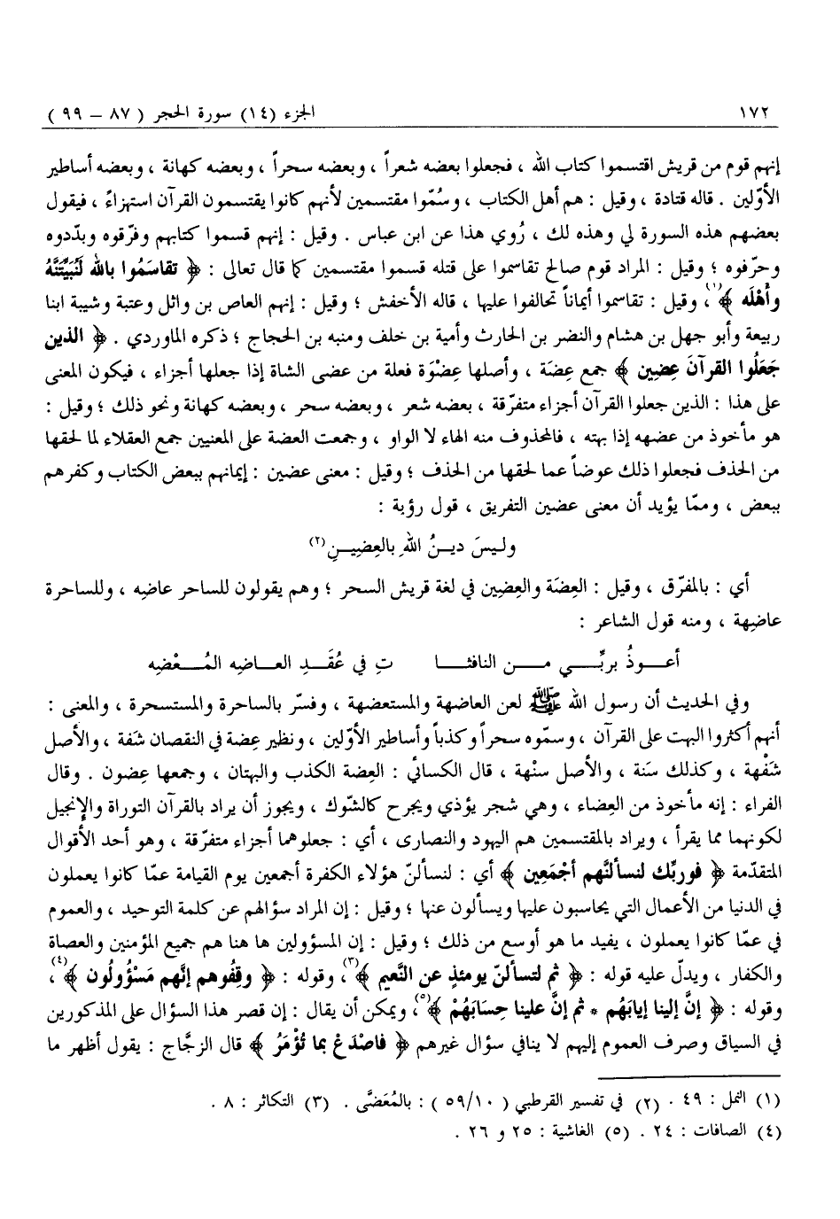 أَنَّهُمْ أَكْثَرُوا الْبُهْتَ عَلَى الْقُرْآنِ، وَسَمَّوْهُ سِحْرًا وَكَذِبًا وَأَسَاطِيرَ الْأَوَّلِينَ، وَنَظِيرُ عِضَةٍ فِي النُّقْصَانِ شَفَةٌ، وَالْأَصْلُ شَفْهَةٌ، وَكَذَلِكَ سَنَةٌ، وَالْأَصْلُ سَنْهَةٌ، قَالَ الْكِسَائِيُّ: الْعِضَةُ الْكَذِبُ وَالْبُهْتَانُ، وَجَمْعُهَا عِضُونَ. وَقَالَ الْفَرَّاءُ: إِنَّهُ مَأْخُوذٌ مِنَ العضاء، وَهِيَ شَجَرٌ يُؤْذِي وَيَجْرَحُ كَالشَّوْكِ، وَيَجُوزُ أَنْ يراد بالقرآن التوراة والإنجيل لكونهما مما يقرأ، ويراد بالمقتسمين هم الْيَهُودُ وَالنَّصَارَى، أَيْ: جَعَلُوهُمَا أَجْزَاءً مُتَفَرِّقَةً، وَهُوَ أحد الأقوال المتقدّمة فَوَ رَبِّكَ لَنَسْئَلَنَّهُمْ أَجْمَعِينَ أَيْ: لَنَسْأَلَنَّ هَؤُلَاءِ الْكَفَرَةَ أَجْمَعِينَ يَوْمَ الْقِيَامَةِ عَمَّا كَانُوا يَعْمَلُونَ فِي الدُّنْيَا مِنَ الْأَعْمَالِ الَّتِي يُحَاسَبُونَ عَلَيْهَا وَيُسْأَلُونَ عَنْهَا وَقِيلَ: إِنَّ الْمُرَادَ سُؤَالُهُمْ عَنْ كَلِمَةِ التَّوْحِيدِ، وَالْعُمُومُ فِي عَمَّا كَانُوا يَعْمَلُونَ، يُفِيدُ مَا هُوَ أوسع من ذلك وقيل: إن المسؤولين هَاهُنَا هُمْ جَمِيعُ الْمُؤْمِنِينَ وَالْعُصَاةِ وَالْكُفَّارِ، وَيَدُلُّ عليه قوله: ثُمَّ لَتُسْئَلُنَّ يَوْمَئِذٍ عَنِ النَّعِيمِ «3» ، وقوله: وَقِفُوهُمْ إِنَّهُمْ مَسْؤُلُونَ «4» ، وَقَوْلُهُ: إِنَّ إِلَيْنا إِيابَهُمْ- ثُمَّ إِنَّ عَلَيْنا حِسابَهُمْ «5» ، وَيُمْكِنُ أَنْ يُقَالَ: إِنَّ قَصْرَ هَذَا السُّؤَالِ عَلَى الْمَذْكُورِينَ فِي السِّيَاقِ وَصَرْفَ الْعُمُومِ إِلَيْهِمْ لَا يُنَافِي سُؤَالَ غَيْرِهِمْ فَاصْدَعْ بِما تُؤْمَرُ قال الزجّاج: يقول أظهر ما