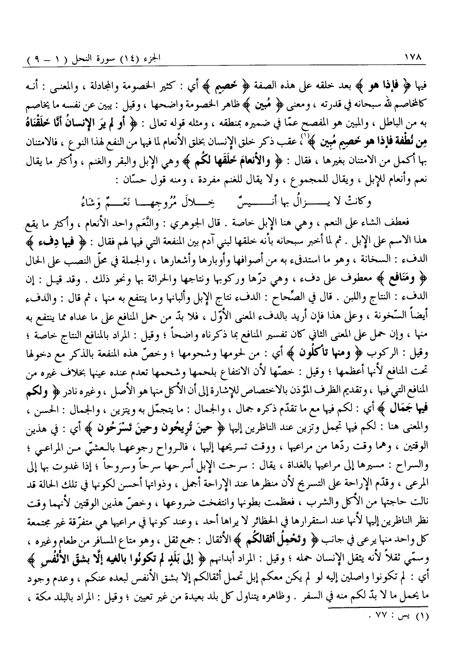 فِيهَا فَإِذا هُوَ بَعْدَ خَلْقِهِ عَلَى هَذِهِ الصِّفَةِ خَصِيمٌ أَيْ: كَثِيرُ الْخُصُومَةِ وَالْمُجَادَلَةِ، وَالْمَعْنَى: أَنَّهُ كَالْمُخَاصِمِ لِلَّهِ سُبْحَانَهُ فِي قُدْرَتِهِ، وَمَعْنَى مُبِينٌ ظَاهِرُ الْخُصُومَةِ وَاضِحُهَا، وَقِيلَ: يُبَيِّنُ عَنْ نَفْسِهِ مَا يُخَاصِمُ بِهِ مِنَ الْبَاطِلِ، وَالْمُبِينُ هُوَ الْمُفْصِحُ عَمَّا فِي ضَمِيرِهِ بِمَنْطِقِهِ، وَمِثْلُهُ قَوْلُهُ تَعَالَى: أَوَلَمْ يَرَ الْإِنْسانُ أَنَّا خَلَقْناهُ مِنْ نُطْفَةٍ فَإِذا هُوَ خَصِيمٌ مُبِينٌ «1» ، عَقَّبَ ذِكْرَ خَلْقِ الْإِنْسَانِ بِخَلْقِ الْأَنْعَامِ لِمَا فِيهَا مِنَ النَّفْعِ لِهَذَا النَّوْعِ، فَالِامْتِنَانُ بِهَا أَكْمَلُ مِنَ الِامْتِنَانِ بِغَيْرِهَا، فَقَالَ: وَالْأَنْعامَ خَلَقَها لَكُمْ وَهِيَ الْإِبِلُ وَالْبَقَرُ وَالْغَنَمُ، وَأَكْثَرُ مَا يُقَالُ نَعَمٌ وَأَنْعَامٌ لِلْإِبِلِ، وَيُقَالُ لِلْمَجْمُوعِ، وَلَا يُقَالُ لِلْغَنَمِ مُفْرَدَةً، وَمِنْهُ قَوْلُ حَسَّانَ: