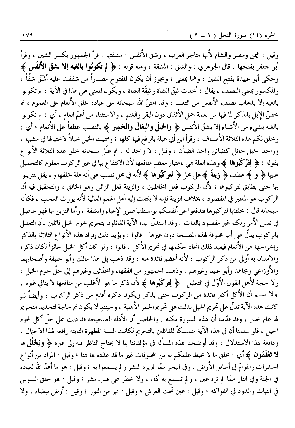 وَقِيلَ: الْيَمَنُ وَمِصْرُ وَالشَّامُ لِأَنَّهَا مَتَاجِرُ الْعَرَبِ، وشق الْأَنْفُسِ: مَشَقَّتُهَا. قَرَأَ الْجُمْهُورُ بِكَسْرِ الشِّينِ، وَقَرَأَ أَبُو جَعْفَرٍ بِفَتْحِهَا. قَالَ الْجَوْهَرِيُّ: وَالشِّقُّ: الْمَشَقَّةُ، وَمِنْهُ قَوْلُهُ: لَمْ تَكُونُوا بالِغِيهِ إِلَّا بِشِقِّ الْأَنْفُسِ وَحَكَى أَبُو عُبَيْدَةَ بِفَتْحِ الشِّينِ، وَهُمَا بِمَعْنًى وَيَجُوزُ أَنْ يَكُونَ الْمَفْتُوحُ مَصْدَرًا مَنْ شَقَقْتُ عَلَيْهِ أَشُقُّ شَقًّا، وَالْمَكْسُورُ بِمَعْنَى النِّصْفِ، يُقَالُ: أَخَذْتُ شِقَّ الشَّاةِ وَشَقَّةَ الشَّاةِ، وَيَكُونُ الْمَعْنَى عَلَى هَذَا فِي الْآيَةِ: لَمْ تَكُونُوا بَالِغِيهِ إِلَّا بِذَهَابِ نِصْفِ الْأَنْفُسِ مِنَ التَّعَبِ، وَقَدِ امْتَنَّ اللَّهُ سُبْحَانَهُ عَلَى عِبَادِهِ بِخَلْقِ الْأَنْعَامِ عَلَى الْعُمُومِ، ثُمَّ خَصَّ الْإِبِلَ بِالذِّكْرِ لِمَا فِيهَا مِنْ نِعْمَةِ حَمْلِ الْأَثْقَالِ دُونَ الْبَقَرِ وَالْغَنَمِ، وَالِاسْتِثْنَاءُ مِنْ أَعَمِّ الْعَامِّ، أَيْ: لَمْ تَكُونُوا بَالِغِيهِ بِشَيْءٍ مِنَ الْأَشْيَاءِ إِلَّا بِشِقِّ الْأَنْفُسِ وَالْخَيْلَ وَالْبِغالَ وَالْحَمِيرَ بِالنَّصْبِ عَطْفًا عَلَى الْأَنْعَامَ أَيْ: