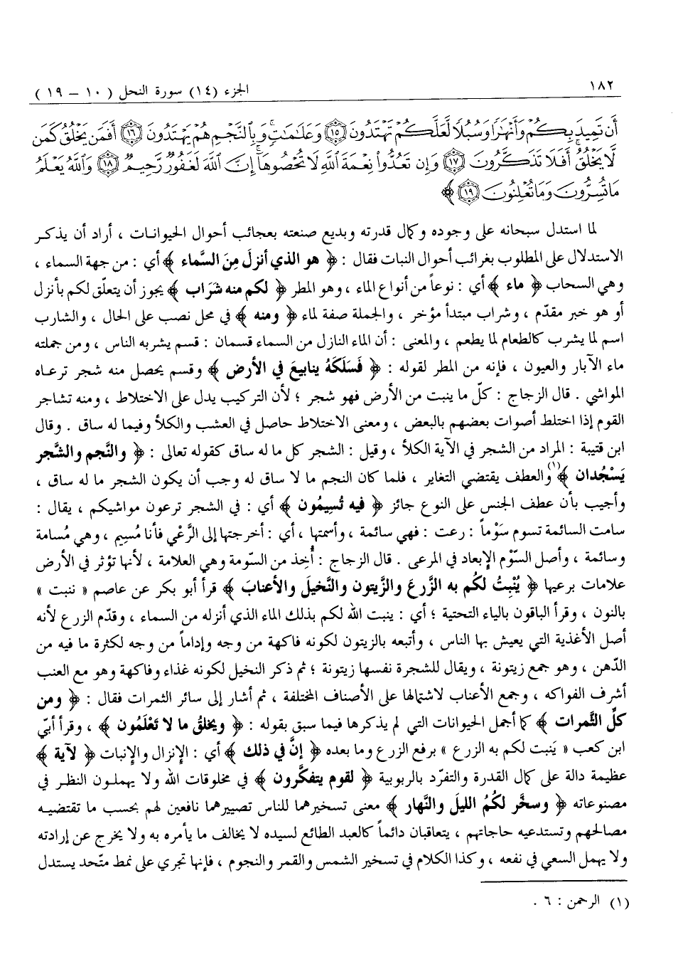 سَامَتِ السَّائِمَةُ تَسُومُ سَوْمًا: رَعَتْ: فَهِيَ سَائِمَةٌ، وَأَسَمْتُهَا، أَيْ: أَخْرَجْتُهَا إِلَى الرَّعْيِ فَأَنَا مُسِيمٌ، وَهِيَ مُسَامَةٌ وَسَائِمَةٌ، وَأَصْلُ السَّوْمِ الْإِبْعَادُ فِي الْمَرْعَى. قَالَ الزَّجَّاجُ: أُخِذَ مِنَ السَّوْمَةِ وَهِيَ الْعَلَامَةُ، لِأَنَّهَا تُؤَثِّرُ فِي الْأَرْضِ عَلَامَاتٍ بِرَعْيِهَا يُنْبِتُ لَكُمْ بِهِ الزَّرْعَ وَالزَّيْتُونَ وَالنَّخِيلَ وَالْأَعْنابَ قَرَأَ أَبُو بَكْرٍ عَنْ عَاصِمٍ «نُنْبِتُ» بِالنُّونِ، وَقَرَأَ الْبَاقُونَ بِالْيَاءِ التَّحْتِيَّةِ أَيْ: يُنْبِتُ اللَّهُ لَكُمْ بِذَلِكَ الْمَاءِ الَّذِي أَنْزَلَهُ مِنَ السَّمَاءِ، وَقَدَّمَ الزَّرْعَ لِأَنَّهُ أَصْلُ الْأَغْذِيَةِ الَّتِي يَعِيشُ بِهَا النَّاسُ، وَأَتْبَعَهُ بِالزَّيْتُونِ لِكَوْنِهِ فَاكِهَةً مِنْ وَجْهٍ وَإِدَامًا مِنْ وَجْهٍ لِكَثْرَةِ مَا فِيهِ مِنَ الدُّهْنِ، وَهُوَ جَمْعُ زَيْتُونَةٍ، وَيُقَالُ لِلشَّجَرَةِ نَفْسِهَا زَيْتُونَةٌ ثُمَّ ذَكَرَ النَّخِيلَ لِكَوْنِهِ غِذَاءً وَفَاكِهَةً وَهُوَ مَعَ الْعِنَبِ أَشْرَفُ الْفَوَاكِهِ، وَجَمَعَ الْأَعْنَابَ لِاشْتِمَالِهَا عَلَى الْأَصْنَافِ الْمُخْتَلِفَةِ، ثُمَّ أَشَارَ إِلَى سَائِرِ الثَّمَرَاتِ فَقَالَ: وَمِنْ كُلِّ الثَّمَراتِ كَمَا أَجْمَلَ الْحَيَوَانَاتِ الَّتِي لَمْ يَذْكُرْهَا فِيمَا سَبَقَ بِقَوْلِهِ: وَيَخْلُقُ ما لا تَعْلَمُونَ، وقرأ أبيّ ابن كعب «ينبت لكم به الزرع» برفع الزَّرْعَ وَمَا بَعْدَهُ إِنَّ فِي ذلِكَ أَيِ: الْإِنْزَالِ وَالْإِنْبَاتِ لَآيَةً عَظِيمَةً دَالَّةً عَلَى كَمَالِ الْقُدْرَةِ وَالتَّفَرُّدِ بِالرُّبُوبِيَّةِ لِقَوْمٍ يَتَفَكَّرُونَ فِي مَخْلُوقَاتِ اللَّهِ وَلَا يُهْمِلُونَ النَّظَرَ فِي مَصْنُوعَاتِهِ وَسَخَّرَ لَكُمُ اللَّيْلَ وَالنَّهارَ مَعْنَى تَسْخِيرِهِمَا لِلنَّاسِ تَصْيِيرُهُمَا نَافِعَيْنِ لَهُمْ بِحَسَبِ مَا تَقْتَضِيهِ مَصَالِحُهُمْ وَتَسْتَدْعِيهِ حَاجَاتُهُمْ، يَتَعَاقَبَانِ دَائِمًا كَالْعَبْدِ الطَّائِعِ لِسَيِّدِهِ لَا يُخَالِفُ مَا يَأْمُرُهُ بِهِ وَلَا يَخْرُجُ عَنْ إِرَادَتِهِ وَلَا يُهْمِلُ السَّعْيَ فِي نَفْعِهِ، وَكَذَا الْكَلَامُ فِي تَسْخِيرِ الشَّمْسِ وَالْقَمَرِ وَالنُّجُومِ، فَإِنَّهَا تجري على نمط متّحد يستدل