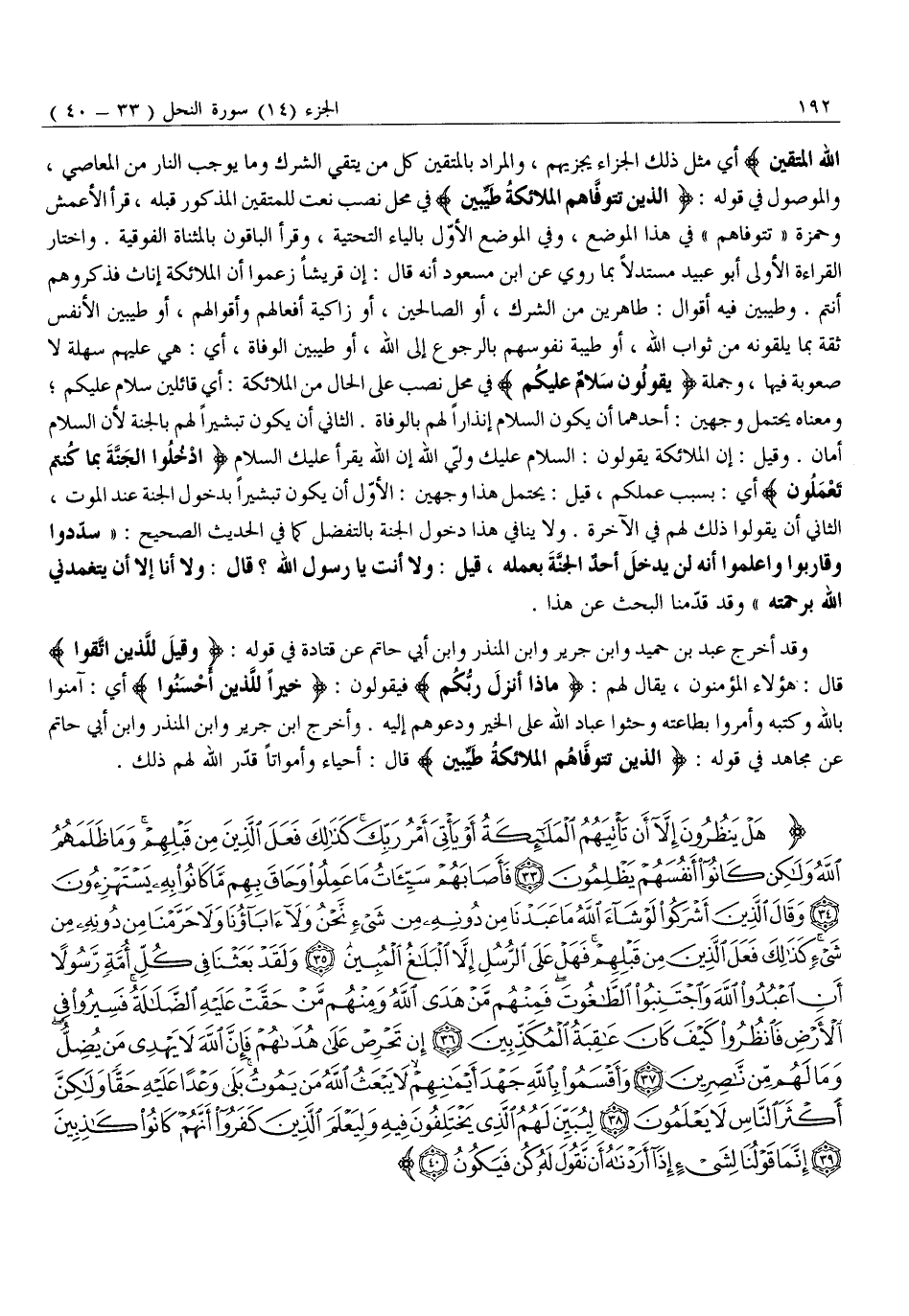 كَذلِكَ يَجْزِي اللَّهُ الْمُتَّقِينَ أَيْ مِثْلَ ذَلِكَ الْجَزَاءِ يَجْزِيهِمْ، وَالْمُرَادُ بِالْمُتَّقِينَ كُلُّ مَنْ يَتَّقِي الشِّرْكَ وَمَا يُوجِبُ النَّارَ مِنَ الْمَعَاصِي، وَالْمَوْصُولُ فِي قَوْلِهِ: الَّذِينَ تَتَوَفَّاهُمُ الْمَلائِكَةُ طَيِّبِينَ فِي مَحَلِّ نَصْبِ نَعْتٍ لِلْمُتَّقِينَ الْمَذْكُورِ قَبْلَهُ، قَرَأَ الْأَعْمَشُ وَحَمْزَةُ «تَتَوَفَّاهُمُ» فِي هَذَا الْمَوْضِعِ، وَفِي الْمَوْضِعِ الْأَوَّلِ بِالْيَاءِ التَّحْتِيَّةِ، وَقَرَأَ الْبَاقُونَ بِالْمُثَنَّاةِ الْفَوْقِيَّةِ. وَاخْتَارَ الْقِرَاءَةَ الْأُولَى أَبُو عُبَيْدٍ مُسْتَدِلًّا بِمَا رُوِيَ عَنِ ابْنِ مَسْعُودٍ أَنَّهُ قَالَ: إِنَّ قُرَيْشًا زَعَمُوا أَنَّ الْمَلَائِكَةَ إِنَاثٌ فَذَكِّرُوهُمْ أنتم. وطيبين فِيهِ أَقْوَالٌ: طَاهِرِينَ مِنَ الشِّرْكِ، أَوِ الصَّالِحِينَ، أَوْ زَاكِيَةً أَفْعَالُهُمْ وَأَقْوَالُهُمْ، أَوْ طَيِّبِينَ الْأَنْفُسِ ثِقَةً بِمَا يَلْقَوْنَهُ مِنْ ثَوَابِ اللَّهِ، أَوْ طَيِّبَةً نُفُوسُهُمْ بِالرُّجُوعِ إِلَى اللَّهِ، أَوْ طَيِّبِينَ الْوَفَاةِ، أَيْ: هِيَ عَلَيْهِمْ سَهْلَةٌ لَا صُعُوبَةَ فِيهَا، وَجُمْلَةُ يَقُولُونَ سَلامٌ عَلَيْكُمْ فِي مَحَلِّ نَصْبٍ عَلَى الْحَالِ مِنَ الْمَلَائِكَةِ: أَيْ قَائِلِينَ سَلَامٌ عَلَيْكُمْ وَمَعْنَاهُ يَحْتَمِلُ وَجْهَيْنِ: أَحَدُهُمَا أَنْ يَكُونَ السَّلَامُ إِنْذَارًا لَهُمْ بِالْوَفَاةِ. الثَّانِي أَنْ يَكُونَ تَبْشِيرًا لَهُمْ بِالْجَنَّةِ لِأَنَّ السَّلَامَ أَمَانٌ. وَقِيلَ: إِنَّ الْمَلَائِكَةَ يَقُولُونَ: السَّلَامُ عَلَيْكَ وَلِيَّ اللَّهِ إِنَّ اللَّهَ يَقْرَأُ عَلَيْكَ السَّلَامَ ادْخُلُوا الْجَنَّةَ بِما كُنْتُمْ تَعْمَلُونَ أَيْ: بِسَبَبِ عَمَلِكُمْ، قِيلَ: يَحْتَمِلُ هَذَا وَجْهَيْنِ: الْأَوَّلُ أَنْ يَكُونَ تَبْشِيرًا بِدُخُولِ الْجَنَّةِ عِنْدَ الْمَوْتِ، الثَّانِي أَنْ يَقُولُوا ذَلِكَ لَهُمْ فِي الْآخِرَةِ. وَلَا يُنَافِي هَذَا دُخُولَ الْجَنَّةِ بِالتَّفَضُّلِ كَمَا فِي الْحَدِيثِ الصَّحِيحِ: «سَدِّدُوا وَقَارِبُوا وَاعْلَمُوا أَنَّهُ لَنْ يَدْخُلَ أَحَدٌ الْجَنَّةَ بِعَمَلِهِ، قِيلَ: وَلَا أَنْتَ يَا رَسُولَ اللَّهِ؟ قَالَ: وَلَا أَنَا إِلَّا أَنْ يَتَغَمَّدَنِي اللَّهُ بِرَحْمَتِهِ» وَقَدْ قَدَّمْنَا الْبَحْثَ عَنْ هَذَا.