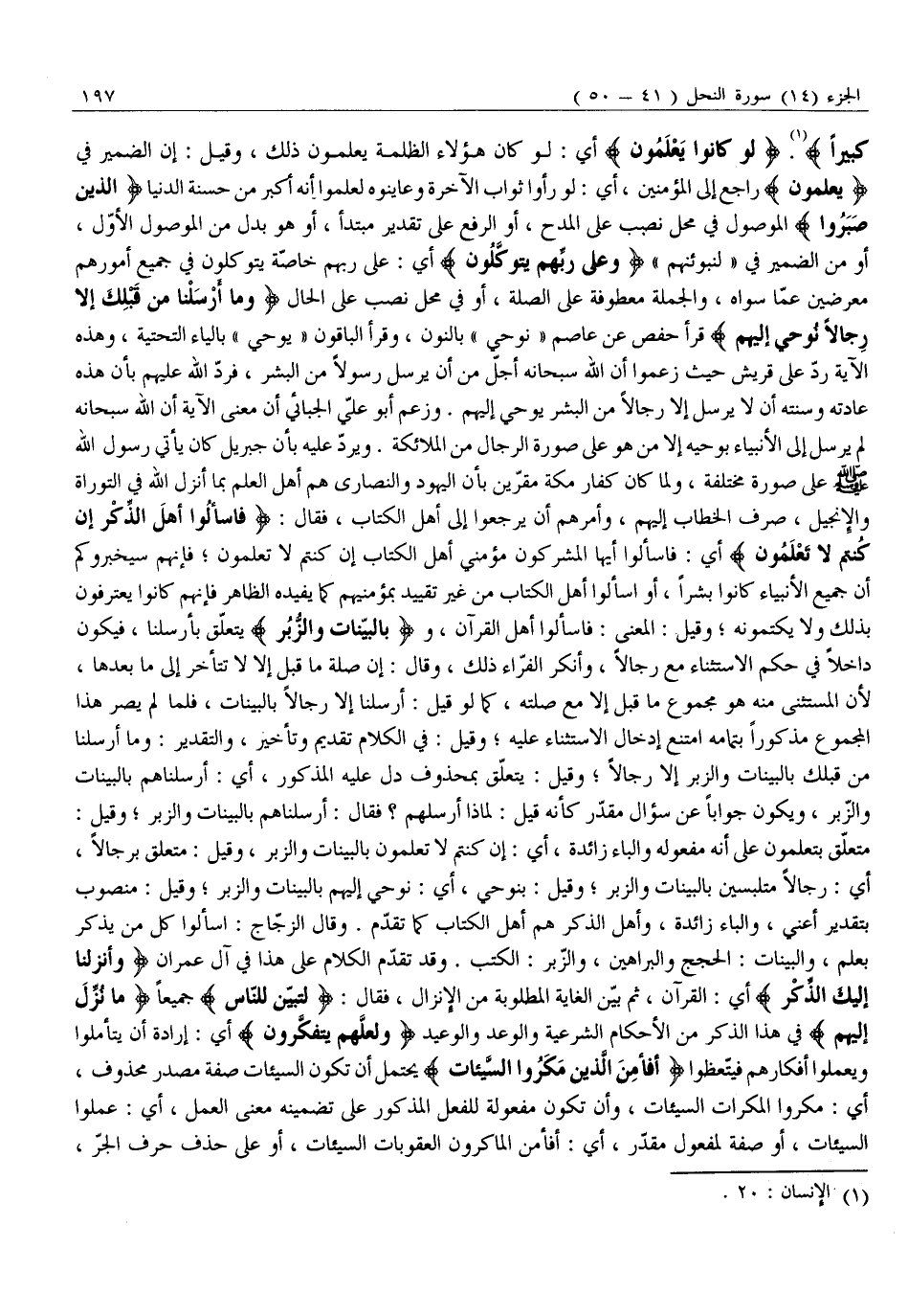 «1» . لَوْ كانُوا يَعْلَمُونَ أَيْ: لَوْ كَانَ هَؤُلَاءِ الظَّلَمَةُ يَعْلَمُونَ ذَلِكَ، وَقِيلَ: إِنَّ الضَّمِيرَ فِي يَعْلَمُونَ رَاجِعٌ إِلَى الْمُؤْمِنِينَ، أَيْ: لَوْ رَأَوْا ثَوَابَ الْآخِرَةِ وَعَايَنُوهُ لَعَلِمُوا أَنَّهُ أَكْبَرُ مِنْ حَسَنَةِ الدُّنْيَا الَّذِينَ صَبَرُوا الْمَوْصُولُ فِي مَحَلِّ نَصْبٍ عَلَى الْمَدْحِ، أَوِ الرَّفْعِ عَلَى تَقْدِيرِ مُبْتَدَأٍ، أَوْ هُوَ بَدَلٌ مِنَ الْمَوْصُولِ الْأَوَّلِ، أَوْ مِنَ الضَّمِيرِ فِي «لَنُبَوِّئَنَّهُمْ» وَعَلى رَبِّهِمْ يَتَوَكَّلُونَ أَيْ: عَلَى رَبِّهِمْ خَاصَّةً يَتَوَكَّلُونَ فِي جَمِيعِ أُمُورِهِمْ مُعْرِضِينَ عَمَّا سِوَاهُ، وَالْجُمْلَةُ مَعْطُوفَةٌ عَلَى الصِّلَةِ، أَوْ فِي مَحَلِّ نَصْبٍ عَلَى الْحَالِ وَما أَرْسَلْنا مِنْ قَبْلِكَ إِلَّا رِجالًا نُوحِي إِلَيْهِمْ قَرَأَ حَفْصٌ عَنْ عَاصِمٍ «نُوحِي» بِالنُّونِ، وَقَرَأَ الْبَاقُونَ «يُوحَى» بِالْيَاءِ التَّحْتِيَّةِ، وَهَذِهِ الْآيَةُ رَدٌّ عَلَى قُرَيْشٍ حَيْثُ زَعَمُوا أَنَّ اللَّهَ سُبْحَانَهُ أَجَلُّ مِنْ أَنْ يُرْسِلَ رَسُولًا مِنَ الْبَشَرِ، فَرَدَّ اللَّهُ عَلَيْهِمْ بِأَنَّ هَذِهِ عَادَتُهُ وَسُنَّتُهُ أَنْ لَا يُرْسِلَ إِلَّا رِجَالًا مِنَ الْبَشَرِ يُوحِي إِلَيْهِمْ. وَزَعَمَ أَبُو عَلِيٍّ الْجِبَائِيُّ أَنَّ مَعْنَى الْآيَةِ أَنَّ اللَّهَ سُبْحَانَهُ لَمْ يُرْسِلْ إِلَى الْأَنْبِيَاءِ بِوَحْيِهِ إِلَّا مَنْ هُوَ عَلَى صُورَةِ الرِّجَالِ مِنَ الْمَلَائِكَةِ. وَيُرَدُّ عَلَيْهِ بِأَنَّ جِبْرِيلَ كَانَ يَأْتِي رَسُولَ اللَّهِ صَلَّى اللَّهُ عَلَيْهِ وَسَلَّمَ عَلَى صورة مُخْتَلِفَةٍ، وَلَمَّا كَانَ كُفَّارُ مَكَّةَ مُقِرِّينَ بِأَنَّ الْيَهُودَ وَالنَّصَارَى هُمْ أَهْلُ الْعِلْمِ بِمَا أَنْزَلَ اللَّهُ فِي التَّوْرَاةِ وَالْإِنْجِيلِ، صَرَفَ الْخِطَابَ إِلَيْهِمْ، وَأَمَرَهُمْ أَنْ يَرْجِعُوا إِلَى أَهْلِ الْكِتَابِ، فَقَالَ: فَسْئَلُوا أَهْلَ الذِّكْرِ إِنْ كُنْتُمْ لَا تَعْلَمُونَ أَيْ: فَاسْأَلُوا أَيُّهَا الْمُشْرِكُونَ مُؤْمِنِي أَهْلِ الْكِتَابِ إِنْ كنتم لا تعلمون فإنهم سيخبروكم أَنَّ جَمِيعَ الْأَنْبِيَاءِ كَانُوا بَشَرًا، أَوِ اسْأَلُوا أَهْلَ الْكِتَابِ مِنْ غَيْرِ تَقْيِيدٍ بِمُؤْمِنِيهِمْ كَمَا يُفِيدُهُ الظَّاهِرُ فَإِنَّهُمْ كَانُوا يَعْتَرِفُونَ بِذَلِكَ وَلَا يكتمونه وقيل: المعنى: فاسألوا أهل القرآن، وبِالْبَيِّناتِ وَالزُّبُرِ يتعلّق بأرسلنا، فَيَكُونُ دَاخِلًا فِي حُكْمِ الِاسْتِثْنَاءِ مَعَ رِجَالًا، وأنكر الفرّاء ذلك، وقال: إن صلة مَا قَبْلَ إِلَّا لَا تَتَأَخَّرُ إِلَى مَا بَعْدَهَا، لِأَنَّ الْمُسْتَثْنَى مِنْهُ هُوَ مَجْمُوعُ مَا قَبْلَ إِلَّا مَعَ صِلَتِهِ، كَمَا لَوْ قِيلَ: أَرْسَلْنَا إِلَّا رِجَالًا بِالْبَيِّنَاتِ، فَلَمَّا لَمْ يَصِرْ هَذَا الْمَجْمُوعُ مَذْكُورًا بِتَمَامِهِ امْتَنَعَ إِدْخَالُ الِاسْتِثْنَاءِ عَلَيْهِ وَقِيلَ: فِي الْكَلَامِ تَقْدِيمٌ وَتَأْخِيرٌ، وَالتَّقْدِيرُ: وَمَا أَرْسَلْنَا مِنْ قَبْلِكَ بِالْبَيِّنَاتِ وَالزُّبُرِ إِلَّا رِجَالًا وَقِيلَ: يَتَعَلَّقُ بِمَحْذُوفٍ دَلَّ عَلَيْهِ الْمَذْكُورُ، أَيْ: أَرْسَلْنَاهُمْ بِالْبَيِّنَاتِ وَالزُّبُرِ، وَيَكُونُ جَوَابًا عَنْ سُؤَالٍ مُقَدَّرٍ كَأَنَّهُ قِيلَ: لِمَاذَا أَرْسَلَهُمْ؟ فَقَالَ: أرسلناهم بالبينات والزبر وقيل:
