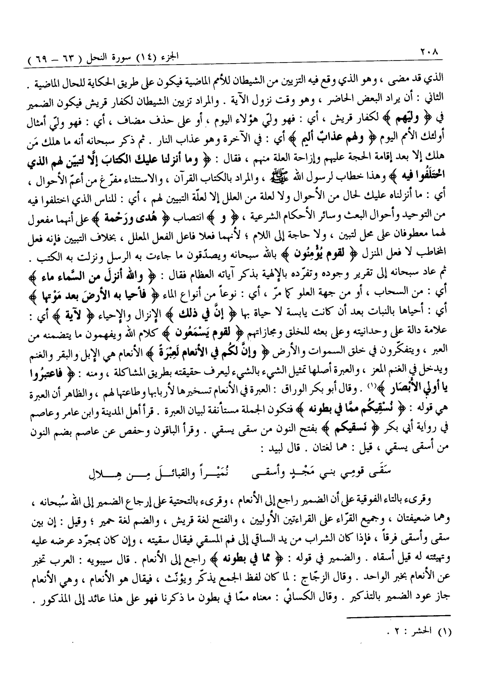 الثَّانِي: أَنْ يُرَادَ الْبَعْضُ الْحَاضِرُ، وَهُوَ وَقْتُ نُزُولِ الْآيَةِ. وَالْمُرَادُ تَزْيِينُ الشَّيْطَانِ لِكُفَّارِ قُرَيْشٍ فَيَكُونُ الضَّمِيرُ فِي وَلِيُّهُمُ لِكُفَّارِ قُرَيْشٍ، أَيْ: فَهُوَ وَلِيُّ هَؤُلَاءِ الْيَوْمَ، أَوْ عَلَى حَذْفِ مُضَافٍ، أَيْ: فَهُوَ وَلِيُّ أَمْثَالِ أُولَئِكَ الْأُمَمِ الْيَوْمَ وَلَهُمْ عَذابٌ أَلِيمٌ أَيْ: فِي الْآخِرَةِ وَهُوَ عَذَابُ النَّارِ. ثُمَّ ذَكَرَ سُبْحَانَهُ أَنَّهُ مَا هَلَكَ مَنْ هَلَكَ إِلَّا بَعْدَ إِقَامَةِ الْحُجَّةِ عَلَيْهِمْ وَإِزَاحَةِ الْعِلَّةِ مِنْهُمْ، فَقَالَ: وَما أَنْزَلْنا عَلَيْكَ الْكِتابَ إِلَّا لِتُبَيِّنَ لَهُمُ الَّذِي اخْتَلَفُوا فِيهِ وَهَذَا خِطَابٌ لِرَسُولِ اللَّهِ صَلَّى اللَّهُ عَلَيْهِ وَسَلَّمَ، والمراد بالكتاب الْقُرْآنُ، وَالِاسْتِثْنَاءُ مُفَرَّغٌ مِنْ أَعَمِّ الْأَحْوَالِ، أَيْ: مَا أَنْزَلْنَاهُ عَلَيْكَ لِحَالٍ مِنَ الْأَحْوَالِ وَلَا لِعِلَّةٍ مِنَ الْعِلَلِ إِلَّا لِعِلَّةِ التَّبْيِينِ لَهُمْ، أَيْ: لِلنَّاسِ الَّذِي اخْتَلَفُوا فِيهِ مِنَ التَّوْحِيدِ وأحوال البعث وسائر الأحكام الشرعية، وَانتصاب هُدىً وَرَحْمَةً عَلَى أَنَّهُمَا مَفْعُولٌ لَهُمَا مَعْطُوفَانِ عَلَى مَحَلِّ لِتُبَيِّنَ، وَلَا حَاجَةَ إِلَى اللَّامِ لِأَنَّهُمَا فِعْلَا فَاعِلِ الْفِعْلِ الْمُعَلَّلِ، بِخِلَافِ التَّبْيِينِ فَإِنَّهُ فِعْلُ الْمُخَاطَبِ لَا فِعْلُ الْمُنَزِّلِ لِقَوْمٍ يُؤْمِنُونَ بِاللَّهِ سُبْحَانَهُ وَيُصَدِّقُونَ مَا جَاءَتْ بِهِ الرُّسُلُ وَنَزَلَتْ بِهِ الْكُتُبُ.