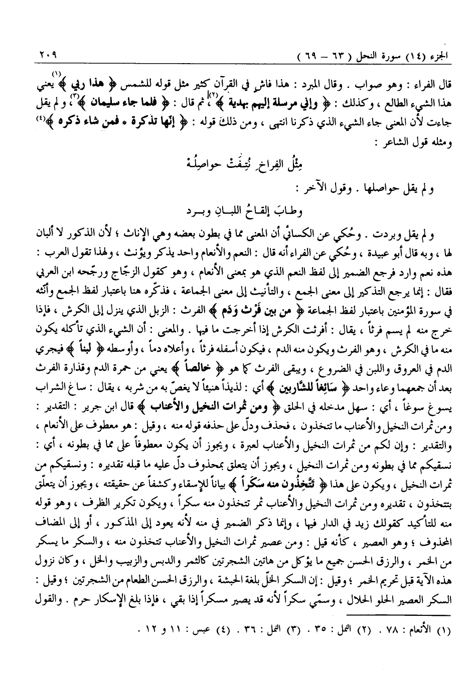 هَذِهِ نَعَمٌ وَارِدٌ فَرَجَعَ الضَّمِيرُ إِلَى لَفْظِ النَّعَمِ الَّذِي هُوَ بِمَعْنَى الْأَنْعَامِ، وَهُوَ كَقَوْلِ الزَّجَّاجِ وَرَجَّحَهُ ابْنُ الْعَرَبِيِّ فَقَالَ: إِنَّمَا يَرْجِعُ التَّذْكِيرُ إِلَى مَعْنَى الْجَمْعِ، وَالتَّأْنِيثُ إِلَى مَعْنَى الْجَمَاعَةِ، فَذَكَّرَهُ هُنَا بِاعْتِبَارِ لَفْظِ الْجَمْعِ وَأَنَّثَهُ فِي سُورَةِ الْمُؤْمِنِينَ بِاعْتِبَارِ لَفْظِ الْجَمَاعَةِ مِنْ بَيْنِ فَرْثٍ وَدَمٍ الْفَرْثُ: الزِّبْلُ الَّذِي يَنْزِلُ إِلَى الْكَرِشِ، فَإِذَا خَرَجَ مِنْهُ لَمْ يُسَمَّ فَرْثًا، يُقَالُ: أَفْرَثَتِ الْكَرِشُ إِذَا أَخْرَجَتْ مَا فِيهَا. وَالْمَعْنَى: أَنَّ الشَّيْءَ الَّذِي تَأْكُلُهُ يَكُونُ مِنْهُ مَا فِي الْكَرِشِ، وَهُوَ الْفَرْثُ وَيَكُونُ مِنْهُ الدَّمُ، فَيَكُونُ أَسْفَلُهُ فَرْثًا، وَأَعْلَاهُ دَمًا، وَأَوْسَطُهُ لَبَناً فَيَجْرِي الدَّمُ فِي الْعُرُوقِ وَاللَّبَنُ فِي الضُّرُوعِ، وَيَبْقَى الْفَرْثُ كَمَا هُوَ خالِصاً يَعْنِي مِنْ حُمْرَةِ الدَّمِ وَقَذَارَةِ الْفَرْثِ بَعْدَ أَنْ جَمَعَهُمَا وِعَاءٌ وَاحِدٌ سائِغاً لِلشَّارِبِينَ أَيْ: لَذِيذًا هَنِيئًا لَا يُغَصُّ بِهِ مَنْ شَرِبَهُ، يُقَالُ: سَاغَ الشَّرَابُ يَسُوغُ سَوْغًا، أَيْ: سَهُلَ مَدْخَلُهُ فِي الْحَلْقِ وَمِنْ ثَمَراتِ النَّخِيلِ وَالْأَعْنابِ قَالَ ابْنُ جَرِيرٍ: التَّقْدِيرُ:
