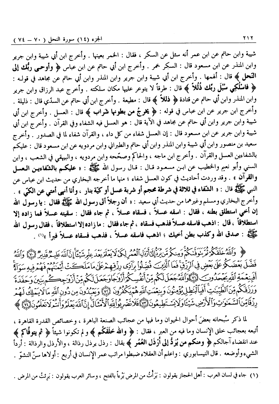 وَأَخْرَجَ ابْنُ جَرِيرٍ عَنِ ابْنِ عَبَّاسٍ فِي قَوْلِهِ: يَخْرُجُ مِنْ بُطُونِها شَرابٌ قَالَ: الْعَسَلُ. وَأَخْرَجَ ابْنُ أَبِي شَيْبَةَ وَابْنُ جَرِيرٍ وَابْنُ أَبِي حَاتِمٍ عَنْ مُجَاهِدٍ فِي الْآيَةِ قَالَ: هُوَ الْعَسَلُ فِيهِ الشِّفَاءُ وَفِي الْقُرْآنِ. وَأَخْرَجَ ابْنُ أَبِي شَيْبَةَ وَابْنُ جَرِيرٍ عَنْ ابْنِ مَسْعُودٍ قَالَ: إِنَّ الْعَسَلَ شِفَاءٌ مِنْ كُلِّ دَاءٍ، وَالْقُرْآنُ شِفَاءٌ لِمَا فِي الصُّدُورِ. وَأَخْرَجَ سَعِيدُ بْنُ مَنْصُورٍ وَابْنُ أَبِي شَيْبَةَ وَابْنُ الْمُنْذِرِ وَابْنُ أَبِي حَاتِمٍ وَالطَّبَرَانِيُّ وَابْنُ مَرْدَوَيْهِ عَنِ ابْنِ مَسْعُودٍ قَالَ: عَلَيْكُمْ بِالشِّفَاءَيْنِ الْعَسَلِ وَالْقُرْآنِ. وَأَخْرَجَ ابْنُ مَاجَهْ، وَالْحَاكِمُ وَصَحَّحَهُ وَابْنُ مَرْدَوَيْهِ، وَالْبَيْهَقِيُّ فِي الشُّعَبِ، وَابْنُ السُّنِّيِّ وَأَبُو نُعَيْمٍ وَالْخَطِيبُ عَنِ ابْنِ مَسْعُودٍ قَالَ: قَالَ رَسُولُ اللَّهِ صَلَّى اللَّهُ عَلَيْهِ وَسَلَّمَ: «عَلَيْكُمْ بِالشِّفَاءَيْنِ الْعَسَلِ وَالْقُرْآنِ» . وَقَدْ وَرَدَتْ أَحَادِيثُ فِي كَوْنِ الْعَسَلُ شِفَاءً مِنْهَا مَا أَخْرَجَهُ الْبُخَارِيُّ مِنْ حَدِيثِ ابْنِ عَبَّاسٍ عَنِ النَّبِيِّ صَلَّى اللَّهُ عَلَيْهِ وَسَلَّمَ قَالَ: «الشِّفَاءُ فِي ثَلَاثَةٍ فِي شَرْطَةِ مِحْجَمٍ أَوْ شَرْبَةِ عَسَلٍ أَوْ كَيَّةٍ بِنَارٍ، وَأَنَا أَنْهَى أُمَّتِي عَنِ الْكَيِّ» .