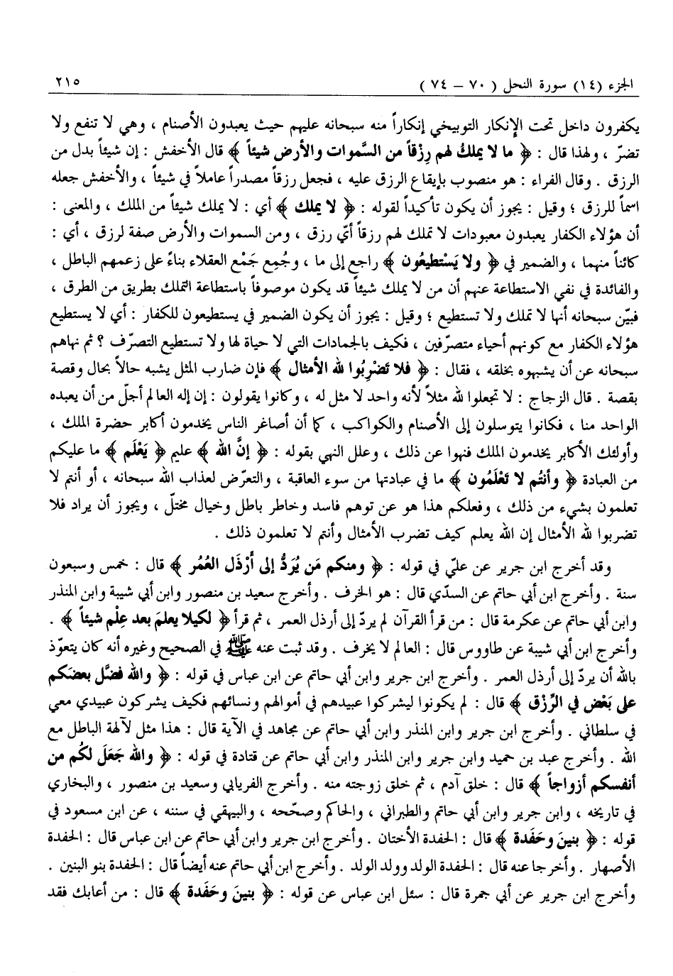 وَأَخْرَجَ ابْنُ أَبِي شَيْبَةَ عَنْ طَاوُسٍ قَالَ: الْعَالِمُ لَا يُخَرِّفُ. وَقَدْ ثَبَتَ عَنْهُ صَلَّى اللَّهُ عَلَيْهِ وَسَلَّمَ فِي الصَّحِيحِ وَغَيْرِهِ أَنَّهُ كَانَ يَتَعَوَّذُ بِاللَّهِ أَنْ يُرَدَّ إِلَى أَرْذَلِ الْعُمُرِ. وَأَخْرَجَ ابْنُ جَرِيرٍ وَابْنُ أَبِي حَاتِمٍ عَنِ ابْنِ عَبَّاسٍ فِي قَوْلِهِ: وَاللَّهُ فَضَّلَ بَعْضَكُمْ عَلى بَعْضٍ فِي الرِّزْقِ قَالَ: لَمْ يَكُونُوا لِيُشْرِكُوا عَبِيدَهُمْ فِي أَمْوَالِهِمْ وَنِسَائِهِمْ فَكَيْفَ يُشْرِكُونَ عَبِيدِي مَعِي فِي سُلْطَانِي. وَأَخْرَجَ ابْنُ جَرِيرٍ وَابْنُ الْمُنْذِرِ وَابْنُ أَبِي حَاتِمٍ عَنْ مُجَاهِدٍ فِي الْآيَةِ قَالَ: هَذَا مَثَلٌ لِآلِهَةِ الْبَاطِلِ مَعَ اللَّهِ. وَأَخْرَجَ عَبْدُ بْنُ حُمَيْدٍ وَابْنُ جَرِيرٍ وَابْنُ الْمُنْذِرِ وَابْنُ أَبِي حَاتِمٍ عَنْ قَتَادَةَ فِي قَوْلِهِ: وَاللَّهُ جَعَلَ لَكُمْ مِنْ أَنْفُسِكُمْ أَزْواجاً قَالَ: خَلَقَ آدَمَ، ثُمَّ خَلَقَ زَوْجَتَهُ مِنْهُ. وَأَخْرَجَ الْفِرْيَابِيُّ وَسَعِيدُ بْنُ مَنْصُورٍ، وَالْبُخَارِيُّ فِي تَارِيخِهِ، وَابْنُ جَرِيرٍ وَابْنُ أَبِي حَاتِمٍ وَالطَّبَرَانِيُّ، وَالْحَاكِمُ وَصَحَّحَهُ، وَالْبَيْهَقِيُّ فِي سُنَنِهِ، عَنِ ابْنِ مَسْعُودٍ فِي قَوْلِهِ: بَنِينَ وَحَفَدَةً قَالَ: الْحَفَدَةُ الْأَخْتَانُ. وَأَخْرَجَ ابْنُ جَرِيرٍ وَابْنُ أَبِي حَاتِمٍ عَنِ ابْنِ عَبَّاسٍ قَالَ: الْحَفَدَةُ الْأَصْهَارُ. وَأَخْرَجَا عَنْهُ قَالَ: الْحَفَدَةُ الْوَلَدُ وَوَلَدُ الْوَلَدِ. وَأَخْرَجَ ابْنُ أَبِي حَاتِمٍ عَنْهُ أَيْضًا قَالَ: الْحَفَدَةُ بَنُو الْبَنِينَ.