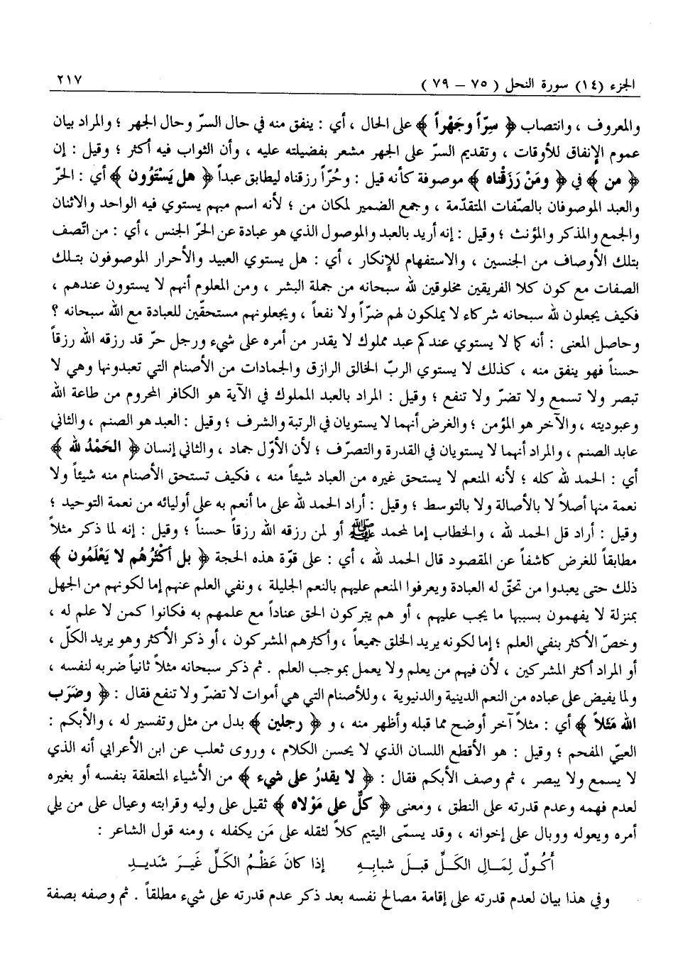 وَحَاصِلُ الْمَعْنَى: أَنَّهُ كَمَا لَا يَسْتَوِي عِنْدَكُمْ عَبْدٌ مَمْلُوكٌ لَا يَقْدِرُ مِنْ أَمْرِهِ عَلَى شَيْءٍ وَرَجُلٌ حُرٌّ قَدْ رَزَقَهُ اللَّهُ رِزْقًا حَسَنًا فَهُوَ يُنْفِقُ منه، كذلك لا يستوي الربّ الخالق الرازق وَالْجَمَادَاتُ مِنَ الْأَصْنَامِ الَّتِي تَعْبُدُونَهَا وَهِيَ لَا تُبْصِرُ وَلَا تَسْمَعُ وَلَا تَضُرُّ وَلَا تَنْفَعُ وَقِيلَ: الْمُرَادُ بِالْعَبْدِ الْمَمْلُوكِ فِي الْآيَةِ هُوَ الْكَافِرُ الْمَحْرُومُ مِنْ طَاعَةِ اللَّهِ وَعُبُودِيَّتِهِ، وَالْآخَرُ هُوَ الْمُؤْمِنُ وَالْغَرَضُ أَنَّهُمَا لَا يَسْتَوِيَانِ فِي الرُّتْبَةِ وَالشَّرَفِ وَقِيلَ: الْعَبْدُ هُوَ الصَّنَمُ، وَالثَّانِي عَابِدُ الصَّنَمِ، وَالْمُرَادُ أَنَّهُمَا لَا يَسْتَوِيَانِ فِي الْقُدْرَةِ وَالتَّصَرُّفِ لِأَنَّ الْأَوَّلَ جَمَادٌ، وَالثَّانِيَ إِنْسَانٌ الْحَمْدُ لِلَّهِ أَيِ: الْحَمْدُ لِلَّهِ كُلُّهُ لِأَنَّهُ الْمُنْعِمُ لَا يَسْتَحِقُّ غَيْرُهُ مِنِ الْعِبَادِ شَيْئًا مِنْهُ، فَكَيْفَ تَسْتَحِقُّ الْأَصْنَامُ مِنْهُ شَيْئًا وَلَا نِعْمَةَ مِنْهَا أَصْلًا لَا بِالْأَصَالَةِ وَلَا بِالتَّوَسُّطِ وَقِيلَ: أَرَادَ الْحَمْدُ لِلَّهِ عَلَى مَا أَنْعَمَ بِهِ عَلَى أَوْلِيَائِهِ مِنْ نِعْمَةِ التَّوْحِيدِ وَقِيلَ: أَرَادَ قُلِ الْحَمْدُ لِلَّهِ، وَالْخِطَابُ إِمَّا لِمُحَمَّدٍ صَلَّى اللَّهُ عَلَيْهِ وَسَلَّمَ أَوْ لِمَنْ رَزَقَهُ اللَّهُ رِزْقًا حَسَنًا وَقِيلَ: إِنَّهُ لَمَّا ذَكَرَ مَثَلًا مُطَابِقًا لِلْغَرَضِ كَاشِفًا عَنِ الْمَقْصُودِ قَالَ الْحَمْدُ لِلَّهِ، أَيْ: عَلَى قُوَّةِ هَذِهِ الْحُجَّةِ بَلْ أَكْثَرُهُمْ لَا يَعْلَمُونَ ذَلِكَ حَتَّى يَعْبُدُوا مَنْ تَحِقُّ لَهُ الْعِبَادَةُ وَيَعْرِفُوا الْمُنْعَمَ عَلَيْهِمْ بِالنِّعَمِ الْجَلِيلَةِ، وَنَفْيُ الْعِلْمِ عَنْهُمْ إِمَّا لِكَوْنِهِمْ مِنَ الْجَهْلِ بِمَنْزِلَةٍ لَا يَفْهَمُونَ بِسَبَبِهَا مَا يَجِبُ عَلَيْهِمْ، أَوْ هُمْ يَتْرُكُونَ الْحَقَّ عِنَادًا مَعَ عِلْمِهِمْ بِهِ فَكَانُوا كَمَنْ لَا عِلْمَ لَهُ، وَخَصَّ الْأَكْثَرَ بِنَفْيِ الْعِلْمِ إِمَّا لِكَوْنِهِ يُرِيدُ الْخَلْقَ جَمِيعًا، وَأَكْثَرُهُمُ الْمُشْرِكُونَ، أَوْ ذَكَرَ الْأَكْثَرَ وَهُوَ يُرِيدُ الْكُلَّ، أَوِ الْمُرَادُ أَكْثَرُ الْمُشْرِكِينَ، لِأَنَّ فِيهِمْ مَنْ يَعْلَمُ وَلَا يَعْمَلُ بِمُوجَبِ الْعِلْمِ. ثُمَّ ذَكَرَ سُبْحَانَهُ مَثَلًا ثَانِيًا ضَرَبَهُ لِنَفْسِهِ، وَلِمَا يُفِيضُ عَلَى عِبَادِهِ مِنَ النِّعَمِ الدِّينِيَّةِ وَالدُّنْيَوِيَّةِ، وَلِلْأَصْنَامِ الَّتِي هِيَ أَمْوَاتٌ لَا تَضُرُّ وَلَا تَنْفَعُ فَقَالَ: وَضَرَبَ اللَّهُ مَثَلًا أَيْ: مَثَلًا آخَرَ أَوْضَحَ مِمَّا قَبْلَهُ وأظهر منه، ورَجُلَيْنِ بَدَلٌ مِنْ مَثَلٍ وَتَفْسِيرٌ لَهُ، وَالْأَبْكَمُ: