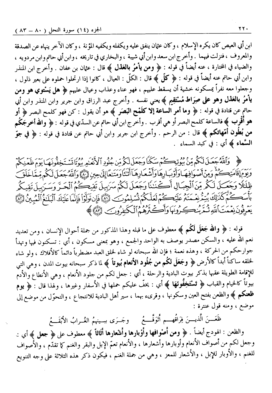 ابن أَبِي الْعِيصِ كَانَ يَكْرَهُ الْإِسْلَامَ، وَكَانَ عُثْمَانُ يُنْفِقُ عَلَيْهِ وَيَكْفُلُهُ وَيَكْفِيهِ الْمُؤْنَةَ، وَكَانَ الْآخَرُ يَنْهَاهُ عَنِ الصَّدَقَةِ وَالْمَعْرُوفِ، فَنَزَلَتْ فِيهِمَا. وَأَخْرَجَ ابْنُ سَعْدٍ وَابْنُ أَبِي شَيْبَةَ، وَالْبُخَارِيُّ فِي تَارِيخِهِ، وَابْنُ أَبِي حَاتِمٍ وَابْنُ مَرْدَوَيْهِ، وَالضِّيَاءُ فِي الْمُخْتَارَةِ، عَنْهُ أَيْضًا فِي قَوْلِهِ: وَمَنْ يَأْمُرُ بِالْعَدْلِ قَالَ: عُثْمَانُ بْنُ عَفَّانَ. وَأَخْرَجَ ابْنُ الْمُنْذِرِ وَابْنُ أَبِي حَاتِمٍ عَنْهُ أَيْضًا فِي قَوْلِهِ: كَلٌّ قَالَ: الْكَلُّ: الْعِيَالُ، كَانُوا إِذَا ارْتَحَلُوا حَمَلُوهُ عَلَى بَعِيرٍ ذَلُولٍ، وَجَعَلُوا مَعَهُ نَفَرًا يُمْسِكُونَهُ خَشْيَةَ أَنْ يَسْقُطَ عَلَيْهِمْ، فَهُوَ عَنَاءٌ وَعَذَابٌ وَعِيَالٌ عَلَيْهِمْ هَلْ يَسْتَوِي هُوَ وَمَنْ يَأْمُرُ بِالْعَدْلِ وَهُوَ عَلى صِراطٍ مُسْتَقِيمٍ يَعْنِي نَفْسَهُ. وَأَخْرَجَ عَبْدُ الرَّزَّاقِ وَابْنُ جَرِيرٍ وَابْنُ الْمُنْذِرِ وَابْنُ أَبِي حَاتِمٍ عَنْ قَتَادَةَ فِي قَوْلِهِ: وَما أَمْرُ السَّاعَةِ إِلَّا كَلَمْحِ الْبَصَرِ هُوَ أَنْ يَقُولَ: كُنْ فَهُوَ كَلَمْحِ الْبَصَرِ أَوْ هُوَ أَقْرَبُ فَالسَّاعَةُ كَلَمْحِ الْبَصَرِ أَوْ هِيَ أَقْرَبُ. وَأَخْرَجَ ابْنُ أَبِي حَاتِمٍ عَنِ السُّدِّيِّ فِي قَوْلِهِ: وَاللَّهُ أَخْرَجَكُمْ مِنْ بُطُونِ أُمَّهاتِكُمْ قَالَ: مِنَ الرَّحِمِ. وَأَخْرَجَ ابْنُ جَرِيرٍ وَابْنُ أَبِي حَاتِمٍ عَنْ قَتَادَةَ فِي قَوْلِهِ: فِي جَوِّ السَّماءِ أَيْ: فِي كبد السماء.