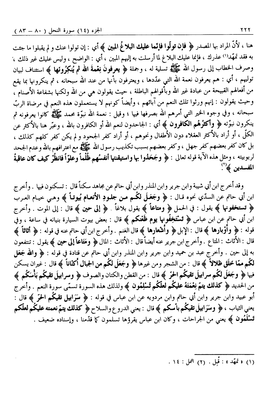 وَقَدْ أَخْرَجَ ابْنُ أَبِي شَيْبَةَ وَابْنُ جَرِيرٍ وَابْنُ الْمُنْذِرِ وَابْنُ أَبِي حَاتِمٍ عَنْ مُجَاهِدٍ سَكَنًا قَالَ: تَسْكُنُونَ فِيهَا. وَأَخْرَجَ ابْنُ أَبِي حَاتِمٍ عَنِ السُّدِّيِّ نَحْوَهُ قَالَ: وَجَعَلَ لَكُمْ مِنْ جُلُودِ الْأَنْعامِ بُيُوتاً وَهِيَ خِيَامُ الْعَرَبِ تَسْتَخِفُّونَها يَقُولُ: فِي الْحَمْلِ وَمَتاعاً يَقُولُ بَلَاغًا إِلى حِينٍ قَالَ: إِلَى الْمَوْتِ. وَأَخْرَجَ ابْنُ أَبِي حَاتِمٍ عَنِ ابْنِ عَبَّاسٍ تَسْتَخِفُّونَها يَوْمَ ظَعْنِكُمْ قَالَ: بَعْضُ بُيُوتِ السَّيَّارَةِ بُنْيَانُهُ فِي سَاعَةٍ، وَفِي قَوْلِهِ: وَأَوْبارِها قَالَ: الْإِبِلُ وَأَشْعارِها قَالَ الْغَنَمَ. وَأَخْرَجَ ابْنُ أَبِي حَاتِمٍ عَنْهُ فِي قَوْلِهِ: أَثاثاً قَالَ: الْأَثَاثُ: الْمَتَاعُ. وَأَخْرَجَ ابْنُ جَرِيرٍ عَنْهُ أَيْضًا قَالَ: الْأَثَاثُ: الْمَالُ وَمَتاعاً إِلى حِينٍ يَقُولُ: تَنْتَفِعُونَ بِهِ إِلَى حِينٍ. وَأَخْرَجَ عَبْدُ بْنُ حُمَيْدٍ وَابْنُ جَرِيرٍ وَابْنُ الْمُنْذِرِ وَابْنُ أَبِي حَاتِمٍ عَنْ قَتَادَةَ فِي قَوْلِهِ: وَاللَّهُ جَعَلَ لَكُمْ مِمَّا خَلَقَ ظِلالًا قَالَ: مِنَ الشَّجَرِ وَمِنْ غَيْرِهَا وَجَعَلَ لَكُمْ مِنَ الْجِبالِ أَكْناناً قال: غيران يُسْكَنُ فِيهَا وَجَعَلَ لَكُمْ سَرابِيلَ تَقِيكُمُ الْحَرَّ قَالَ: مِنَ الْقُطْنِ وَالْكَتَّانِ وَالصُّوفِ وَسَرابِيلَ تَقِيكُمْ بَأْسَكُمْ مِنَ الْحَدِيدِ كَذلِكَ يُتِمُّ نِعْمَتَهُ عَلَيْكُمْ لَعَلَّكُمْ تُسْلِمُونَ وَلِذَلِكَ هَذِهِ السُّورَةُ تُسَمَّى سُورَةُ النِّعَمَ. وَأَخْرَجَ أَبُو عُبَيْدٍ وَابْنُ جَرِيرٍ وَابْنُ أَبِي حَاتِمٍ وَابْنُ مَرْدَوَيْهِ عَنِ ابْنِ عَبَّاسٍ فِي قَوْلِهِ: سَرابِيلَ تَقِيكُمُ الْحَرَّ قَالَ: