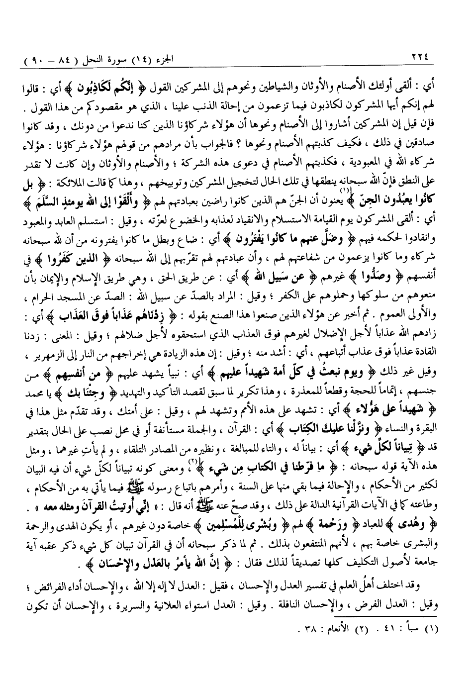 زَادَهُمُ اللَّهُ عَذَابًا لِأَجْلِ الْإِضْلَالِ لِغَيْرِهِمْ فَوْقَ الْعَذَابِ الَّذِي اسْتَحَقُّوهُ لِأَجْلِ ضَلَالِهِمْ وَقِيلَ: الْمَعْنَى: زِدْنَا الْقَادَةَ عَذَابًا فَوْقَ عَذَابِ أَتْبَاعِهِمْ، أَيْ: أَشَدَّ مِنْهُ وَقِيلَ: إِنَّ هَذِهِ الزِّيَادَةَ هِيَ إِخْرَاجُهُمْ مِنَ النَّارِ إِلَى الزَّمْهَرِيرِ، وَقِيلَ غَيْرُ ذَلِكَ وَيَوْمَ نَبْعَثُ فِي كُلِّ أُمَّةٍ شَهِيداً عَلَيْهِمْ أَيْ: نَبِيًّا يَشْهَدُ عَلَيْهِمْ مِنْ أَنْفُسِهِمْ مِنْ جِنْسِهِمْ، إِتْمَامًا لِلْحُجَّةِ وَقَطْعًا لِلْمَعْذِرَةِ، وَهَذَا تَكْرِيرٌ لِمَا سَبَقَ لِقَصْدِ التَّأْكِيدِ وَالتَّهْدِيدِ وَجِئْنا بِكَ يَا مُحَمَّدُ شَهِيداً عَلى هؤُلاءِ أَيْ: تَشْهَدُ عَلَى هَذِهِ الْأُمَمِ وَتَشْهَدُ لَهُمْ، وَقِيلَ: عَلَى أُمَّتِكَ، وَقَدْ تَقَدَّمَ مِثْلُ هَذَا فِي الْبَقَرَةِ وَالنِّسَاءِ وَنَزَّلْنا عَلَيْكَ الْكِتابَ أَيِ: الْقُرْآنَ، وَالْجُمْلَةُ مُسْتَأْنَفَةٌ أَوْ فِي مَحَلِّ نَصْبٍ عَلَى الْحَالِ بِتَقْدِيرِ قَدْ تِبْياناً لِكُلِّ شَيْءٍ أَيْ: بَيَانًا لَهُ، وَالتَّاءُ لِلْمُبَالَغَةِ، وَنَظِيرُهُ مِنَ الْمَصَادِرِ التِّلْقَاءُ، وَلَمْ يَأْتِ غَيْرُهُمَا، وَمِثْلُ هَذِهِ الْآيَةِ قَوْلُهُ سُبْحَانَهُ: ما فَرَّطْنا فِي الْكِتابِ مِنْ شَيْءٍ «2» ، وَمَعْنَى كَوْنِهِ تِبْيَانًا لِكُلِّ شَيْءٍ أَنَّ فِيهِ الْبَيَانَ لِكَثِيرٍ مِنَ الْأَحْكَامِ، وَالْإِحَالَةُ فِيمَا بَقِيَ مِنْهَا عَلَى السُّنَّةِ، وَأَمَرَهُمْ بِاتِّبَاعِ رَسُولِهِ صَلَّى اللَّهُ عَلَيْهِ وَسَلَّمَ فِيمَا يَأْتِي بِهِ مِنَ الْأَحْكَامِ، وَطَاعَتِهِ كَمَا فِي الْآيَاتِ الْقُرْآنِيَّةِ الدَّالَّةِ عَلَى ذَلِكَ، وَقَدْ صَحَّ عَنْهُ صَلَّى اللَّهُ عَلَيْهِ وَسَلَّمَ أَنَّهُ قَالَ: «إِنِّي أُوتِيتُ الْقُرْآنَ ومثله معه» .