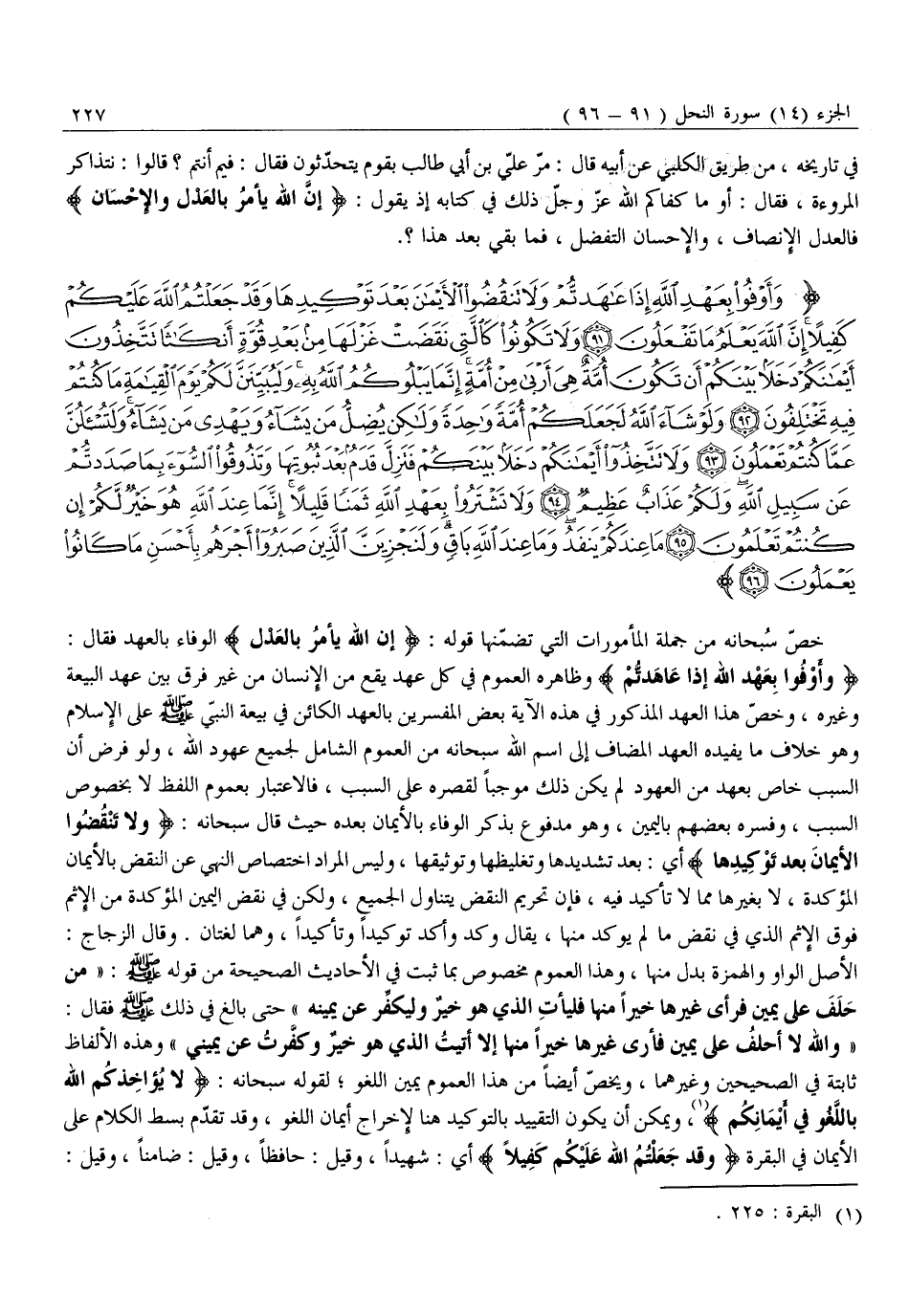 وَأَوْفُوا بِعَهْدِ اللَّهِ إِذا عاهَدْتُمْ وَلا تَنْقُضُوا الْأَيْمانَ بَعْدَ تَوْكِيدِها وَقَدْ جَعَلْتُمُ اللَّهَ عَلَيْكُمْ كَفِيلاً إِنَّ اللَّهَ يَعْلَمُ مَا تَفْعَلُونَ (91) وَلا تَكُونُوا كَالَّتِي نَقَضَتْ غَزْلَها مِنْ بَعْدِ قُوَّةٍ أَنْكاثاً تَتَّخِذُونَ أَيْمانَكُمْ دَخَلاً بَيْنَكُمْ أَنْ تَكُونَ أُمَّةٌ هِيَ أَرْبى مِنْ أُمَّةٍ إِنَّما يَبْلُوكُمُ اللَّهُ بِهِ وَلَيُبَيِّنَنَّ لَكُمْ يَوْمَ الْقِيامَةِ مَا كُنْتُمْ فِيهِ تَخْتَلِفُونَ (92) وَلَوْ شاءَ اللَّهُ لَجَعَلَكُمْ أُمَّةً واحِدَةً وَلكِنْ يُضِلُّ مَنْ يَشاءُ وَيَهْدِي مَنْ يَشاءُ وَلَتُسْئَلُنَّ عَمَّا كُنْتُمْ تَعْمَلُونَ (93) وَلا تَتَّخِذُوا أَيْمانَكُمْ دَخَلاً بَيْنَكُمْ فَتَزِلَّ قَدَمٌ بَعْدَ ثُبُوتِها وَتَذُوقُوا السُّوءَ بِما صَدَدْتُمْ عَنْ سَبِيلِ اللَّهِ وَلَكُمْ عَذابٌ عَظِيمٌ (94) وَلا تَشْتَرُوا بِعَهْدِ اللَّهِ ثَمَناً قَلِيلاً إِنَّما عِنْدَ اللَّهِ هُوَ خَيْرٌ لَكُمْ إِنْ كُنْتُمْ تَعْلَمُونَ (95)