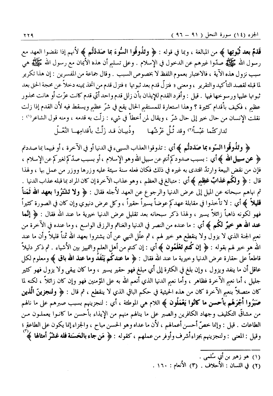 ثُمَّ نَهَاهُمْ سُبْحَانَهُ عَنِ الْمَيْلِ إِلَى عَرَضِ الدُّنْيَا وَالرُّجُوعِ عَنِ الْعَهْدِ لِأَجْلِهِ فَقَالَ: وَلا تَشْتَرُوا بِعَهْدِ اللَّهِ ثَمَناً قَلِيلًا أَيْ: لَا تَأْخُذُوا فِي مُقَابَلَةِ عَهْدِكُمْ عِوَضًا يَسِيرًا حَقِيرًا، وَكُلُّ عَرَضٍ دُنْيَوِيٍّ وَإِنْ كَانَ فِي الصُّورَةِ كَثِيرًا فَهُوَ لِكَوْنِهِ ذَاهِبًا زَائِلًا يَسِيرٌ، وَلِهَذَا ذَكَرَ سُبْحَانَهُ بَعْدَ تَقْلِيلِ عَرَضِ الدُّنْيَا خَيْرِيَّةَ مَا عِنْدَ اللَّهِ فَقَالَ: إِنَّما عِنْدَ اللَّهِ هُوَ خَيْرٌ لَكُمْ أَيْ: مَا عِنْدَهُ مِنَ النَّصْرِ فِي الدُّنْيَا وَالْغَنَائِمِ وَالرِّزْقِ الْوَاسِعِ، وَمَا عِنْدَهُ فِي الْآخِرَةِ مِنْ نَعِيمِ الْجَنَّةِ الَّذِي لَا يَزُولُ وَلَا يَنْقَطِعُ هُوَ خَيْرٌ لَهُمْ، ثُمَّ عَلَّلَ النَّهْيَ عَنْ أَنْ يَشْتَرُوا بِعَهْدِ اللَّهِ ثَمَنًا قَلِيلًا وَأَنَّ مَا عِنْدَ اللَّهِ هُوَ خَيْرٌ لَهُمْ بِقَوْلِهِ: إِنْ كُنْتُمْ تَعْلَمُونَ أَيْ: إِنْ كُنْتُمْ مِنْ أَهْلِ الْعِلْمِ وَالتَّمْيِيزِ بَيْنَ الْأَشْيَاءِ. ثُمَّ ذَكَرَ دَلِيلًا قَاطِعًا عَلَى حَقَارَةِ عَرَضِ الدُّنْيَا وَخَيْرِيَّةِ مَا عِنْدَ اللَّهِ فَقَالَ: مَا عِنْدَكُمْ يَنْفَدُ وَما عِنْدَ اللَّهِ باقٍ وَمَعْلُومٌ لِكُلِّ عَاقِلٍ أَنَّ مَا يَنْفَدُ وَيَزُولُ، وَإِنْ بَلَغَ فِي الْكَثْرَةِ إِلَى أَيِّ مَبْلَغٍ فَهُوَ حَقِيرٌ يَسِيرٌ، وَمَا كَانَ يَبْقَى وَلَا يَزُولُ فَهُوَ كَثِيرٌ جَلِيلٌ، أَمَّا نَعِيمِ الْآخِرَةِ فَظَاهِرٌ، وَأَمَّا نَعِيِمُ الدُّنْيَا الَّذِي أَنْعَمَ اللَّهُ بِهِ عَلَى الْمُؤْمِنِينَ فَهُوَ وَإِنْ كَانَ زَائِلًا، لَكِنَّهُ لَمَّا كَانَ مُتَّصِلًا بِنَعِيمِ الْآخِرَةِ كَانَ مِنْ هَذِهِ الْحَيْثِيَّةِ فِي حُكْمِ الْبَاقِي الَّذِي لَا يَنْقَطِعُ، ثُمَّ قَالَ: وَلَنَجْزِيَنَّ الَّذِينَ صَبَرُوا أَجْرَهُمْ بِأَحْسَنِ مَا كانُوا يَعْمَلُونَ اللَّامُ هِيَ الْمُوَطِّئَةُ، أَيْ: لَنَجْزِيَنَّهُمْ بِسَبَبِ صَبْرِهِمْ عَلَى مَا نَالَهُمْ مِنْ مَشَاقِّ التَّكْلِيفِ وَجِهَادِ الْكَافِرِينَ وَالصَّبْرِ عَلَى مَا يَنَالُهُمْ مِنْهُمْ مِنَ الْإِيذَاءِ بِأَحْسَنِ مَا كَانُوا يَعْمَلُونَ مِنَ الطَّاعَاتِ. قِيلَ: وَإِنَّمَا خَصَّ أَحْسَنَ أَعْمَالِهِمْ، لِأَنَّ مَا عَدَاهُ وَهُوَ الْحَسَنُ مُبَاحٌ، وَالْجَزَاءُ إِنَّمَا يَكُونُ عَلَى الطَّاعَةِ وَقِيلَ: الْمَعْنَى: وَلَنَجْزِيَنَّهُمْ بِجَزَاءٍ أَشْرَفَ وَأَوْفَرَ مِنْ عَمَلِهِمْ، كَقَوْلِهِ: مَنْ جاءَ بِالْحَسَنَةِ فَلَهُ عَشْرُ أَمْثالِها «3»
