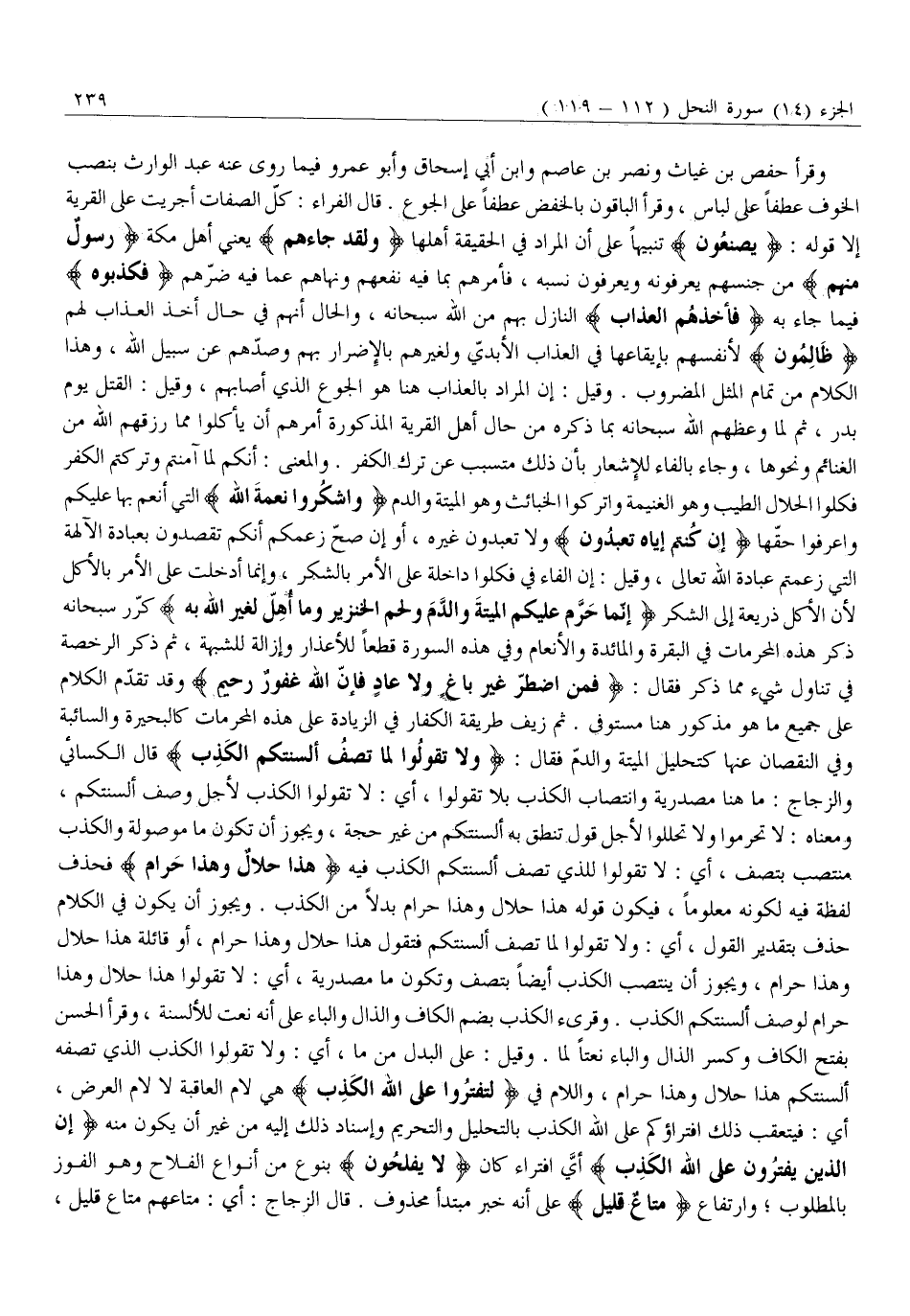 وَقَرَأَ حَفْصُ بْنُ غِيَاثٍ وَنَصْرُ بْنُ عَاصِمٍ وَابْنُ أَبِي إِسْحَاقَ وَأَبُو عَمْرٍو فِيمَا رَوَى عَنْهُ عَبْدُ الْوَارِثِ بِنَصْبِ الْخَوْفِ عَطْفًا عَلَى لباس، وقرأ الباقون بالخفض عَطْفًا عَلَى الْجُوعِ. قَالَ الْفَرَّاءُ: كُلُّ الصِّفَاتِ أُجْرِيَتْ عَلَى الْقَرْيَةِ إِلَّا قَوْلَهُ: يَصْنَعُونَ تَنْبِيهًا عَلَى أَنَّ الْمُرَادَ فِي الْحَقِيقَةِ أَهْلُهَا وَلَقَدْ جاءَهُمْ يَعْنِي أَهْلَ مَكَّةَ رَسُولٌ مِنْهُمْ مِنْ جِنْسِهِمْ يَعْرِفُونَهُ وَيَعْرِفُونَ نَسَبَهُ، فَأَمَرَهُمْ بِمَا فِيهِ نَفْعُهُمْ وَنَهَاهُمْ عَمَّا فِيهِ ضُرُّهُمْ فَكَذَّبُوهُ فِيمَا جَاءَ بِهِ فَأَخَذَهُمُ الْعَذابُ النَّازِلُ بِهِمْ مِنَ اللَّهِ سُبْحَانَهُ، وَالْحَالُ أَنَّهُمْ فِي حَالِ أَخْذِ الْعَذَابِ لَهُمْ ظالِمُونَ لِأَنْفُسِهِمْ بِإِيقَاعِهَا فِي الْعَذَابِ الْأَبَدِيِّ وَلِغَيْرِهِمْ بِالْإِضْرَارِ بِهِمْ وَصَدِّهِمْ عَنْ سَبِيلِ اللَّهِ، وَهَذَا الْكَلَامُ مِنْ تَمَامِ الْمَثَلِ الْمَضْرُوبِ. وَقِيلَ: إِنَّ الْمُرَادَ بِالْعَذَابِ هُنَا هُوَ الْجُوعُ الَّذِي أَصَابَهُمْ، وَقِيلَ: الْقَتْلُ يَوْمَ بَدْرٍ، ثُمَّ لَمَّا وَعَظَهُمُ اللَّهُ سُبْحَانَهُ بِمَا ذَكَرَهُ مِنْ حَالِ أَهْلِ الْقَرْيَةِ الْمَذْكُورَةِ أَمَرَهُمْ أَنْ يَأْكُلُوا مِمَّا رَزَقَهُمُ اللَّهُ مِنَ الْغَنَائِمِ وَنَحْوِهَا، وَجَاءَ بِالْفَاءِ لِلْإِشْعَارِ بِأَنَّ ذَلِكَ مُتَسَبِّبٌ عَنْ تَرْكِ الْكُفْرِ. وَالْمَعْنَى: أَنَّكُمْ لَمَّا آمَنْتُمْ وَتَرَكْتُمُ الْكُفْرَ فَكُلُوا الْحَلَالَ الطَّيِّبَ وَهُوَ الْغَنِيمَةُ وَاتْرُكُوا الْخَبَائِثَ وهو الميتة والدم وَاشْكُرُوا نِعْمَتَ اللَّهِ الَّتِي أَنْعَمَ بِهَا عَلَيْكُمْ وَاعْرِفُوا حَقَّهَا إِنْ كُنْتُمْ إِيَّاهُ تَعْبُدُونَ وَلَا تَعْبُدُونَ غَيْرَهُ، أَوْ إِنْ صَحَّ زَعْمُكُمْ أَنَّكُمْ تَقْصِدُونَ بِعِبَادَةِ الْآلِهَةِ الَّتِي زَعَمْتُمْ عِبَادَةَ اللَّهِ تَعَالَى، وَقِيلَ: إِنَّ الْفَاءَ فِي فَكُلُوا دَاخِلَةٌ عَلَى الْأَمْرِ بِالشُّكْرِ، وَإِنَّمَا أُدْخِلَتْ عَلَى الْأَمْرِ بِالْأَكْلِ لِأَنَّ الْأَكْلَ ذَرِيعَةٌ إِلَى الشُّكْرِ إِنَّما حَرَّمَ عَلَيْكُمُ الْمَيْتَةَ وَالدَّمَ وَلَحْمَ الْخِنْزِيرِ وَما أُهِلَّ لِغَيْرِ اللَّهِ بِهِ كَرَّرَ سُبْحَانَهُ ذِكْرَ هَذِهِ الْمُحَرَّمَاتِ فِي الْبَقَرَةِ وَالْمَائِدَةِ وَالْأَنْعَامِ وَفِي هَذِهِ السُّورَةِ قَطْعًا لِلْأَعْذَارِ وَإِزَالَةً لِلشُّبْهَةِ، ثُمَّ ذَكَرَ الرُّخْصَةَ فِي تَنَاوُلِ شَيْءٍ مِمَّا ذَكَرَ فَقَالَ: فَمَنِ اضْطُرَّ غَيْرَ باغٍ وَلا عادٍ فَإِنَّ اللَّهَ غَفُورٌ رَحِيمٌ وَقَدْ تَقَدَّمَ الْكَلَامُ عَلَى جَمِيعِ مَا هُوَ مَذْكُورٌ هُنَا مُسْتَوْفًى. ثُمَّ زَيَّفَ طَرِيقَةَ الْكُفَّارِ فِي الزِّيَادَةِ عَلَى هَذِهِ الْمُحَرَّمَاتِ كَالْبَحِيرَةِ وَالسَّائِبَةِ وَفِي النُّقْصَانِ عَنْهَا كَتَحْلِيلِ الْمَيْتَةِ وَالدَّمِ فَقَالَ: وَلا تَقُولُوا لِما تَصِفُ أَلْسِنَتُكُمُ الْكَذِبَ قَالَ الْكِسَائِيُّ وَالزَّجَّاجُ: مَا هُنَا مَصْدَرِيَّةٌ وَانْتِصَابُ الْكَذِبَ بلا تَقُولُوا، أَيْ: لَا تَقُولُوا الْكَذِبَ لِأَجْلِ وَصْفِ أَلْسِنَتِكُمْ، وَمَعْنَاهُ: لَا تُحَرِّمُوا وَلَا تُحَلِّلُوا لِأَجْلِ قَوْلٍ تَنْطِقُ بِهِ أَلْسِنَتُكُمْ مِنْ غَيْرِ حُجَّةٍ، ويجوز أن تكون ما موصولة والكذب منتصب بتصف، أَيْ: لَا تَقُولُوا لِلَّذِي تَصِفُ أَلْسِنَتُكُمُ الْكَذِبَ فِيهِ هَذَا حَلالٌ وَهذا حَرامٌ فَحَذَفَ لَفْظَةَ فِيهِ لِكَوْنِهِ مَعْلُومًا، فَيَكُونُ قَوْلُهُ هَذَا حَلَالٌ وَهَذَا حَرَامٌ بَدَلًا مِنَ الْكَذِبَ. وَيَجُوزُ أَنْ يَكُونَ فِي الْكَلَامِ حَذْفٌ بِتَقْدِيرِ ا