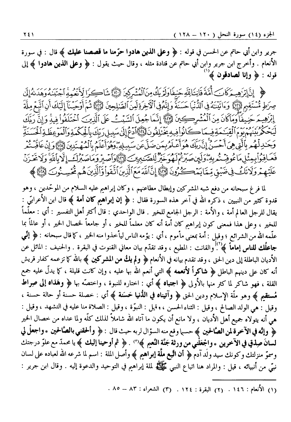 إِنَّ إِبْراهِيمَ كانَ أُمَّةً قانِتاً لِلَّهِ حَنِيفاً وَلَمْ يَكُ مِنَ الْمُشْرِكِينَ (120) شاكِراً لِأَنْعُمِهِ اجْتَباهُ وَهَداهُ إِلى صِراطٍ مُسْتَقِيمٍ (121) وَآتَيْناهُ فِي الدُّنْيا حَسَنَةً وَإِنَّهُ فِي الْآخِرَةِ لَمِنَ الصَّالِحِينَ (122) ثُمَّ أَوْحَيْنا إِلَيْكَ أَنِ اتَّبِعْ مِلَّةَ إِبْراهِيمَ حَنِيفاً وَما كانَ مِنَ الْمُشْرِكِينَ (123) إِنَّما جُعِلَ السَّبْتُ عَلَى الَّذِينَ اخْتَلَفُوا فِيهِ وَإِنَّ رَبَّكَ لَيَحْكُمُ بَيْنَهُمْ يَوْمَ الْقِيامَةِ فِيما كانُوا فِيهِ يَخْتَلِفُونَ (124)