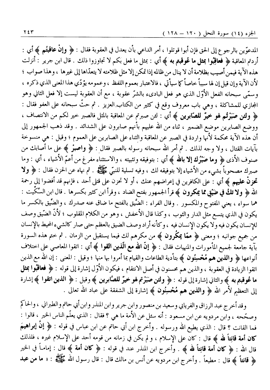 وَلَئِنْ صَبَرْتُمْ لَهُوَ خَيْرٌ لِلصَّابِرِينَ أَيْ: لَئِنْ صَبَرْتُمْ عَنِ الْمُعَاقَبَةِ بِالْمَثَلِ فَالصَّبْرُ خَيْرٌ لَكُمْ مِنَ الِانْتِصَافِ، وَوُضِعَ الصَّابِرِينَ مَوْضِعَ الضَّمِيرِ، ثَنَاءً مِنَ اللَّهِ عَلَيْهِمْ بِأَنَّهُمْ صَابِرُونَ عَلَى الشَّدَائِدِ. وَقَدْ ذَهَبَ الْجُمْهُورُ إِلَى أَنَّ هَذِهِ الْآيَةَ مُحْكَمَةٌ لِأَنَّهَا وَارِدَةٌ فِي الصَّبْرِ عَنِ الْمُعَاقَبَةِ وَالثَّنَاءِ عَلَى الصَّابِرِينَ عَلَى الْعُمُومِ وَقِيلَ: هِيَ مَنْسُوخَةٌ بِآيَاتِ الْقِتَالِ، وَلَا وَجْهَ لِذَلِكَ. ثُمَّ أَمَرَ اللَّهُ سُبْحَانَهُ رَسُولَهُ بِالصَّبْرِ فَقَالَ: وَاصْبِرْ عَلَى مَا أَصَابَكَ مِنْ صُنُوفِ الْأَذَى وَما صَبْرُكَ إِلَّا بِاللَّهِ أَيْ: بِتَوْفِيقِهِ وَتَثْبِيتِهِ، وَالِاسْتِثْنَاءُ مُفَرَّغٌ مِنْ أَعَمِّ الْأَشْيَاءِ، أَيْ: وَمَا صَبْرُكَ مَصْحُوبًا بِشَيْءٍ مِنَ الْأَشْيَاءِ إِلَّا بِتَوْفِيقِهِ لَكَ، وَفِيهِ تَسْلِيَةٌ لِلنَّبِيِّ صَلَّى اللَّهُ عَلَيْهِ وَسَلَّمَ. ثُمَّ نَهَاهُ عَنِ الْحُزْنِ فَقَالَ: وَلا تَحْزَنْ عَلَيْهِمْ أَيْ: عَلَى الْكَافِرِينَ فِي إِعْرَاضِهِمْ عَنْكَ، أَوْ لَا تَحْزَنْ عَلَى قَتْلَى أُحُدٍ، فَإِنَّهُمْ قَدْ أَفْضَوْا إِلَى رَحْمَةِ اللَّهِ وَلا تَكُ فِي ضَيْقٍ مِمَّا يَمْكُرُونَ قَرَأَ الْجُمْهُورُ بِفَتْحِ الضَّادِ، وَقَرَأَ ابْنُ كَثِيرٍ بِكَسْرِهَا. قَالَ ابْنُ السِّكِّيتِ: