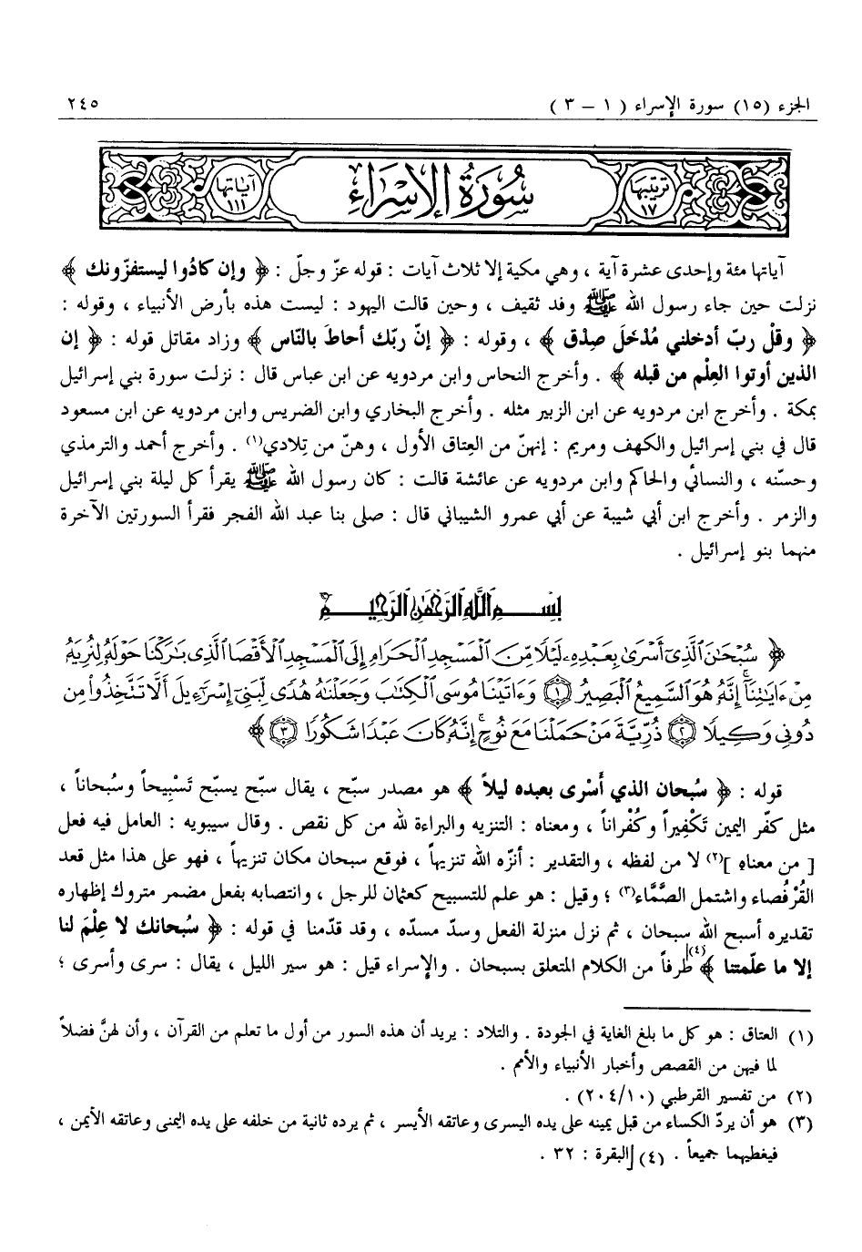 سُبْحانَ الَّذِي أَسْرى بِعَبْدِهِ لَيْلاً مِنَ الْمَسْجِدِ الْحَرامِ إِلَى الْمَسْجِدِ الْأَقْصَى الَّذِي بارَكْنا حَوْلَهُ لِنُرِيَهُ مِنْ آياتِنا إِنَّهُ هُوَ السَّمِيعُ الْبَصِيرُ (1) وَآتَيْنا مُوسَى الْكِتابَ وَجَعَلْناهُ هُدىً لِبَنِي إِسْرائِيلَ أَلاَّ تَتَّخِذُوا مِنْ دُونِي وَكِيلاً (2) ذُرِّيَّةَ مَنْ حَمَلْنا مَعَ نُوحٍ إِنَّهُ كانَ عَبْداً شَكُوراً (3)